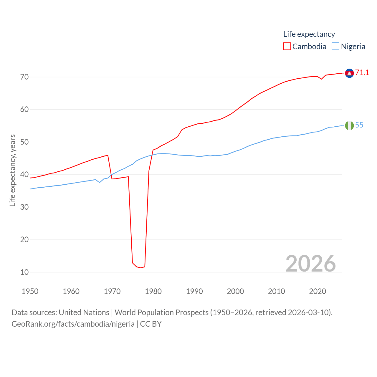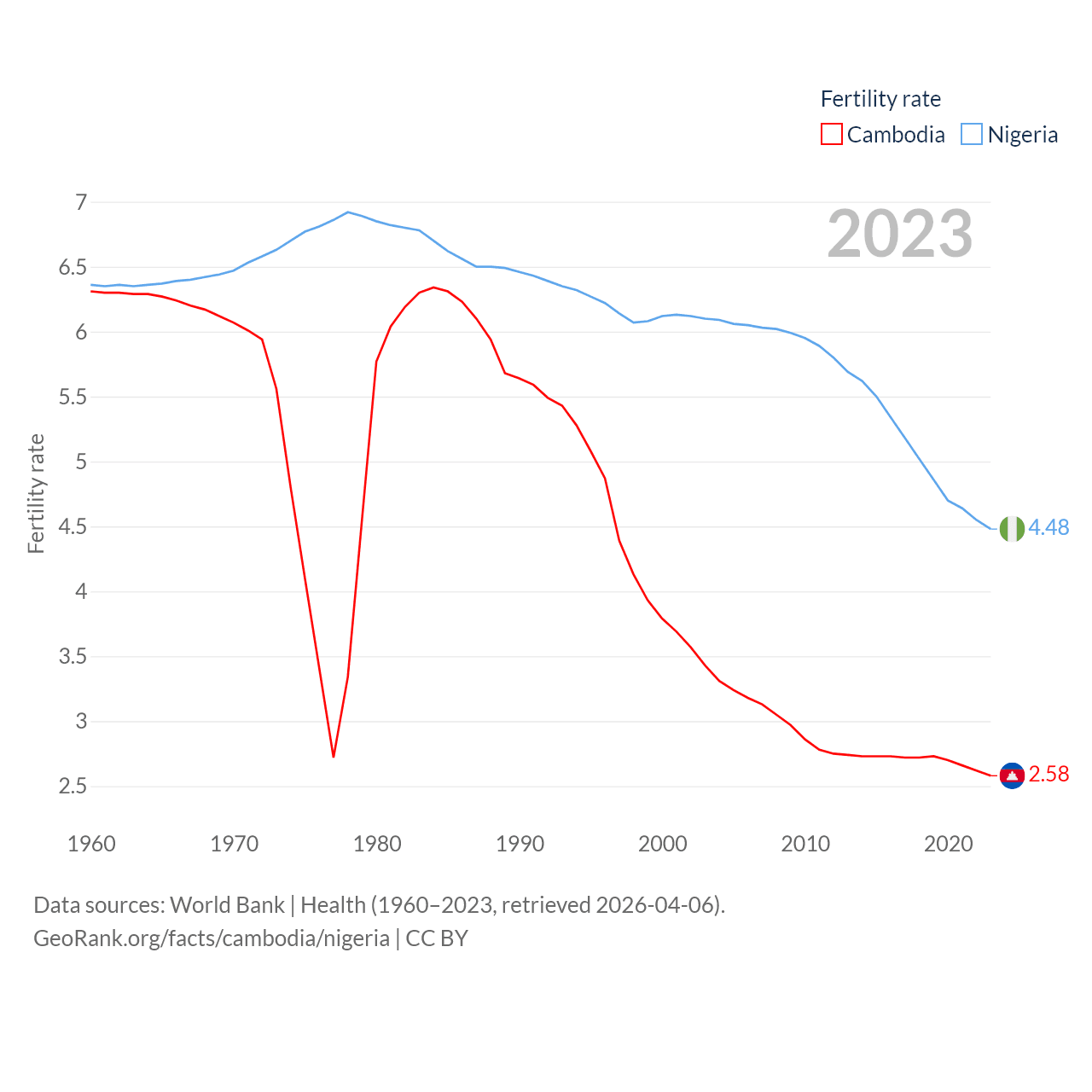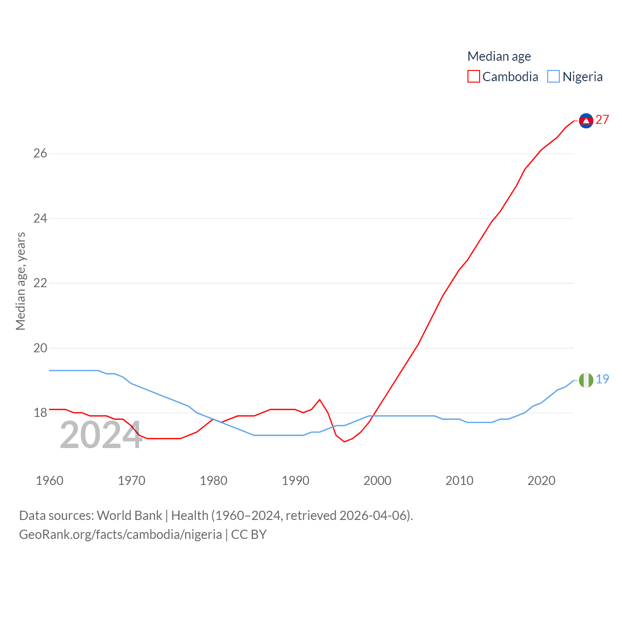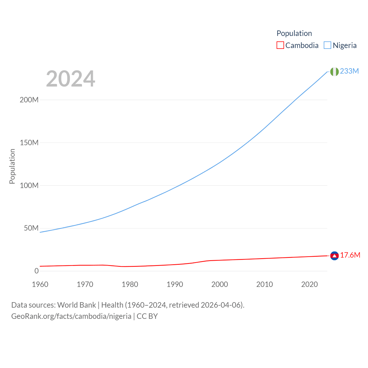 Cambodia has a population of 17.6M (ranked 73/197), compared with 233M in Nigeria (ranked 6/197). Cambodia's land area is 68,155 sq mi versus 351,650 sq mi for Nigeria (ranked 88th vs. 30th).