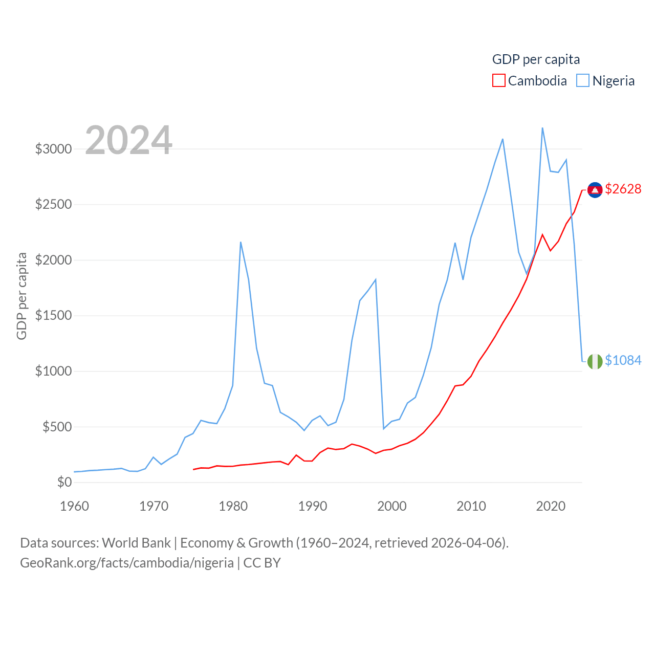 By GDP, Cambodia ranks 97/197 ($46.4B) and Nigeria ranks 54/197 ($252B). By GDP per capita, Cambodia ranks 145/197 ($2,628), while Nigeria ranks 174/197 ($1,084).