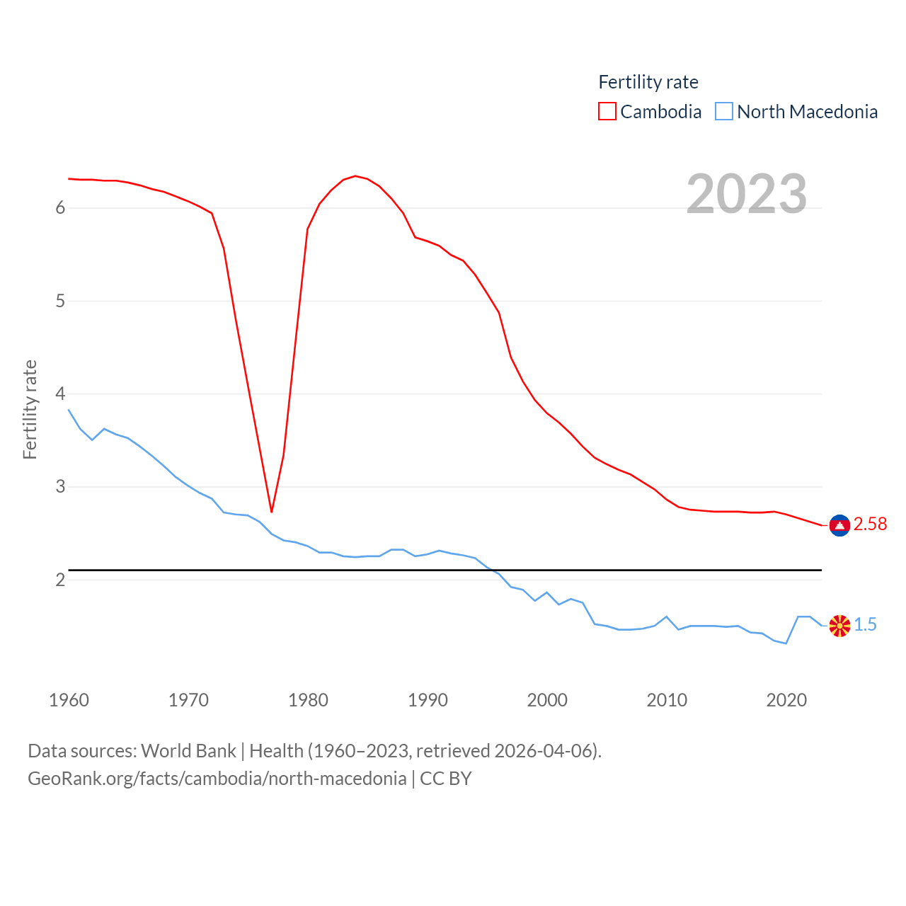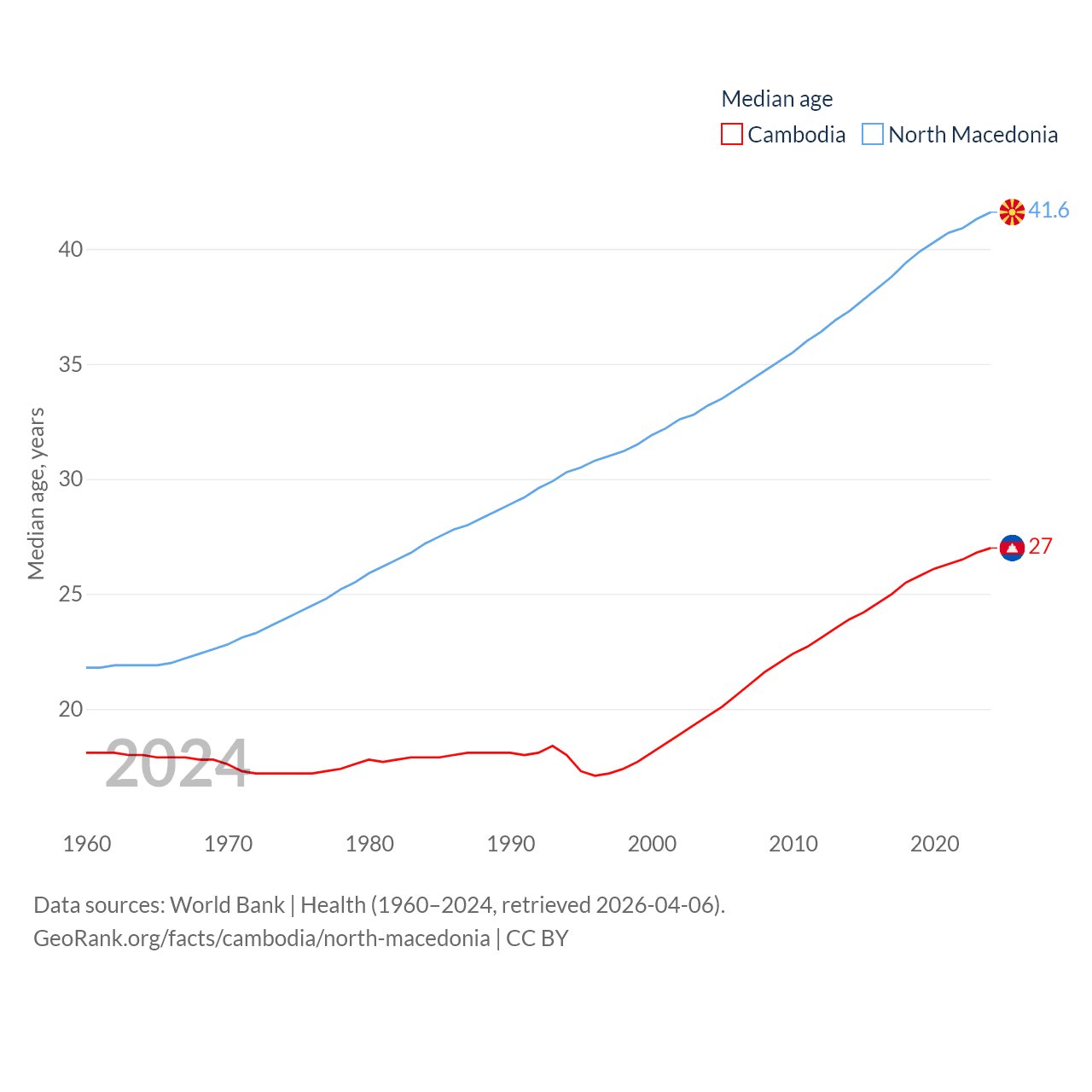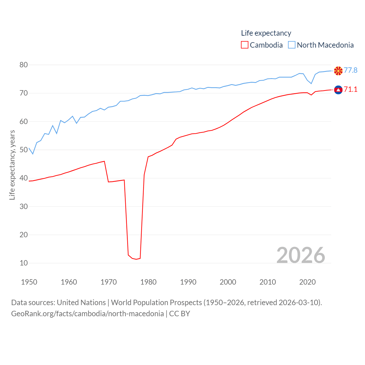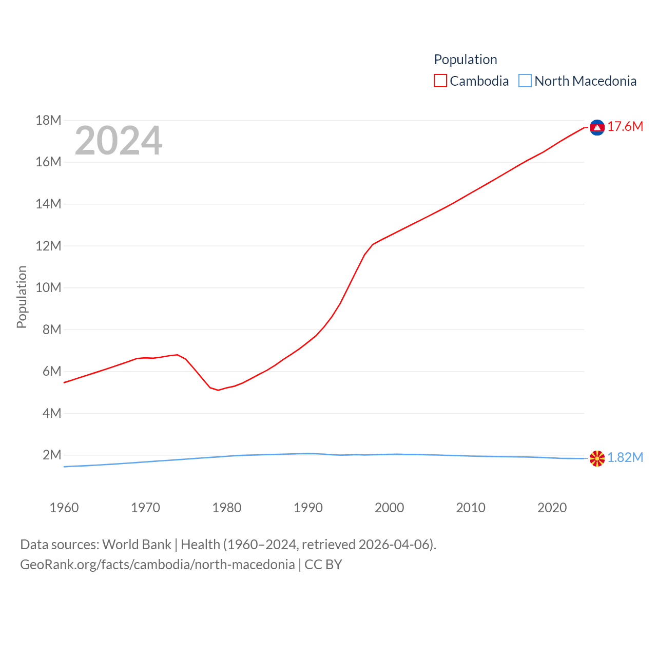 Cambodia has a population of 17.6M (ranked 73/197), compared with 1.82M in North Macedonia (ranked 150/197). Cambodia's land area is 68,155 sq mi versus 9,737 sq mi for North Macedonia (ranked 88th vs. 145th).