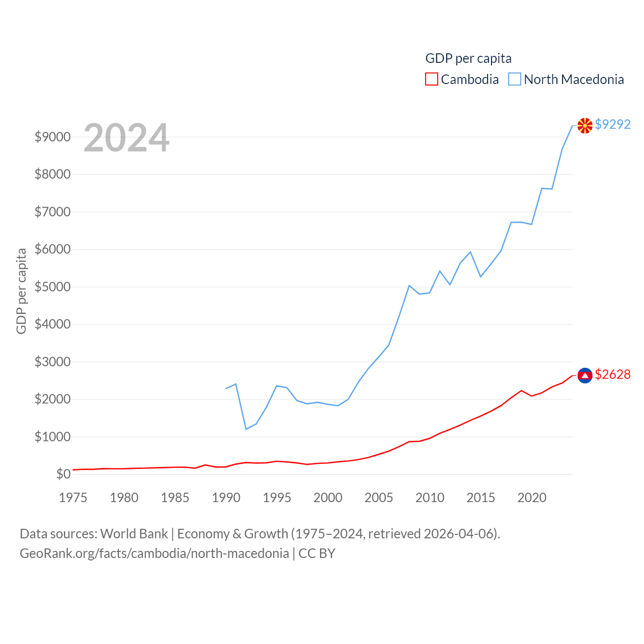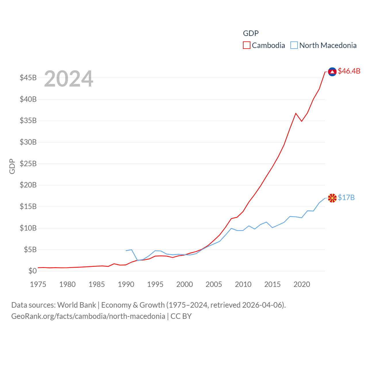 By GDP, Cambodia ranks 97/197 ($46.4B) and North Macedonia ranks 138/197 ($17B). By GDP per capita, Cambodia ranks 145/197 ($2,628), while North Macedonia ranks 88/197 ($9,292).