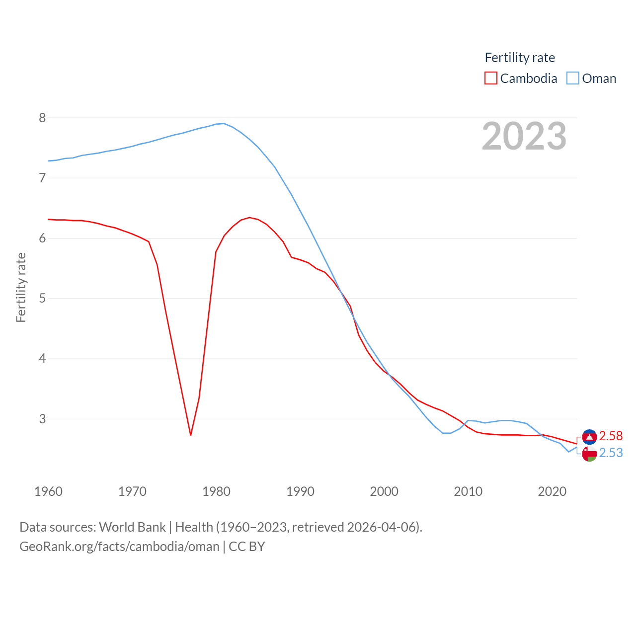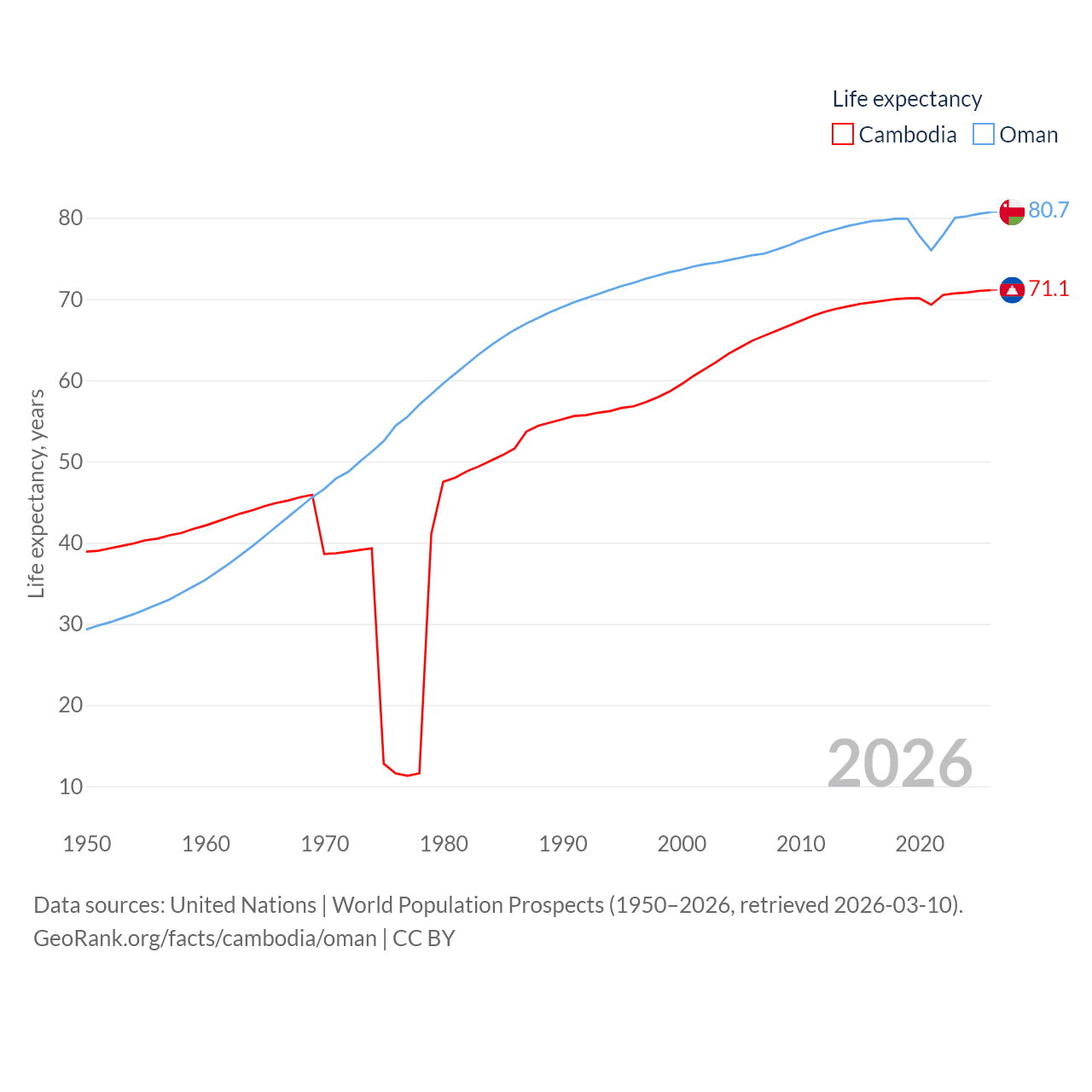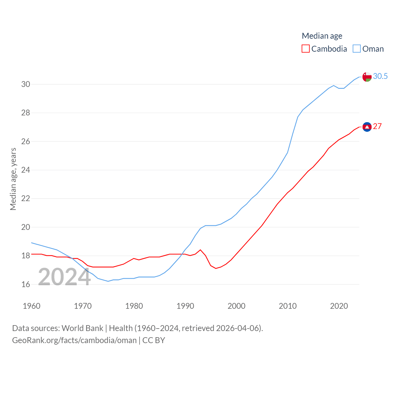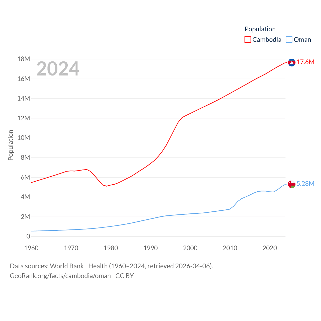 Cambodia has a population of 17.6M (ranked 73/197), compared with 5.28M in Oman (ranked 124/197). Cambodia's land area is 68,155 sq mi versus 119,499 sq mi for Oman (ranked 88th vs. 68th).