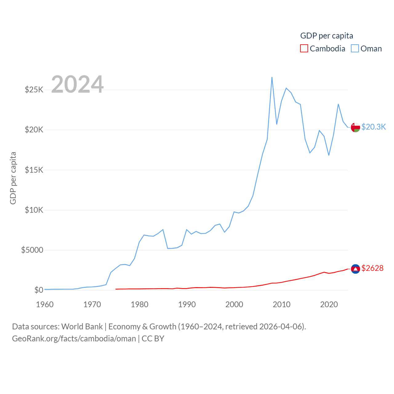 By GDP, Cambodia ranks 97/197 ($46.4B) and Oman ranks 70/197 ($107B). By GDP per capita, Cambodia ranks 145/197 ($2,628), while Oman ranks 57/197 ($20,285).
