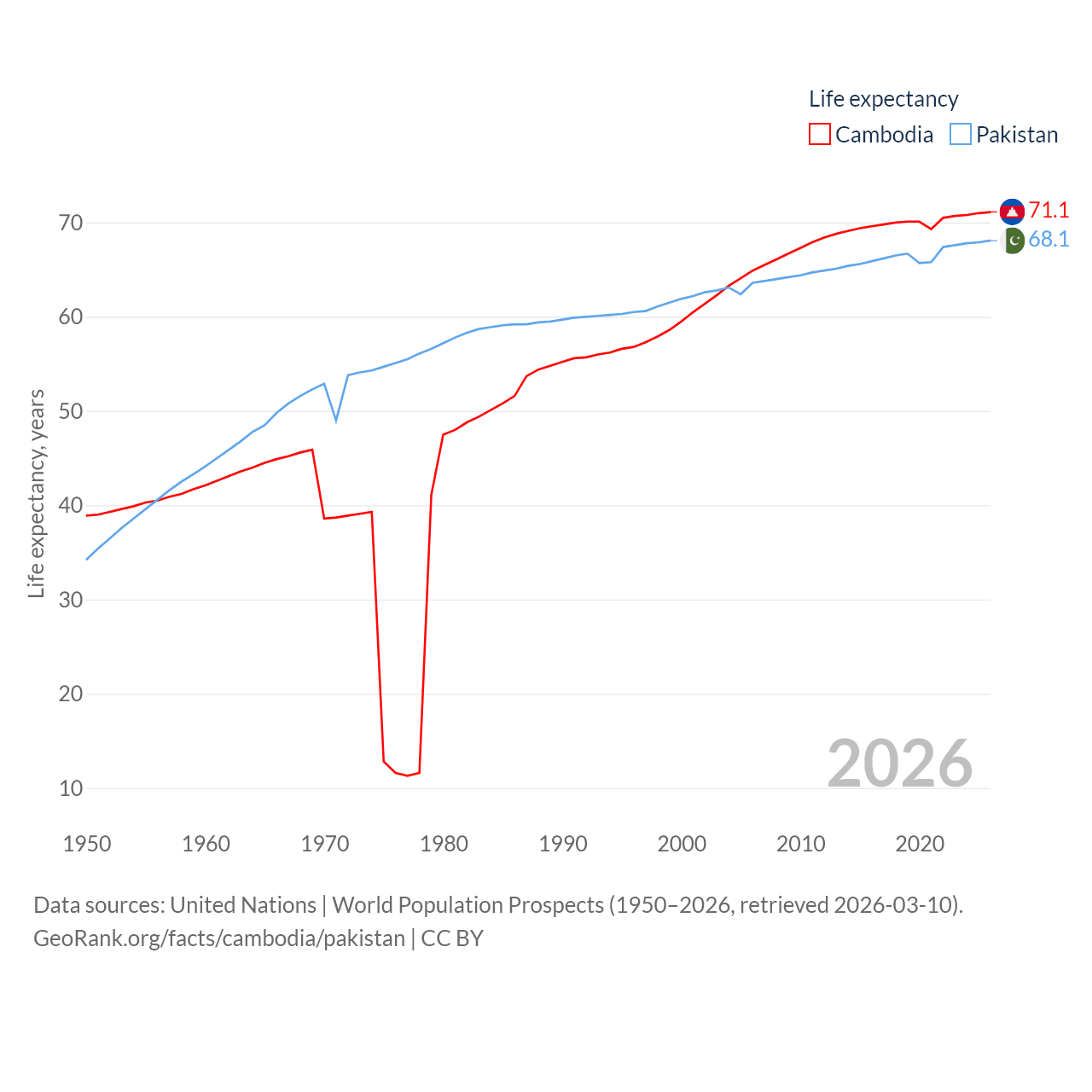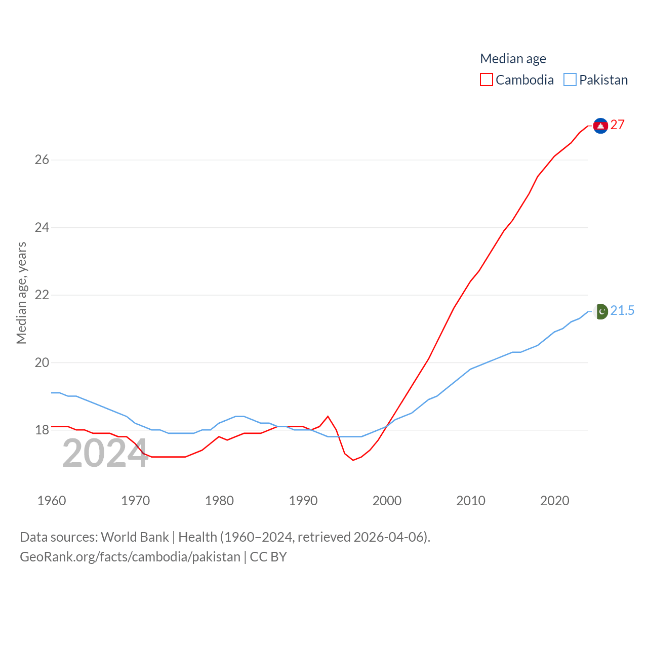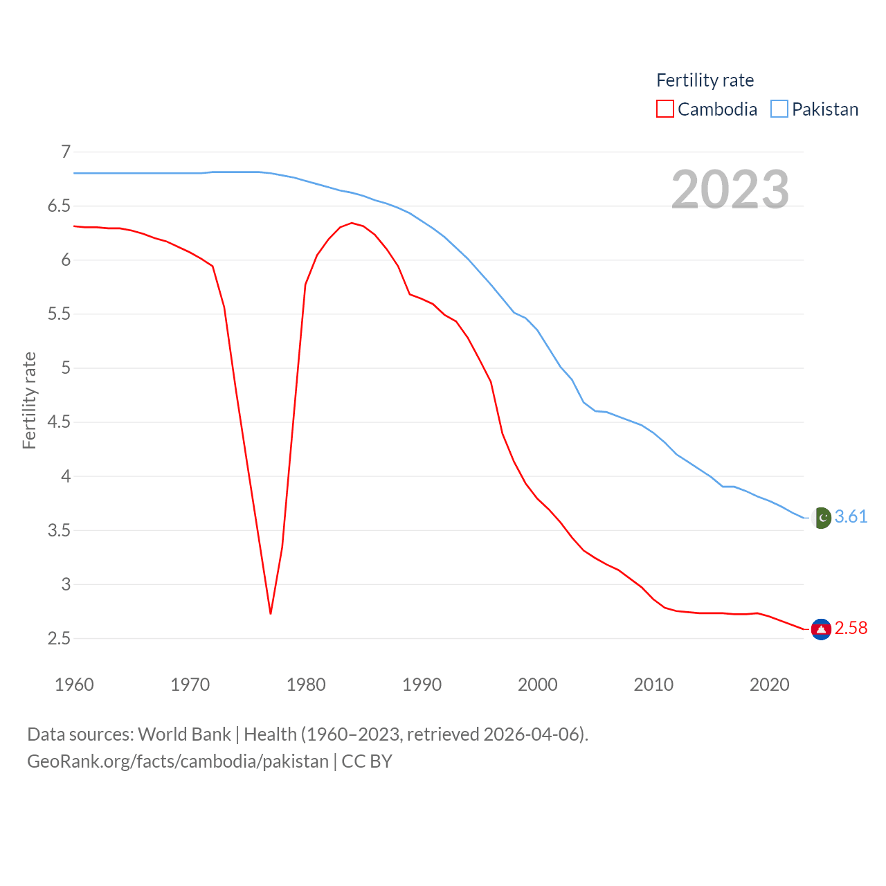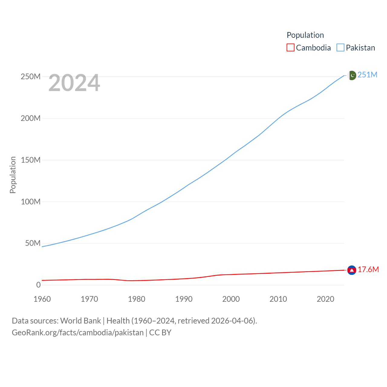Cambodia has a population of 17.6M (ranked 73/197), compared with 251M in Pakistan (ranked 5/197). Cambodia's land area is 68,155 sq mi versus 297,638 sq mi for Pakistan (ranked 88th vs. 35th).