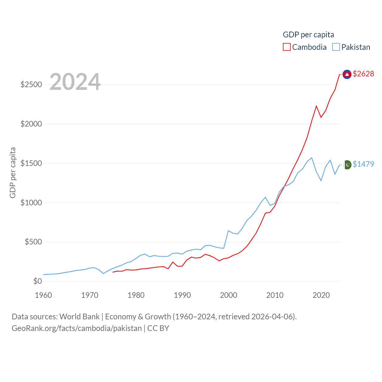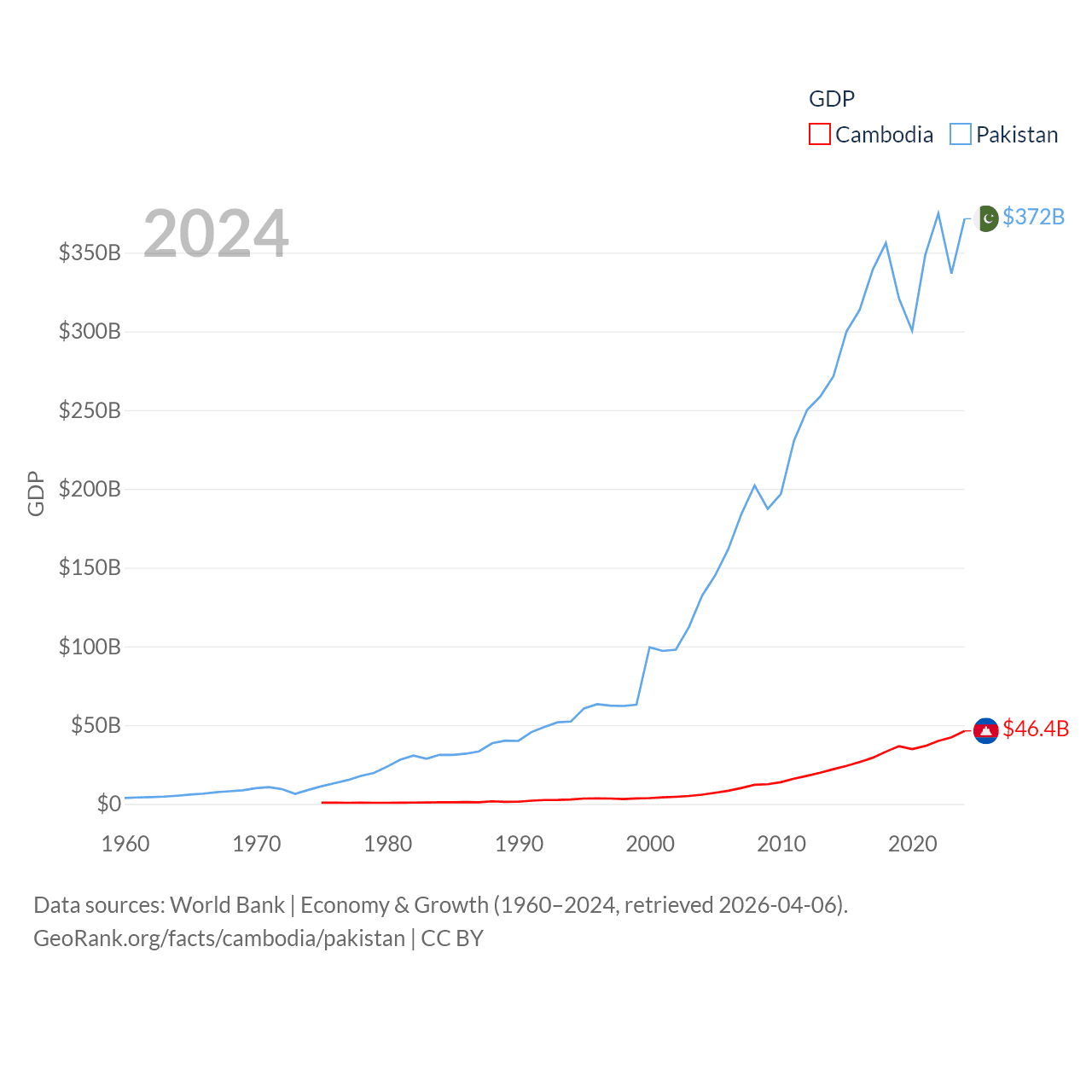 By GDP, Cambodia ranks 97/197 ($46.4B) and Pakistan ranks 43/197 ($372B). By GDP per capita, Cambodia ranks 145/197 ($2,628), while Pakistan ranks 163/197 ($1,479).