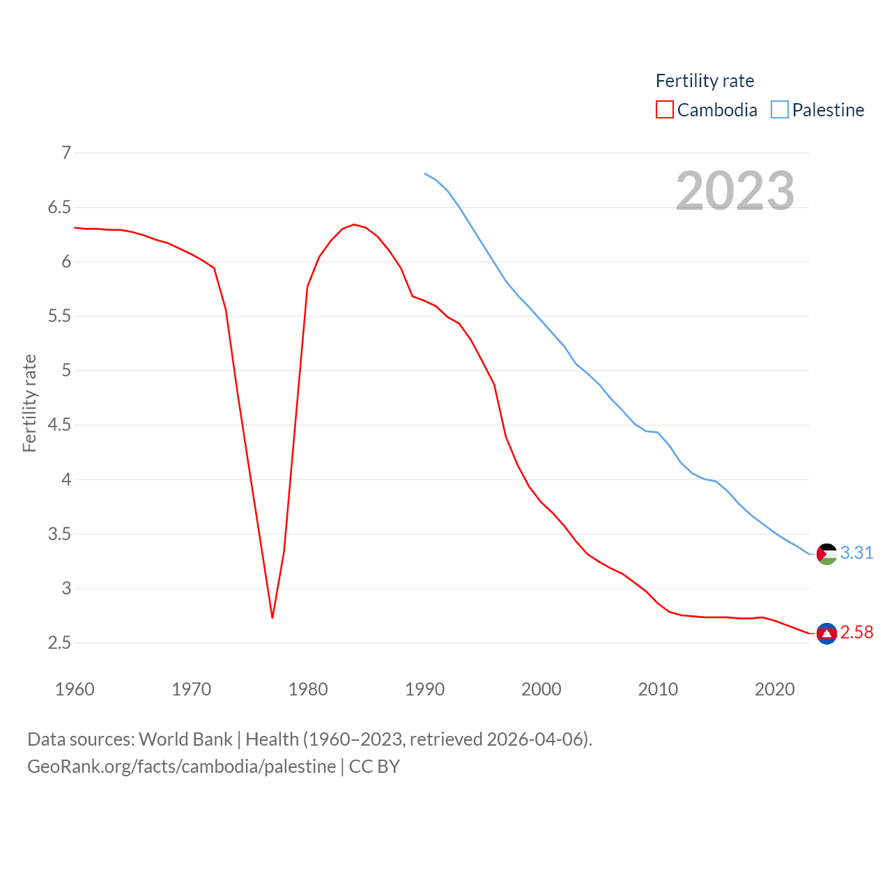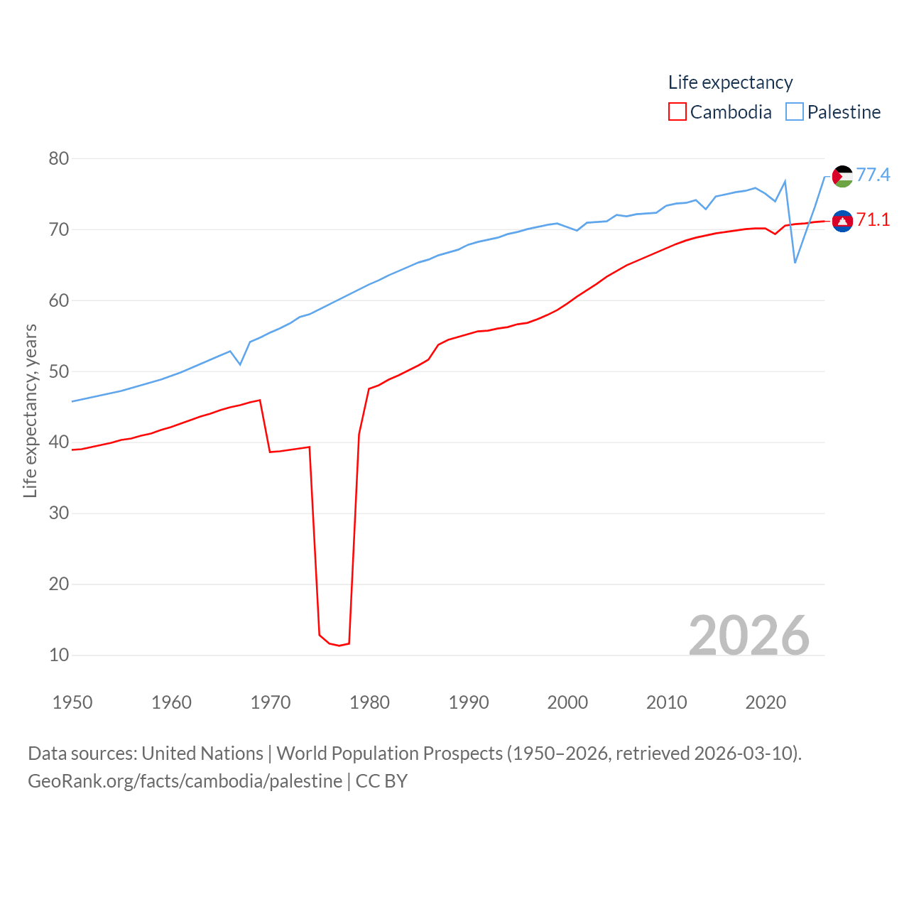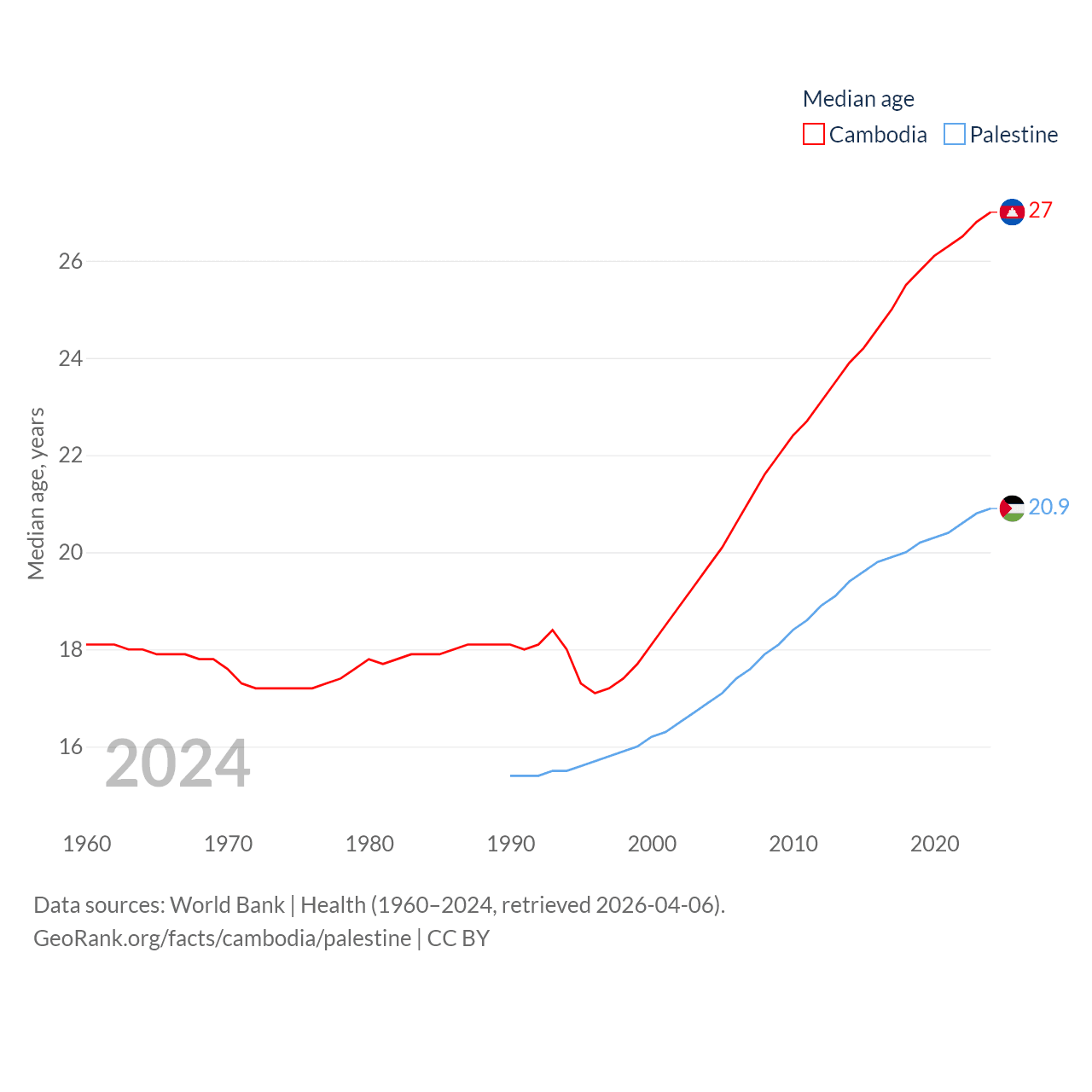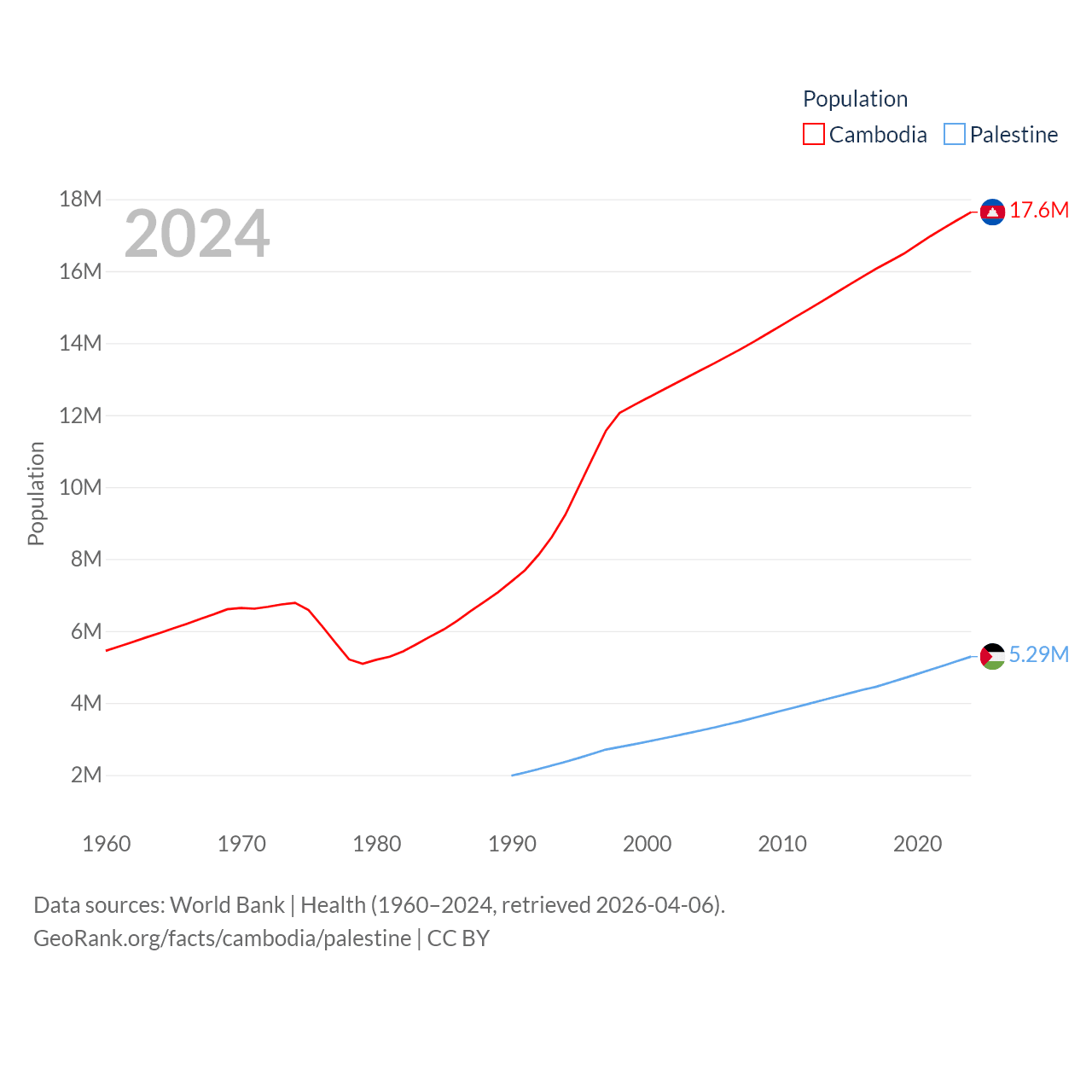 Cambodia has a population of 17.6M (ranked 73/197), compared with 5.29M in Palestine (ranked 122/197). Cambodia's land area is 68,155 sq mi versus 2,326 sq mi for Palestine (ranked 88th vs. 164th).