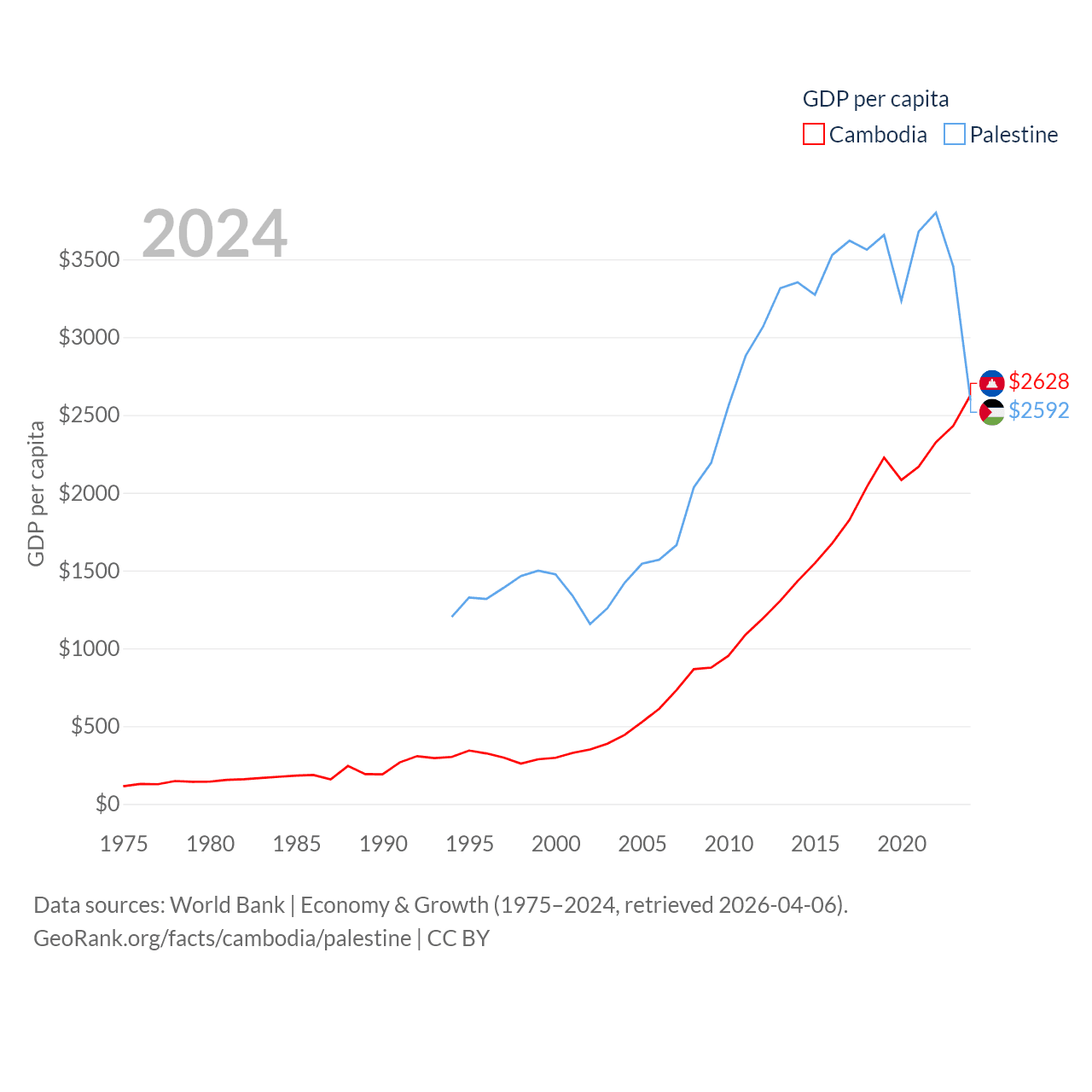 By GDP, Cambodia ranks 97/197 ($46.4B) and Palestine ranks 146/197 ($13.7B). By GDP per capita, Cambodia ranks 145/197 ($2,628), while Palestine ranks 147/197 ($2,592).