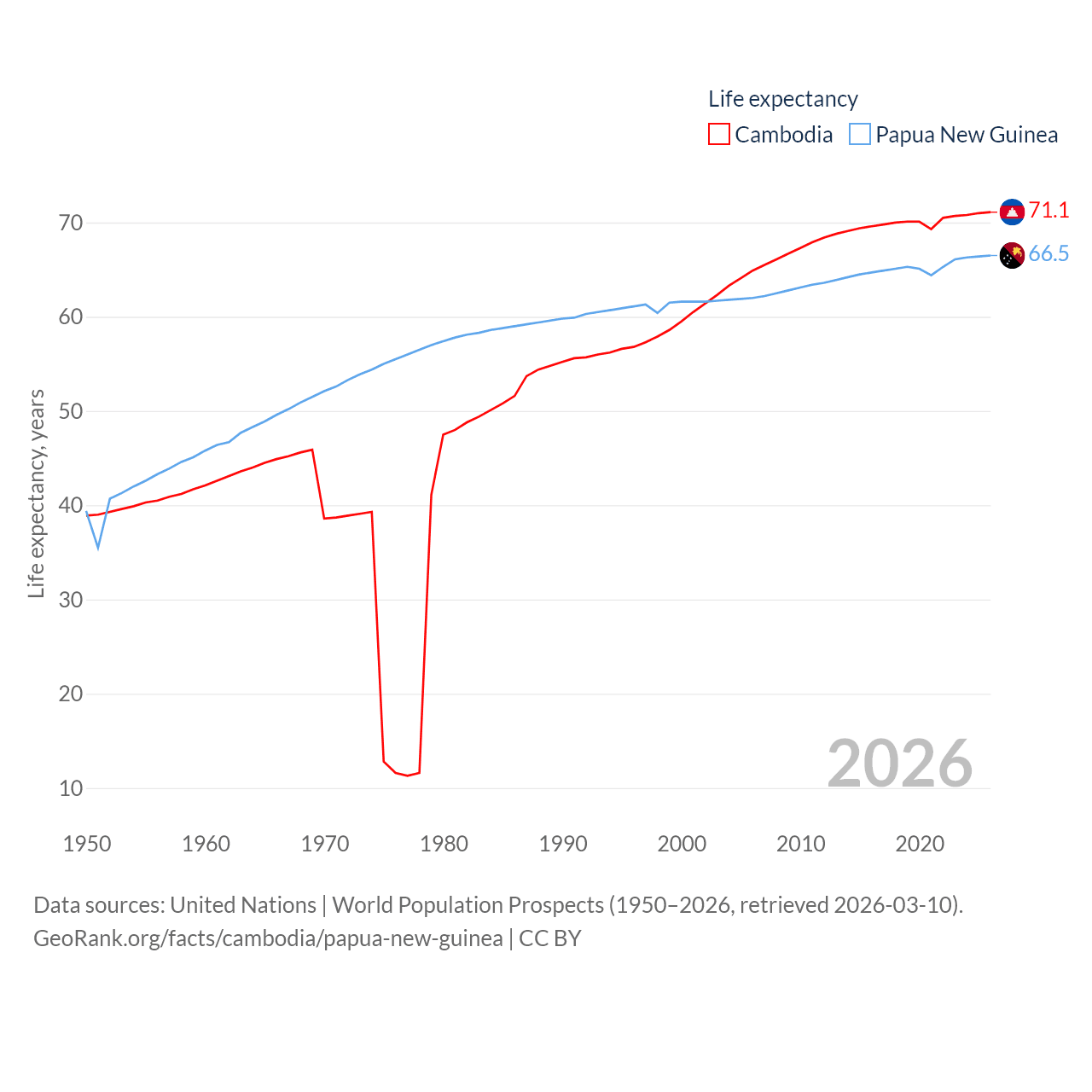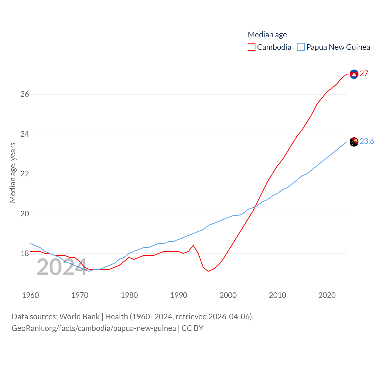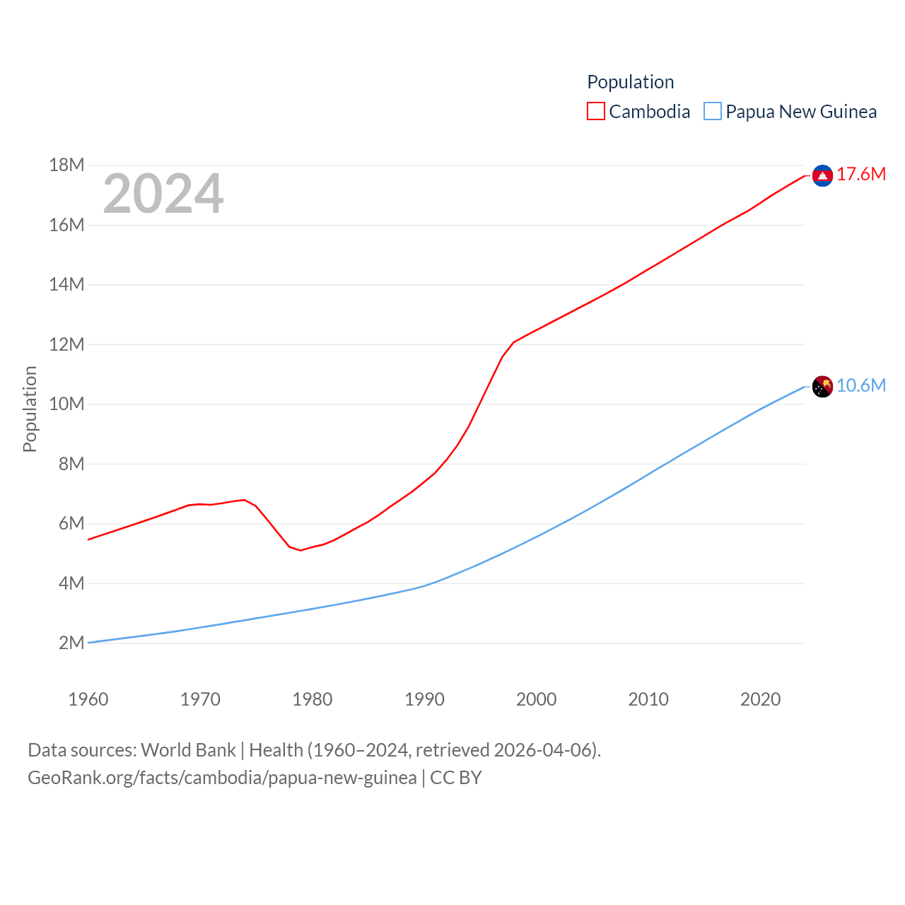 Cambodia has a population of 17.6M (ranked 73/197), compared with 10.6M in Papua New Guinea (ranked 92/197). Cambodia's land area is 68,155 sq mi versus 174,850 sq mi for Papua New Guinea (ranked 88th vs. 54th).