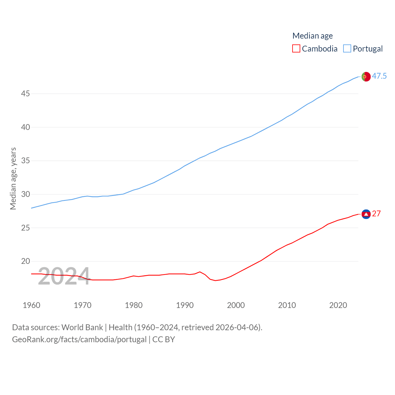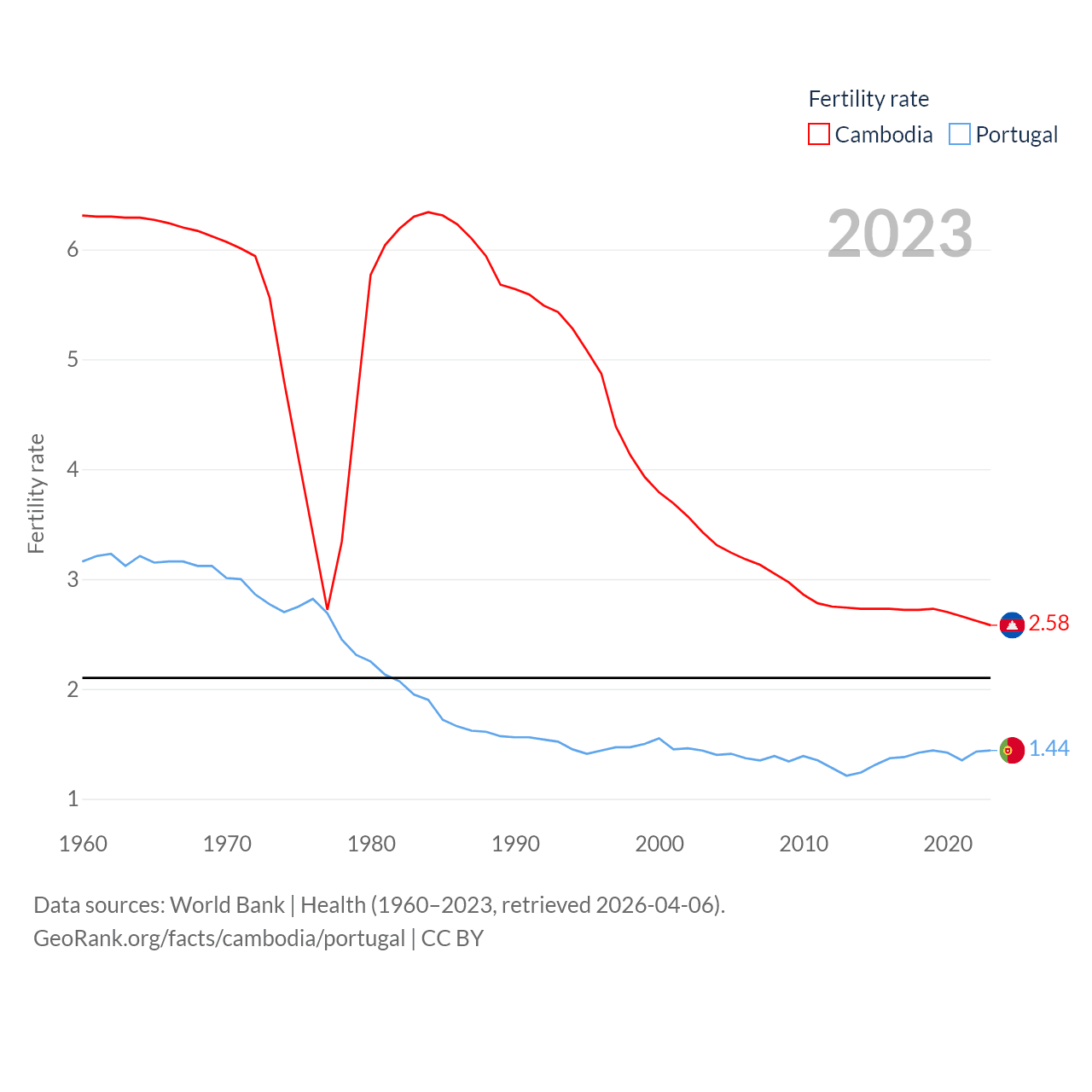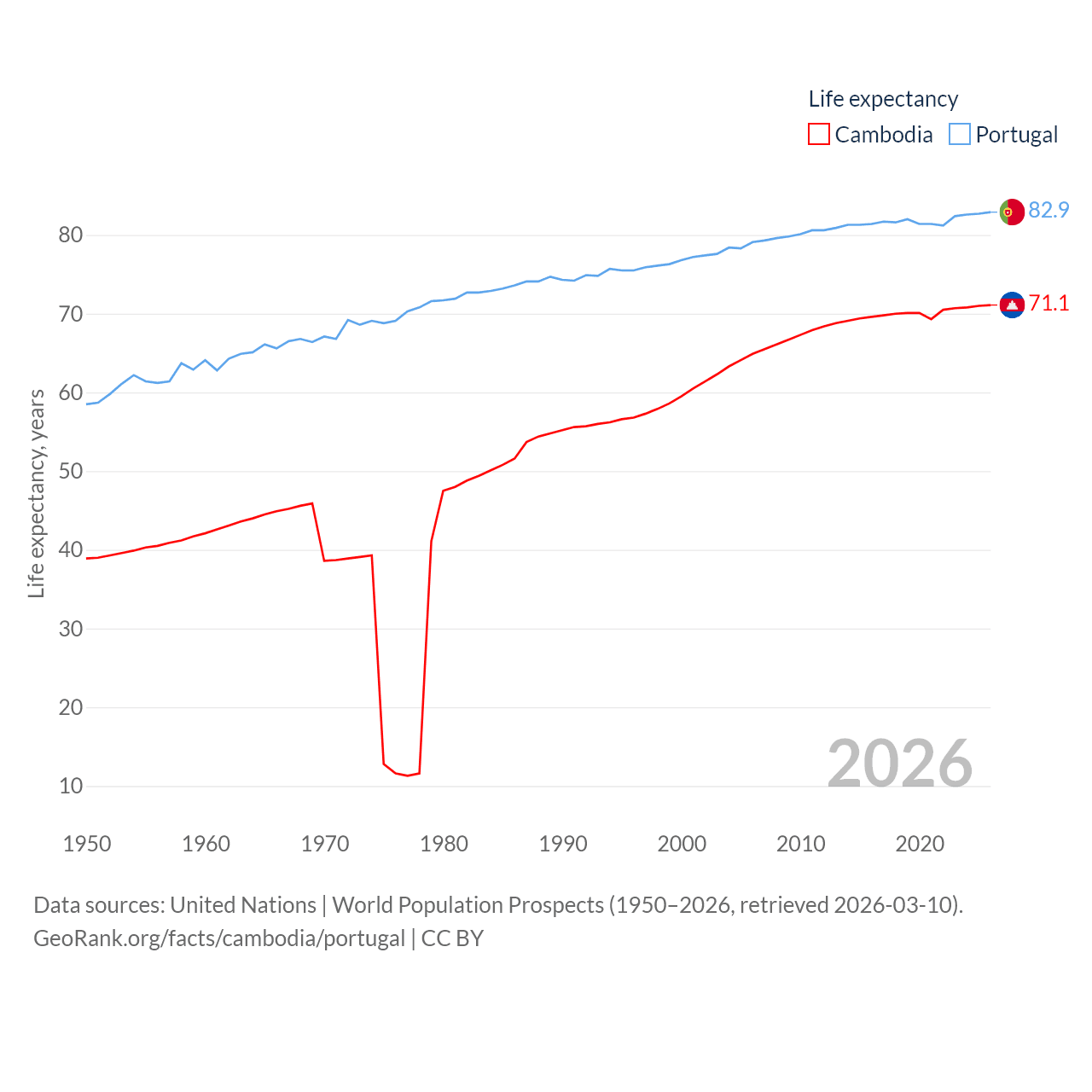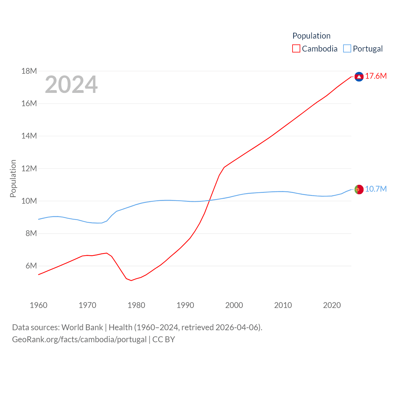 Cambodia has a population of 17.6M (ranked 73/197), compared with 10.7M in Portugal (ranked 90/197). Cambodia's land area is 68,155 sq mi versus 35,369 sq mi for Portugal (ranked 88th vs. 108th).