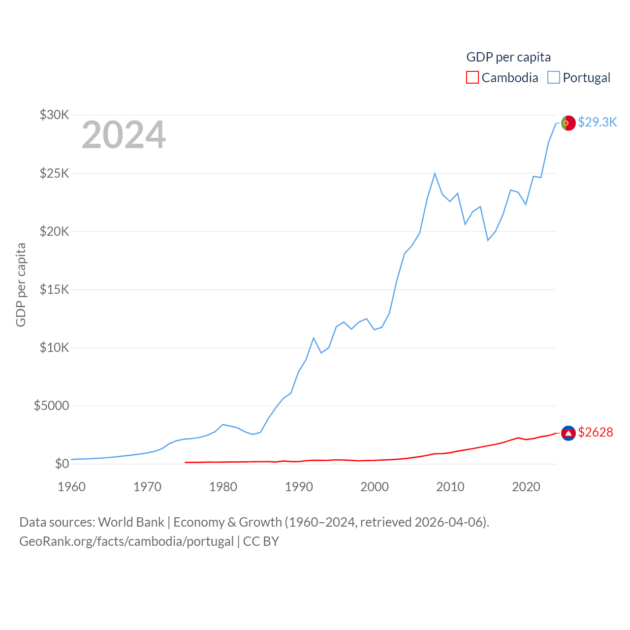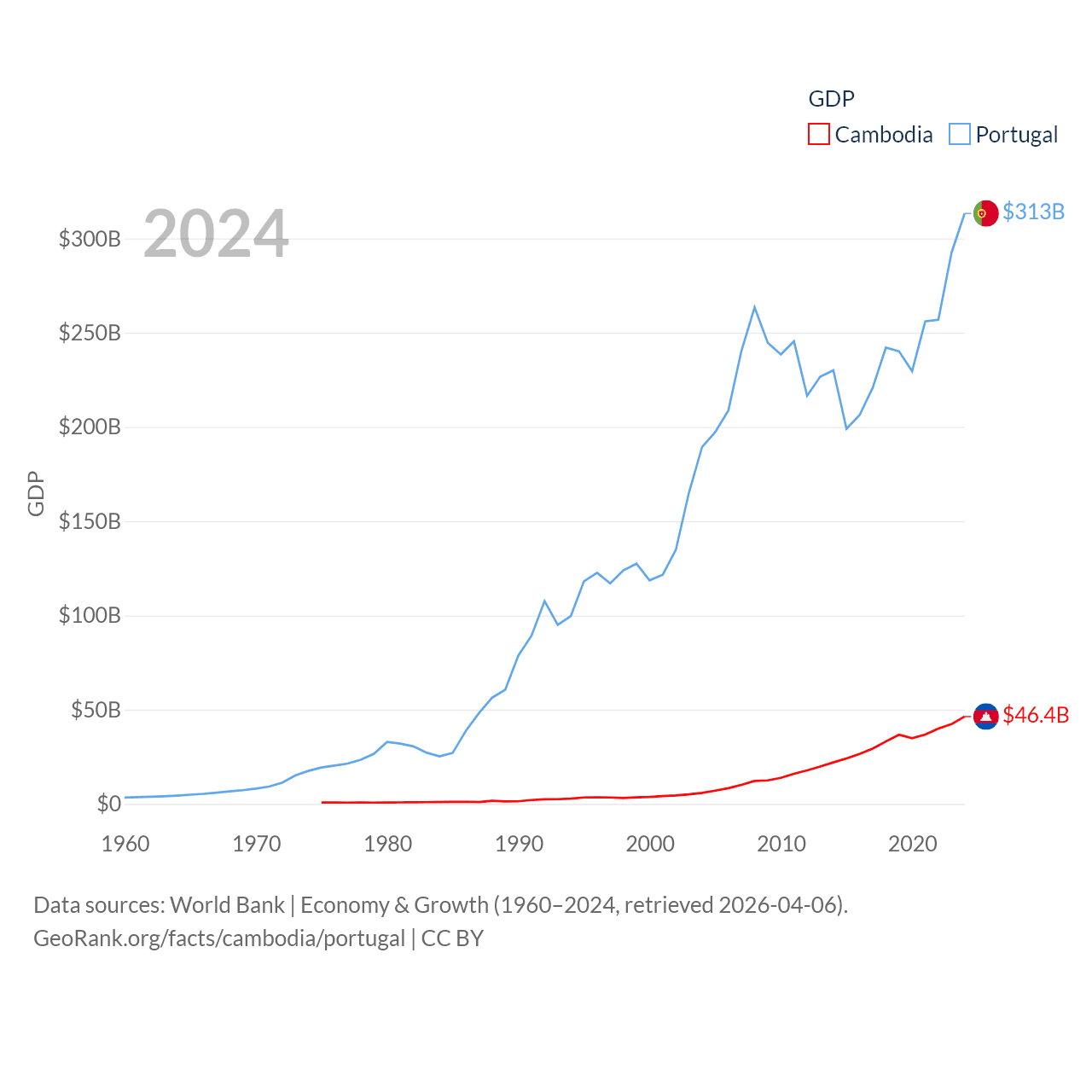 By GDP, Cambodia ranks 97/197 ($46.4B) and Portugal ranks 46/197 ($313B). By GDP per capita, Cambodia ranks 145/197 ($2,628), while Portugal ranks 44/197 ($29,292).