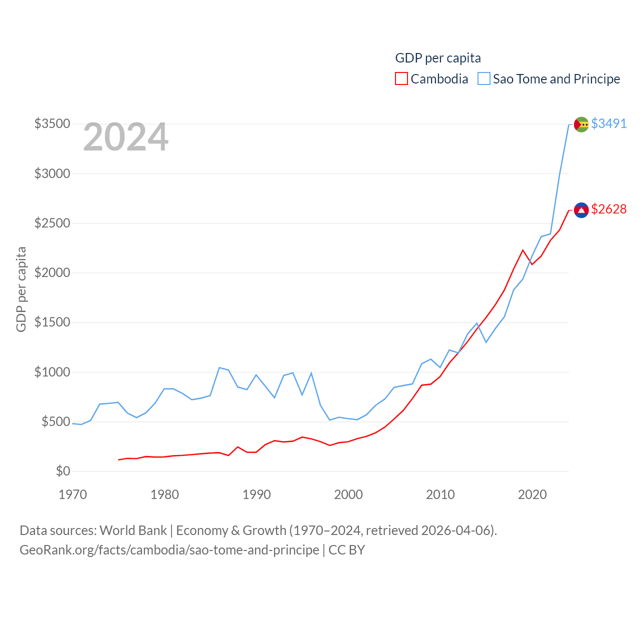 By GDP, Cambodia ranks 97/197 ($46.4B) and Sao Tome and Principe ranks 189/197 ($822M). By GDP per capita, Cambodia ranks 145/197 ($2,628), while Sao Tome and Principe ranks 134/197 ($3,491).