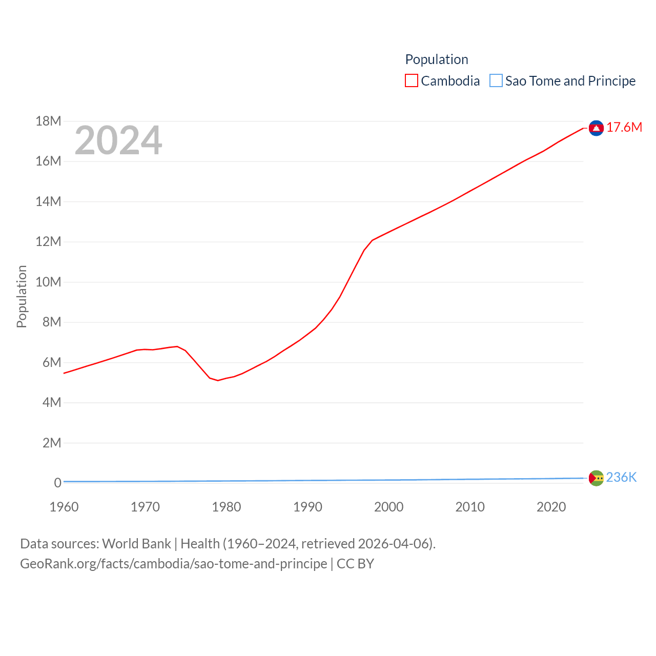 Cambodia has a population of 17.6M (ranked 73/197), compared with 236K in Sao Tome and Principe (ranked 176/197). Cambodia's land area is 68,155 sq mi versus 371 sq mi for Sao Tome and Principe (ranked 88th vs. 172nd).