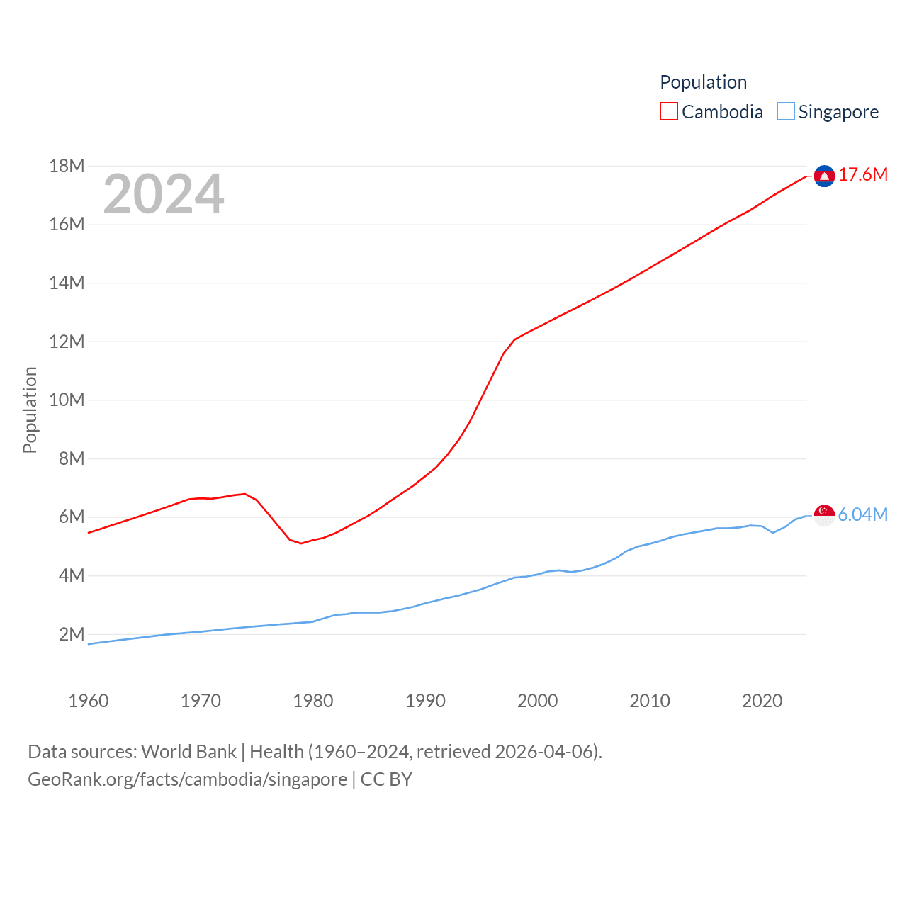 Cambodia has a population of 17.6M (ranked 73/197), compared with 6.04M in Singapore (ranked 113/197). Cambodia's land area is 68,155 sq mi versus 277.2 sq mi for Singapore (ranked 88th vs. 177th).