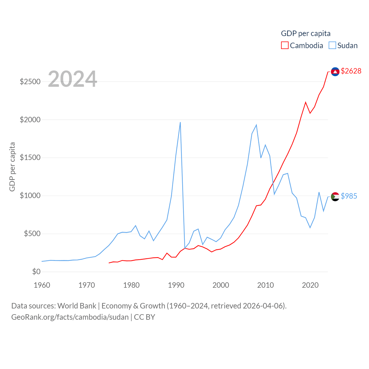 By GDP, Cambodia ranks 97/197 ($46.4B) and Sudan ranks 94/197 ($49.7B). By GDP per capita, Cambodia ranks 145/197 ($2,628), while Sudan ranks 179/197 ($985).