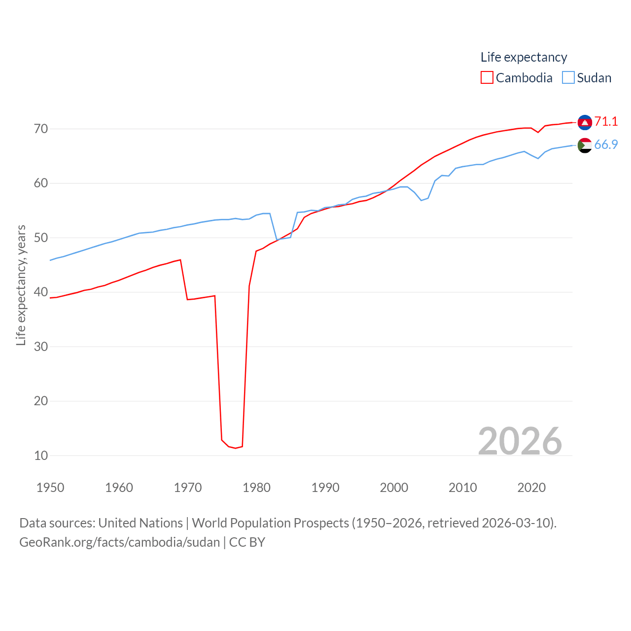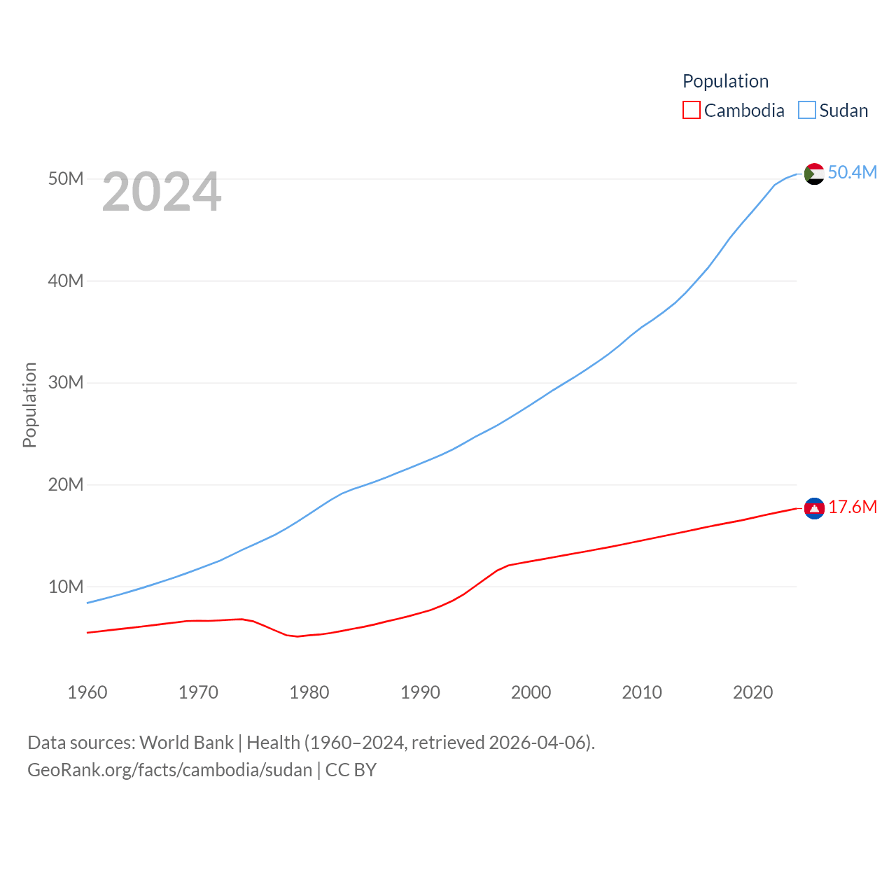 Cambodia has a population of 17.6M (ranked 73/197), compared with 50.4M in Sudan (ranked 30/197). Cambodia's land area is 68,155 sq mi versus 721,239 sq mi for Sudan (ranked 88th vs. 15th).