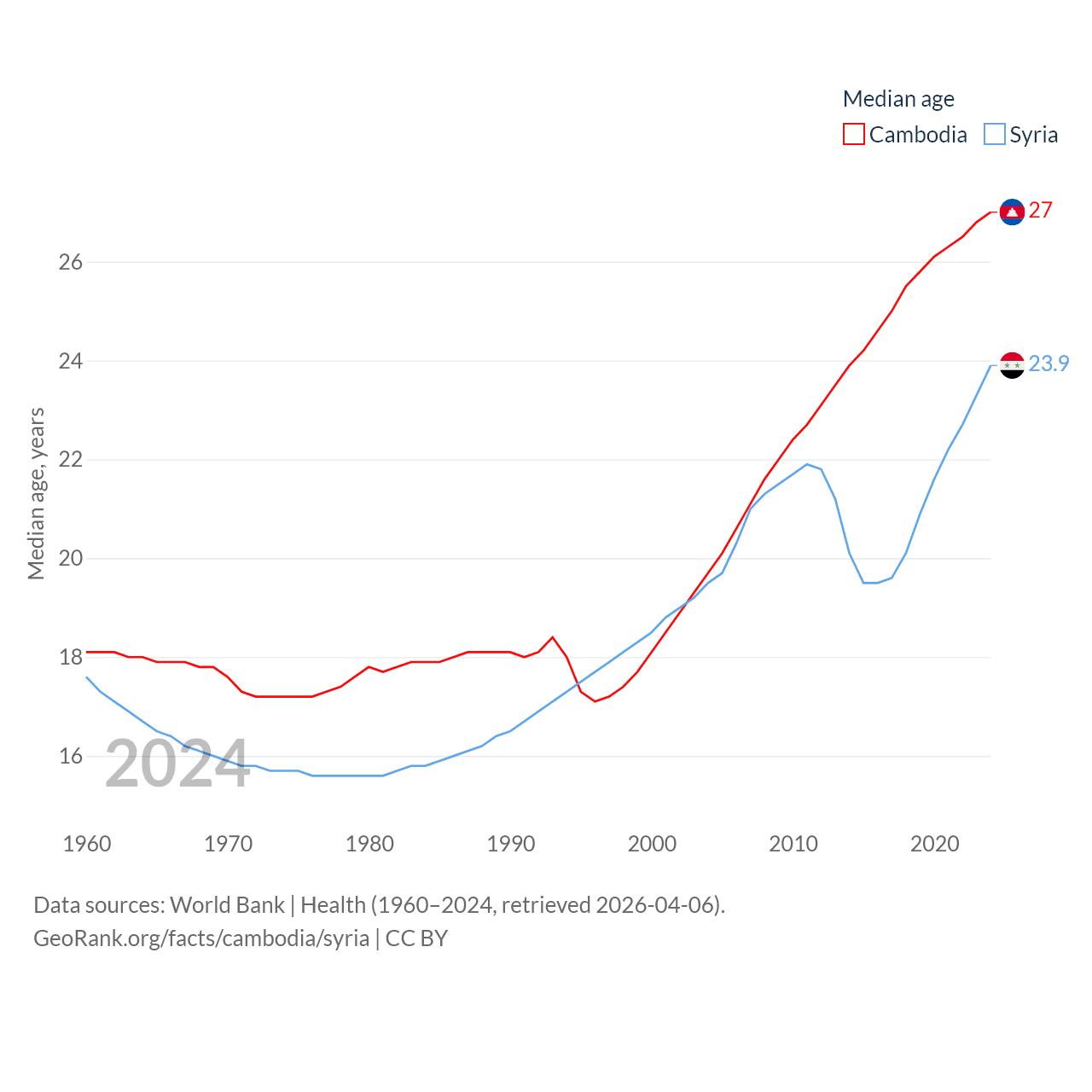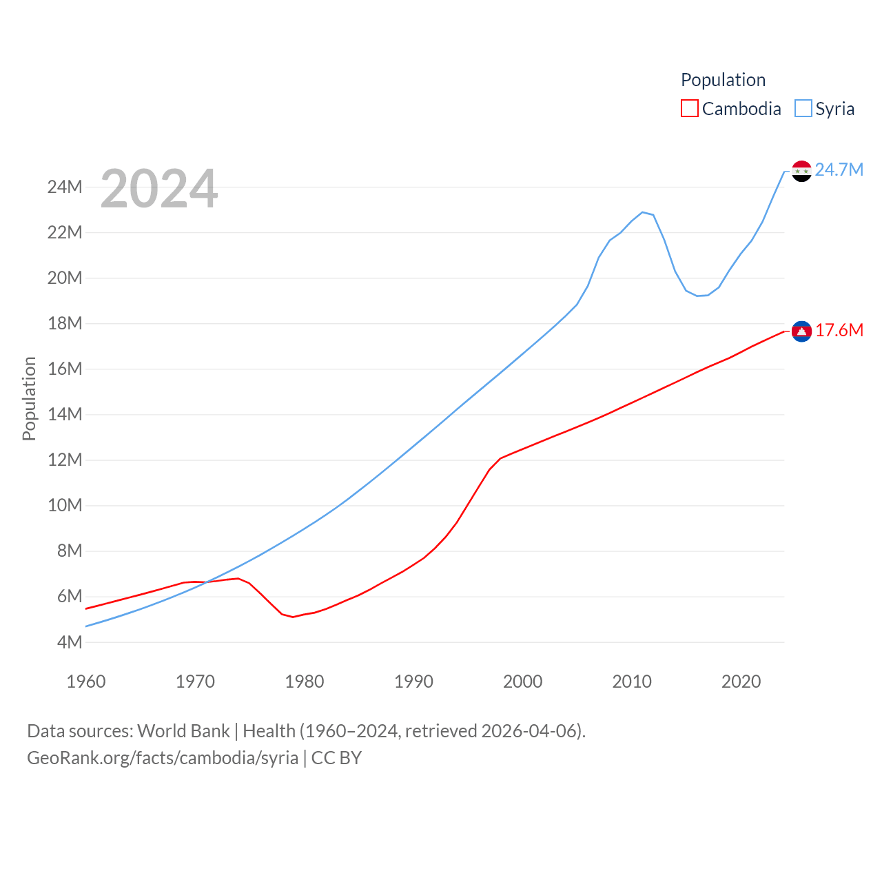 Cambodia has a population of 17.6M (ranked 73/197), compared with 24.7M in Syria (ranked 57/197). Cambodia's land area is 68,155 sq mi versus 70,900 sq mi for Syria (ranked 88th vs. 87th).