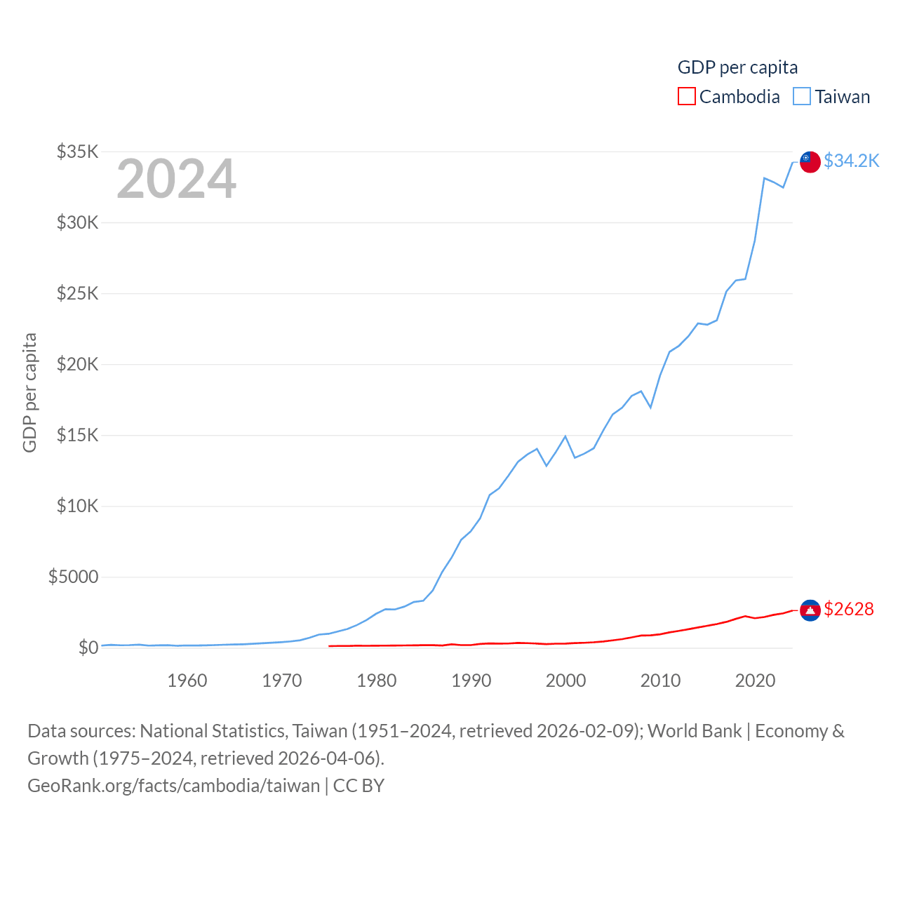 By GDP, Cambodia ranks 97/197 ($46.4B) and Taiwan ranks 22/197 ($802B). By GDP per capita, Cambodia ranks 145/197 ($2,628), while Taiwan ranks 35/197 ($34,238).