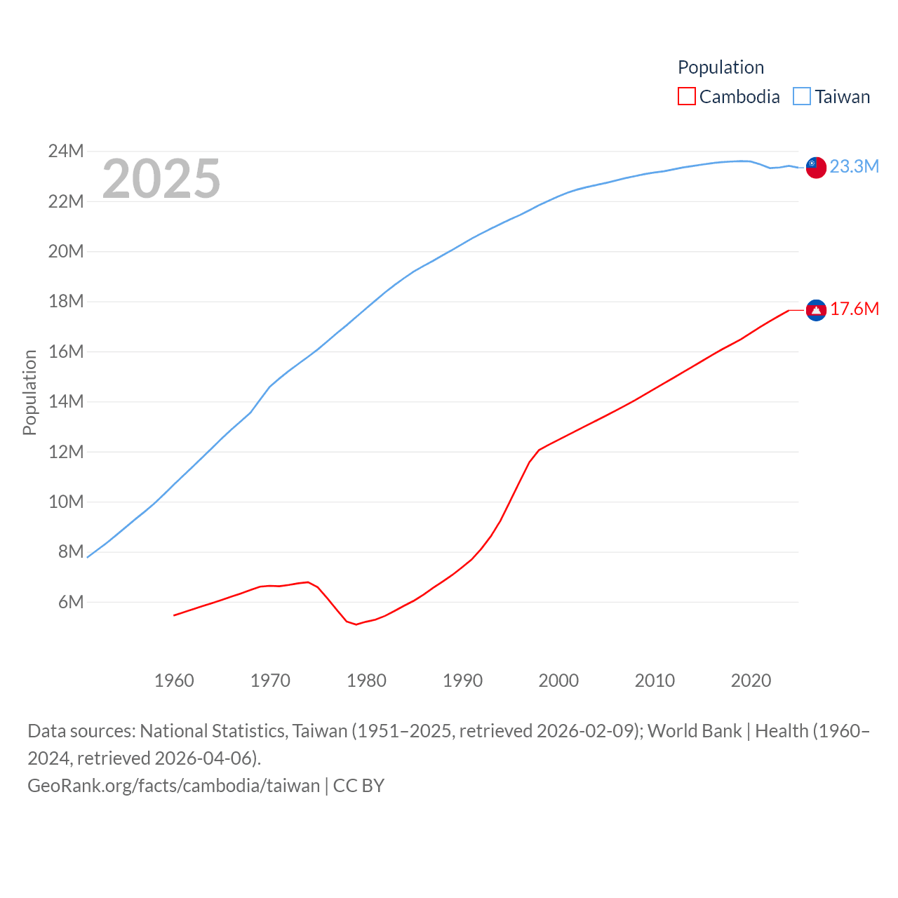 Cambodia has a population of 17.6M (ranked 73/197), compared with 23.3M in Taiwan (ranked 60/197). Cambodia's land area is 68,155 sq mi versus 13,976 sq mi for Taiwan (ranked 88th vs. 133rd).