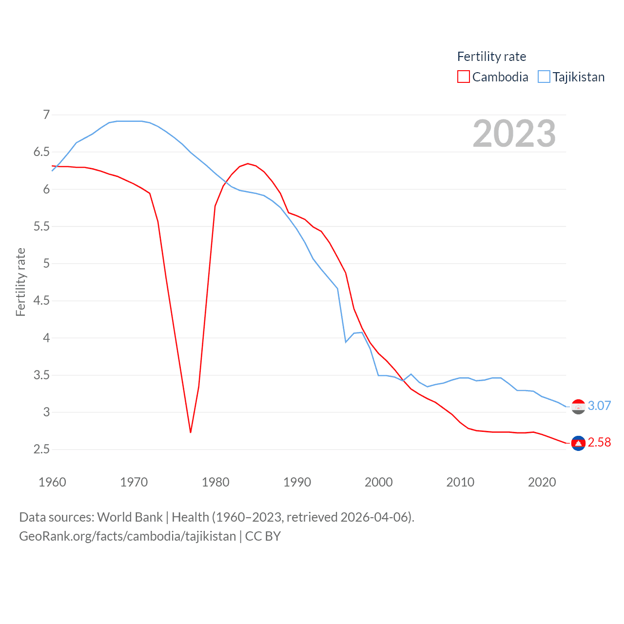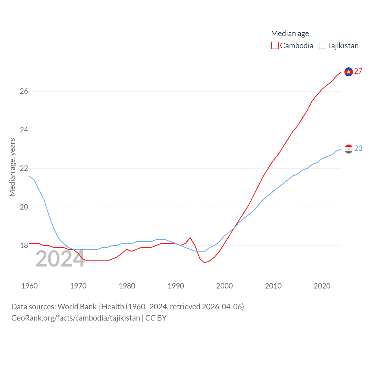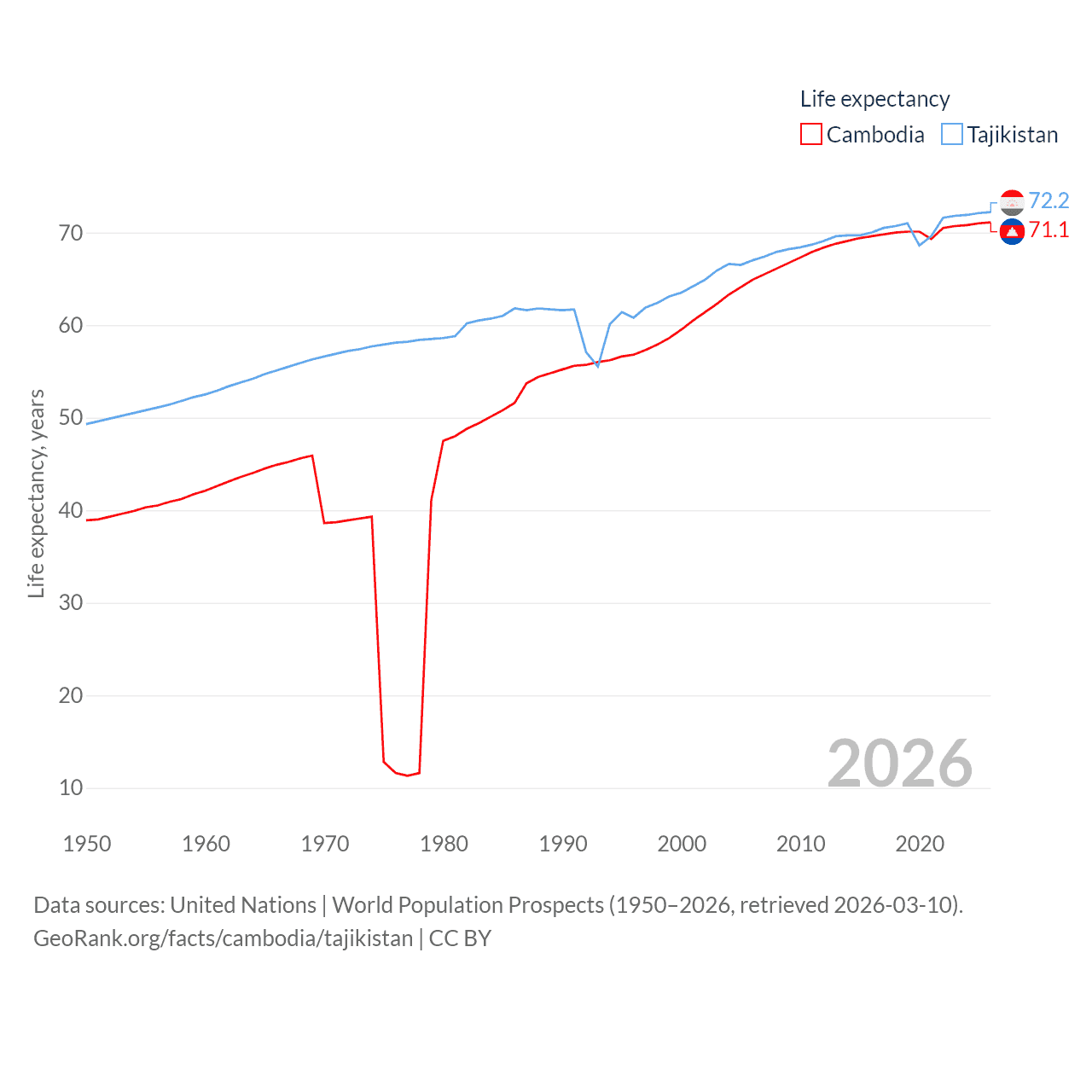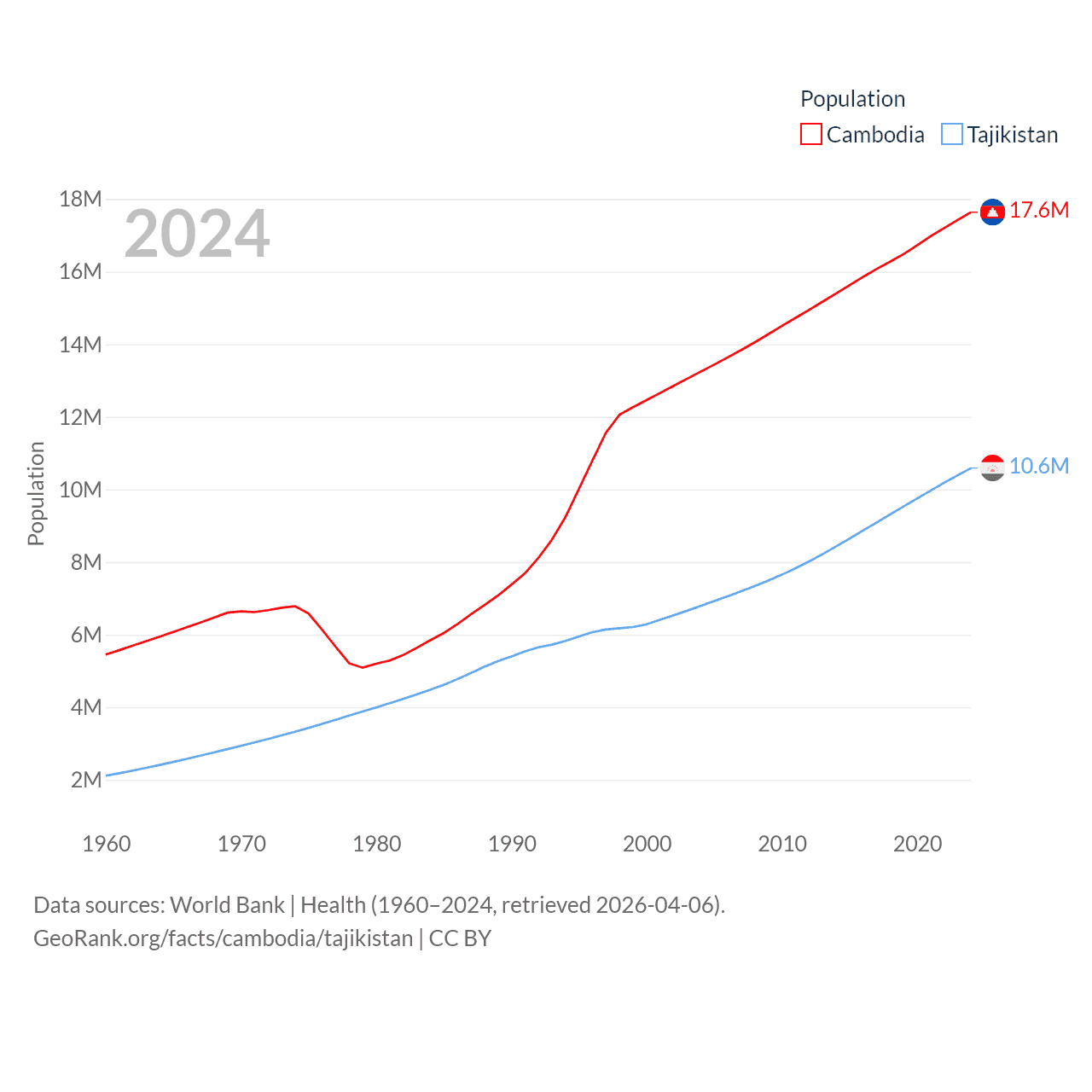 Cambodia has a population of 17.6M (ranked 73/197), compared with 10.6M in Tajikistan (ranked 91/197). Cambodia's land area is 68,155 sq mi versus 53,587 sq mi for Tajikistan (ranked 88th vs. 93rd).