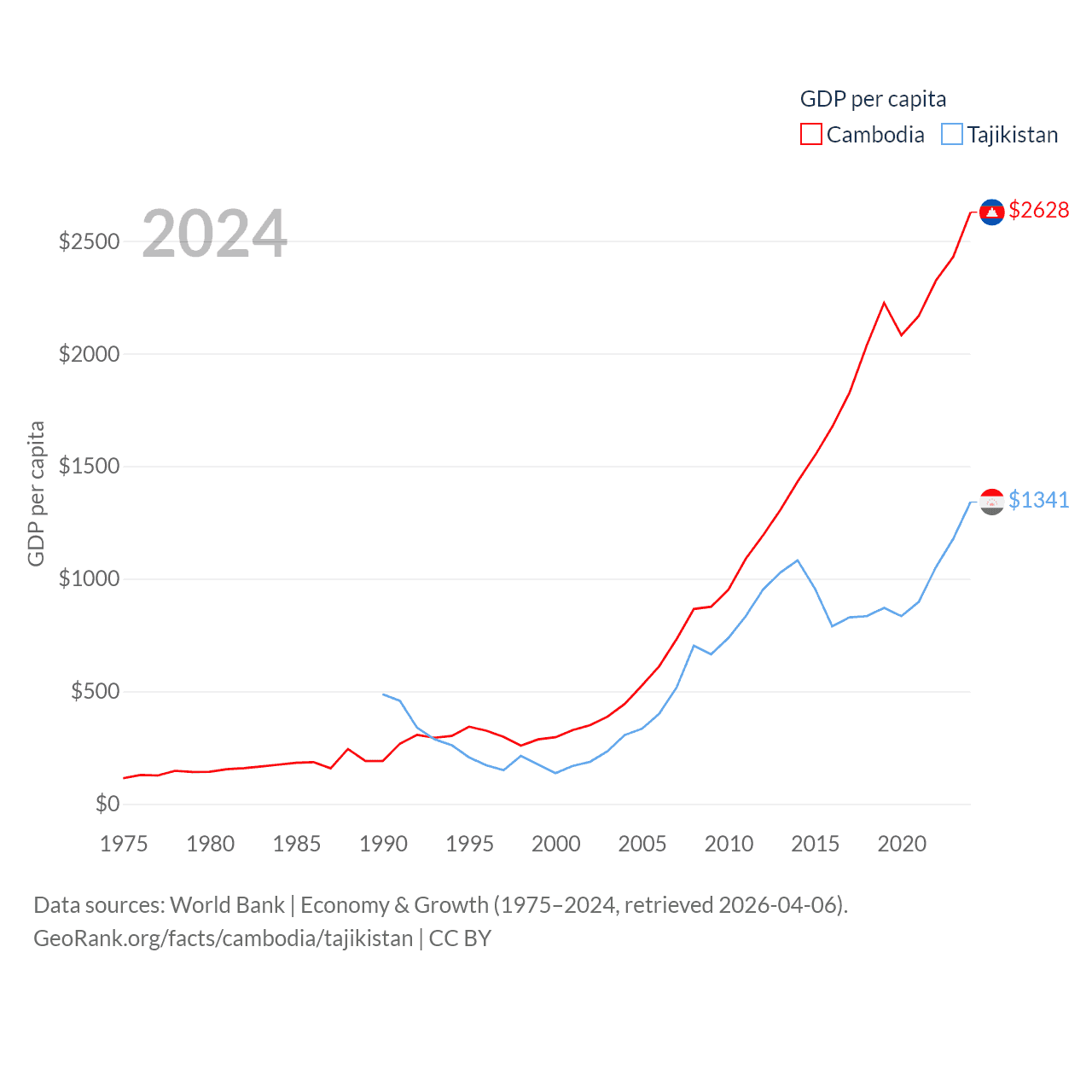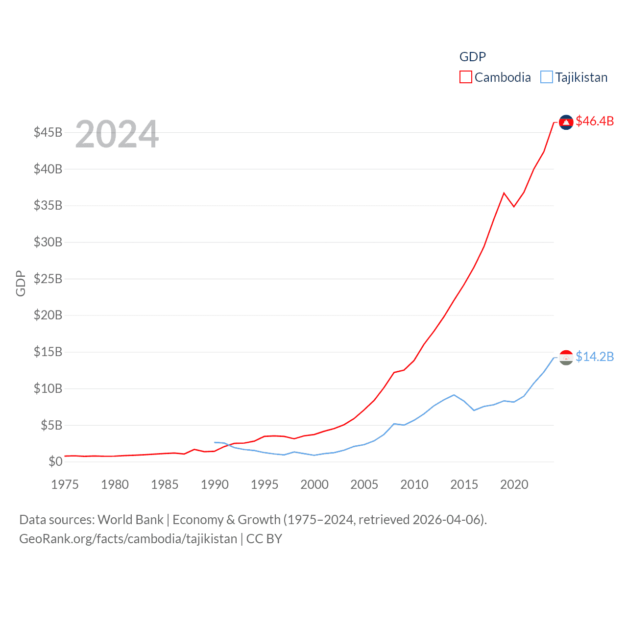 By GDP, Cambodia ranks 97/197 ($46.4B) and Tajikistan ranks 145/197 ($14.2B). By GDP per capita, Cambodia ranks 145/197 ($2,628), while Tajikistan ranks 166/197 ($1,341).