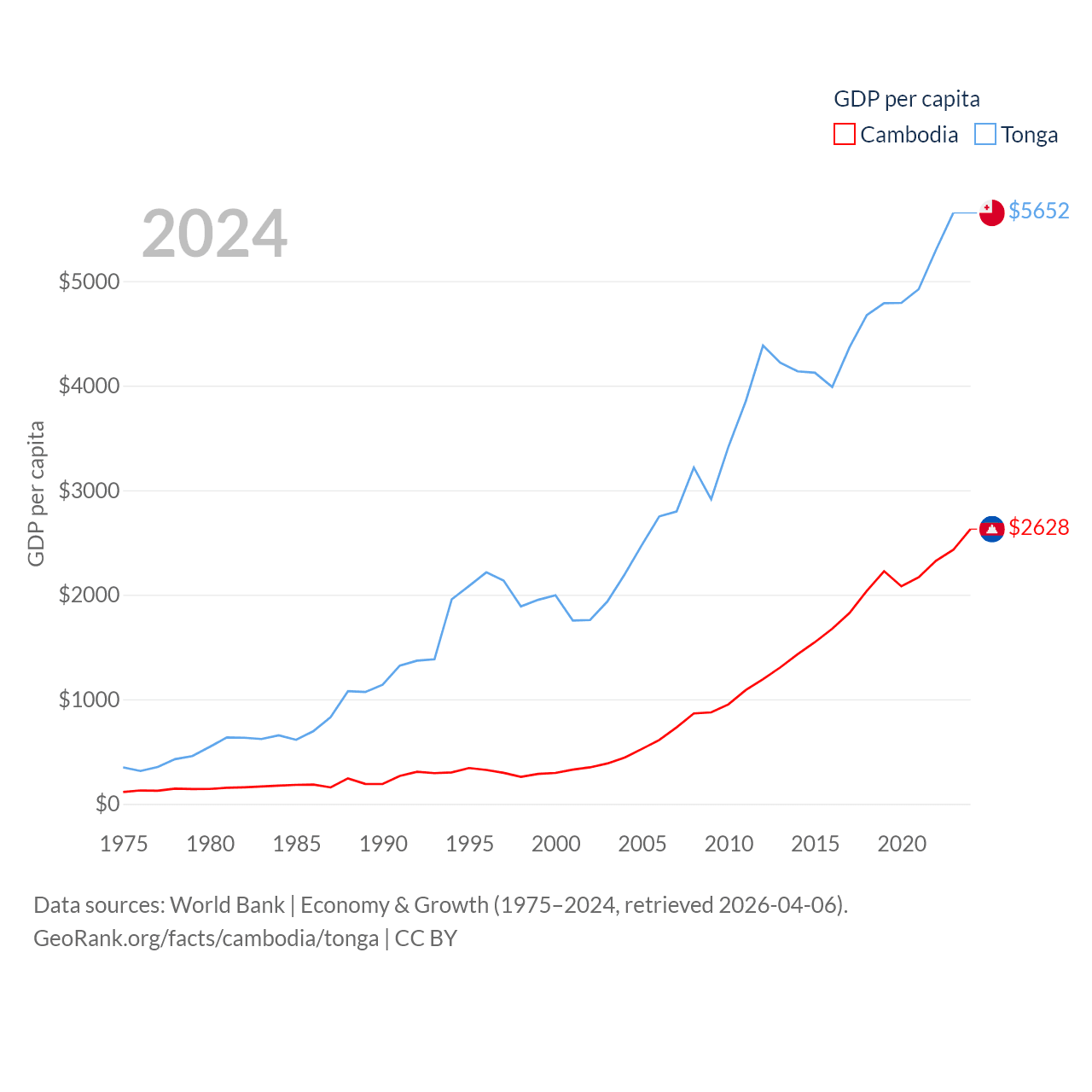 By GDP, Cambodia ranks 97/197 ($46.4B) and Tonga ranks 191/197 ($591M). By GDP per capita, Cambodia ranks 145/197 ($2,628), while Tonga ranks 115/197 ($5,652).