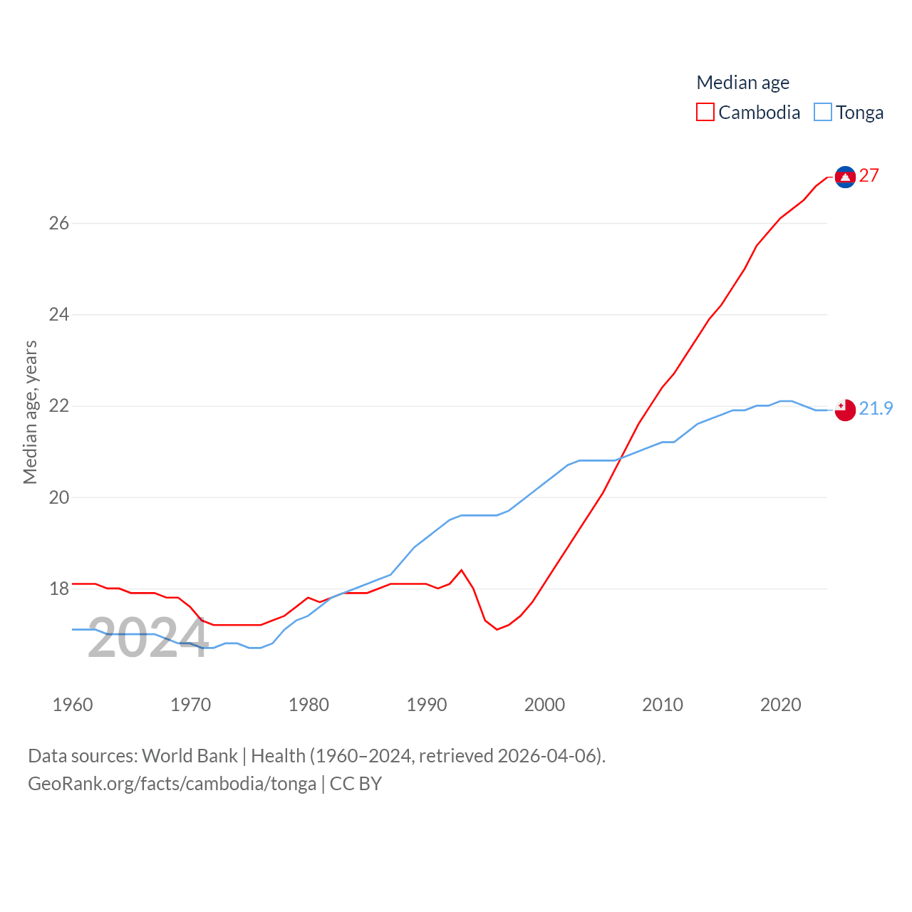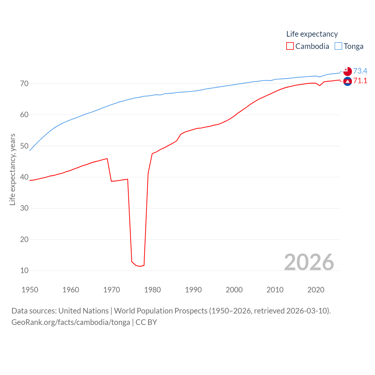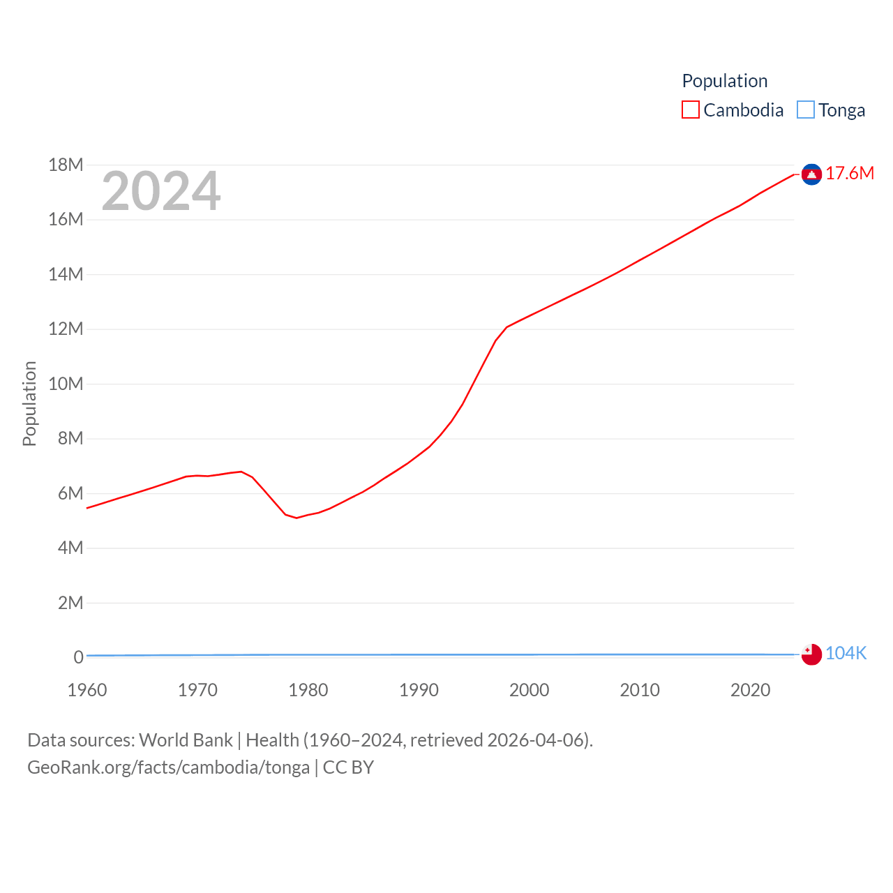 Cambodia has a population of 17.6M (ranked 73/197), compared with 104K in Tonga (ranked 183/197). Cambodia's land area is 68,155 sq mi versus 278 sq mi for Tonga (ranked 88th vs. 176th).