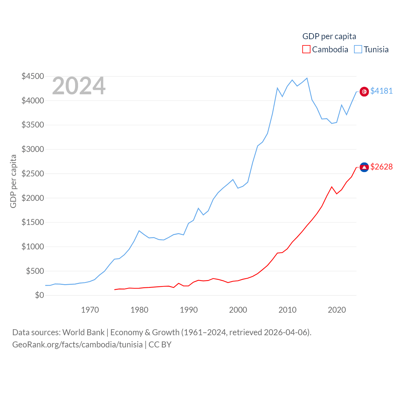 By GDP, Cambodia ranks 97/197 ($46.4B) and Tunisia ranks 93/197 ($51.3B). By GDP per capita, Cambodia ranks 145/197 ($2,628), while Tunisia ranks 129/197 ($4,181).