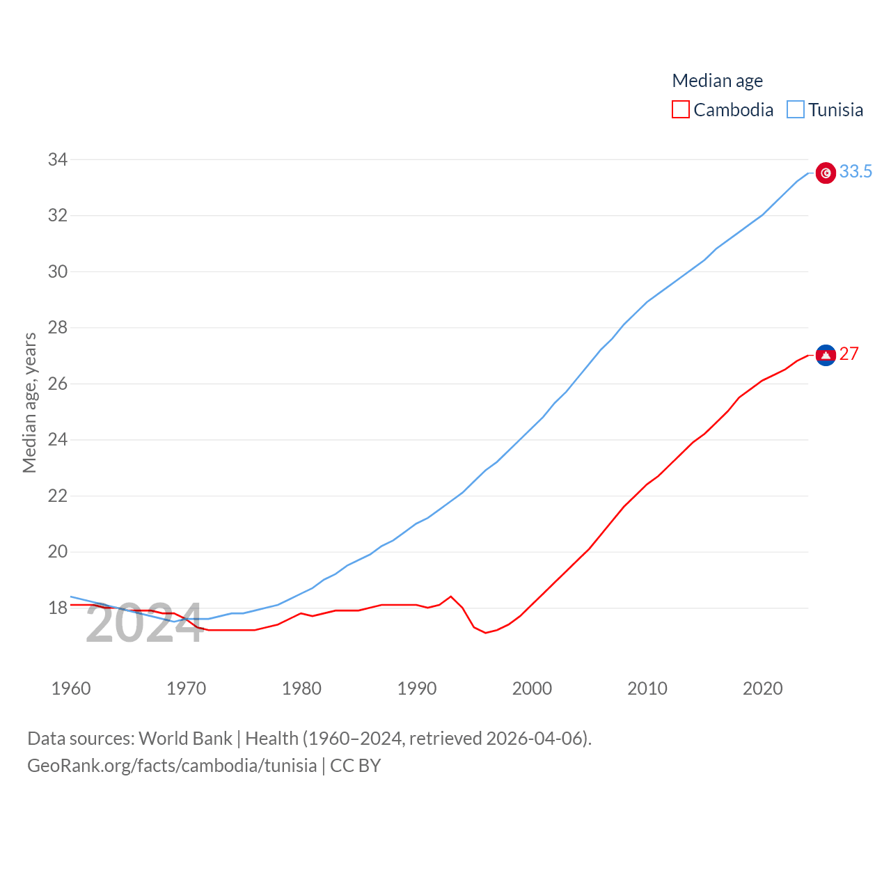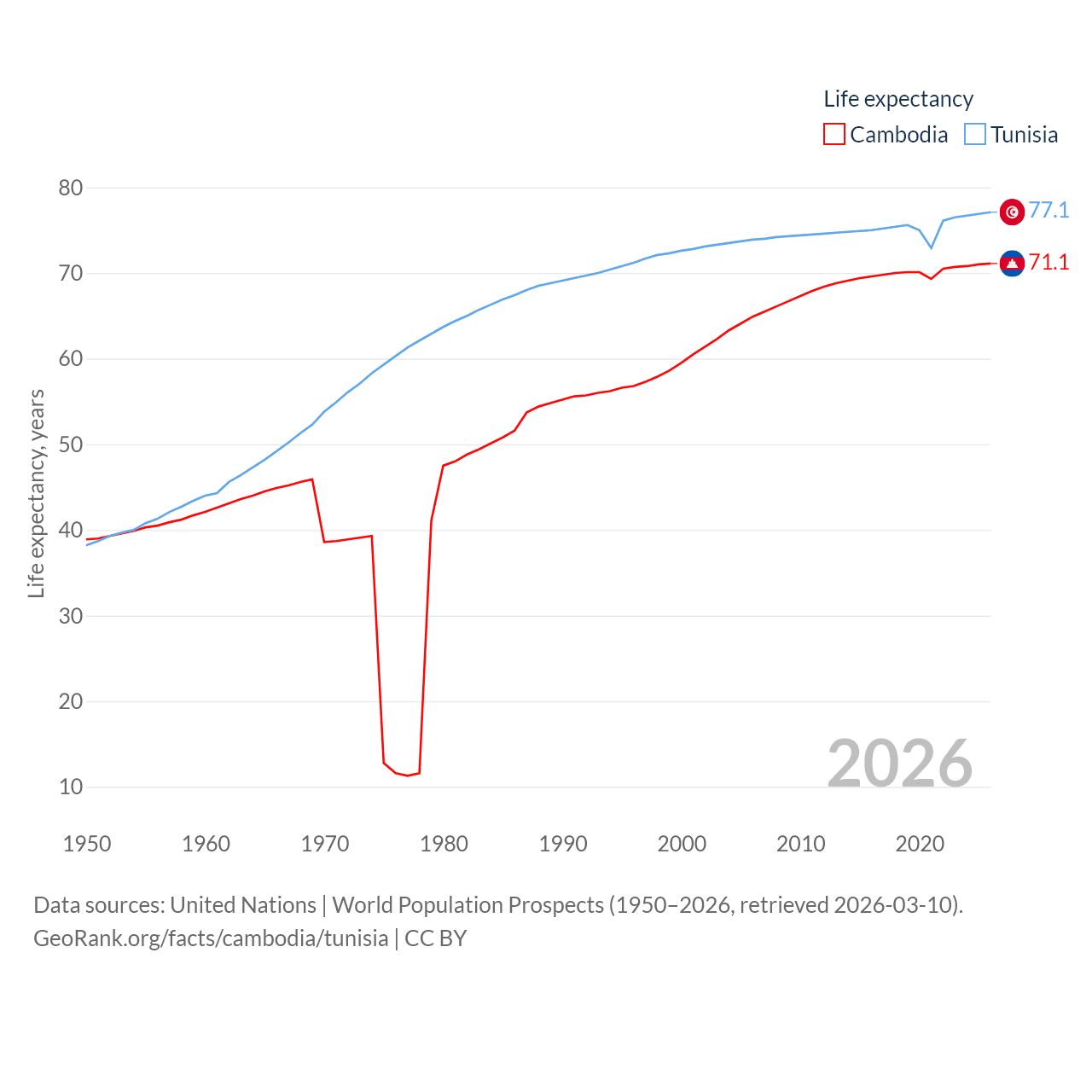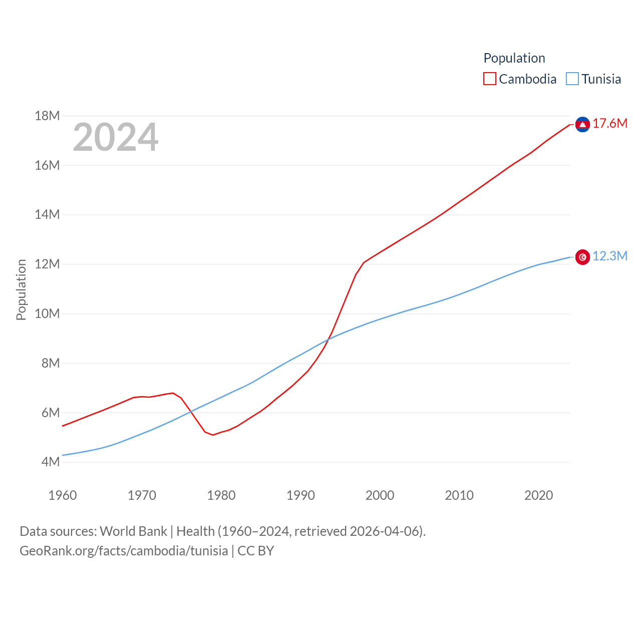 Cambodia has a population of 17.6M (ranked 73/197), compared with 12.3M in Tunisia (ranked 80/197). Cambodia's land area is 68,155 sq mi versus 59,985 sq mi for Tunisia (ranked 88th vs. 91st).
