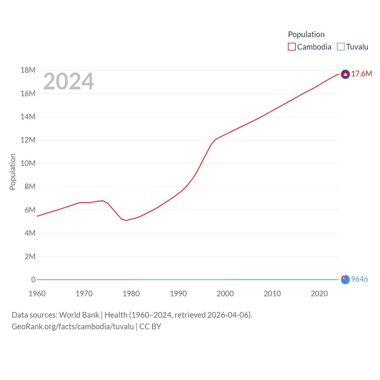 Cambodia has a population of 17.6M (ranked 73/197), compared with 9.65K in Tuvalu (ranked 196/197). Cambodia's land area is 68,155 sq mi versus 11.6 sq mi for Tuvalu (ranked 88th vs. 194th).