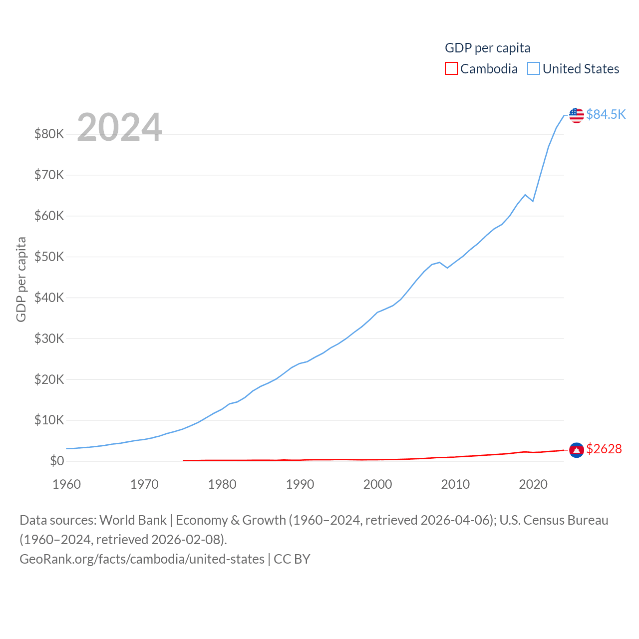 By GDP, Cambodia ranks 97/197 ($46.4B) and The United States ranks 1/197 ($28.8T). By GDP per capita, Cambodia ranks 145/197 ($2,628), while The United States ranks 10/197 ($84,534).