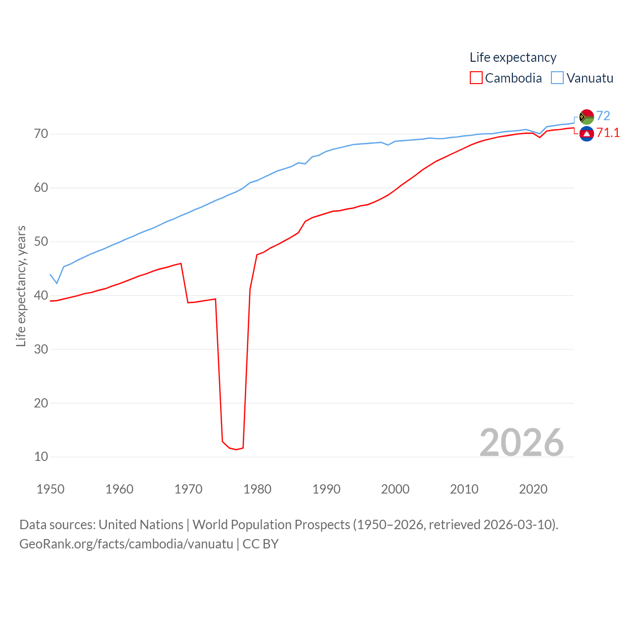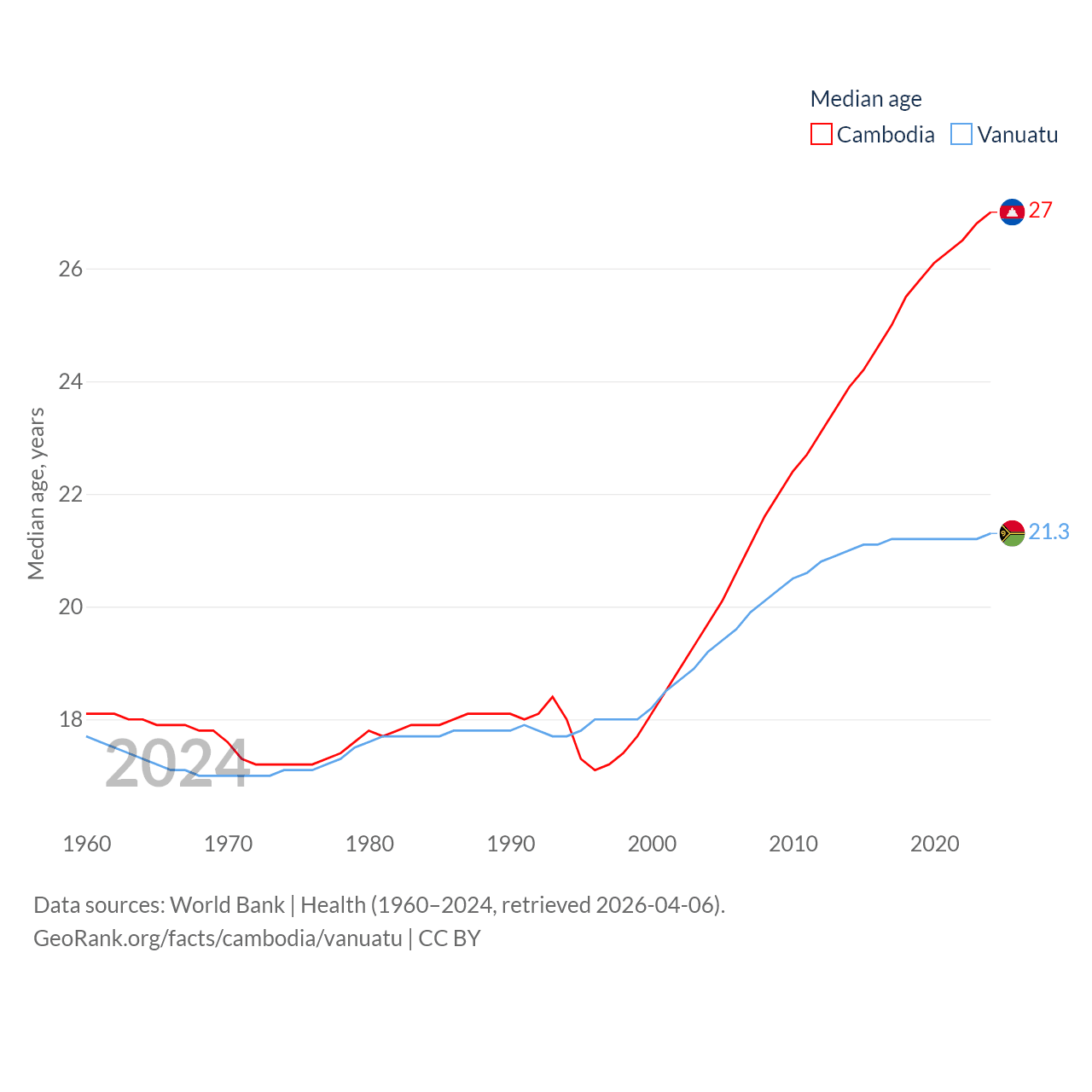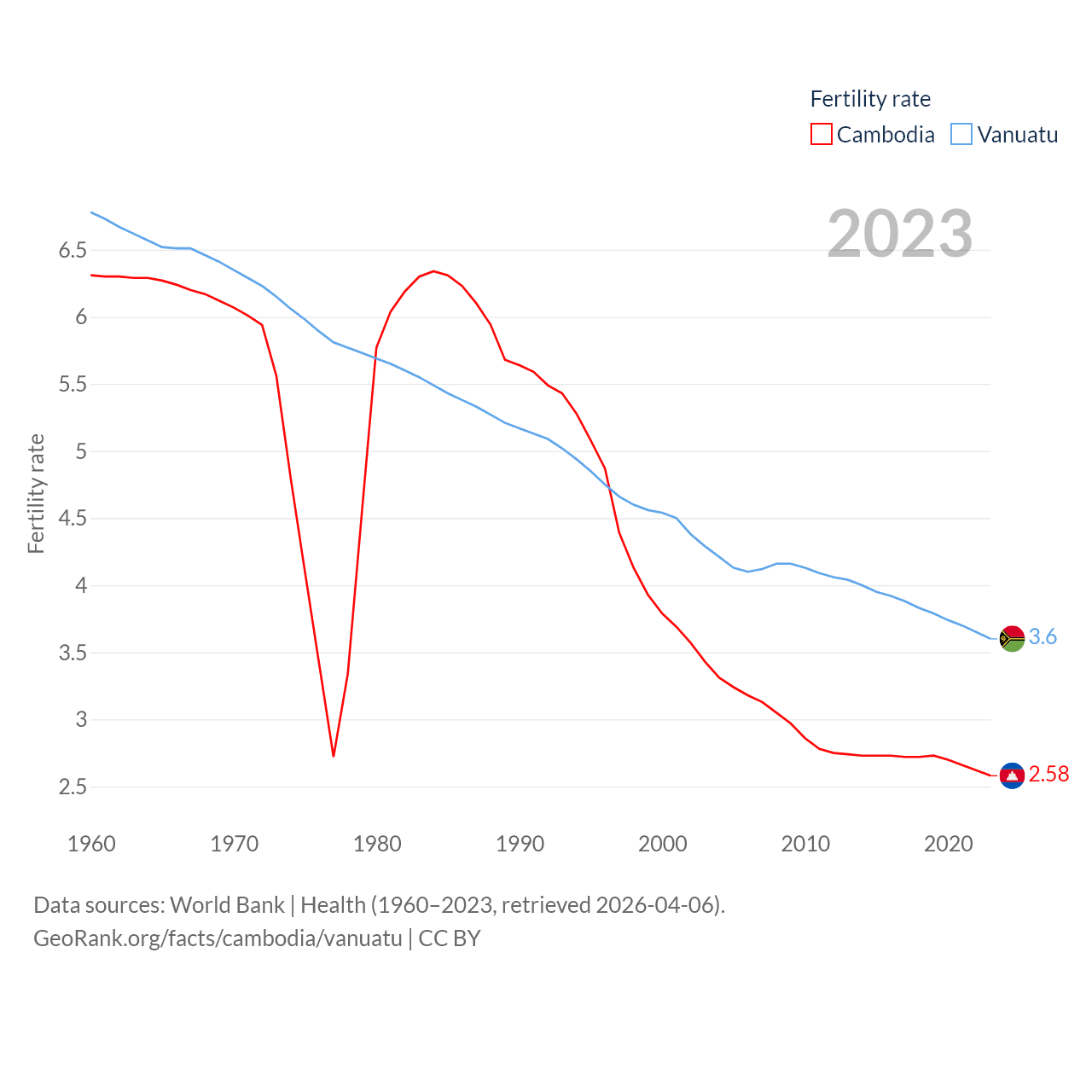 Cambodia has a population of 17.6M (ranked 73/197), compared with 328K in Vanuatu (ranked 174/197). Cambodia's land area is 68,155 sq mi versus 4,707 sq mi for Vanuatu (ranked 88th vs. 157th).