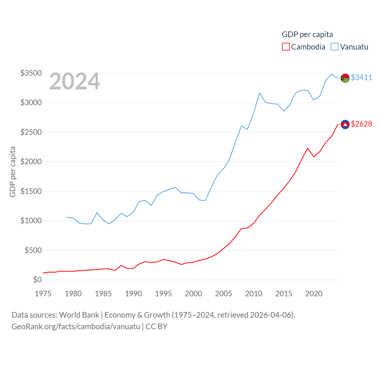 By GDP, Cambodia ranks 97/197 ($46.4B) and Vanuatu ranks 188/197 ($1.12B). By GDP per capita, Cambodia ranks 145/197 ($2,628), while Vanuatu ranks 137/197 ($3,411).