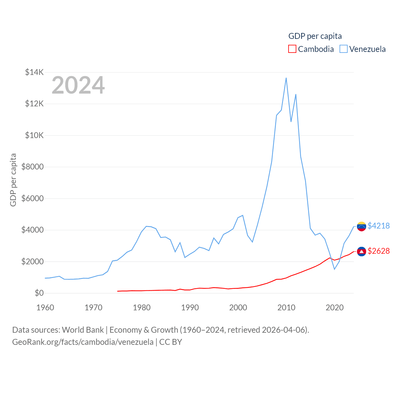 By GDP, Cambodia ranks 97/197 ($46.4B) and Venezuela ranks 65/197 ($120B). By GDP per capita, Cambodia ranks 145/197 ($2,628), while Venezuela ranks 128/197 ($4,218).