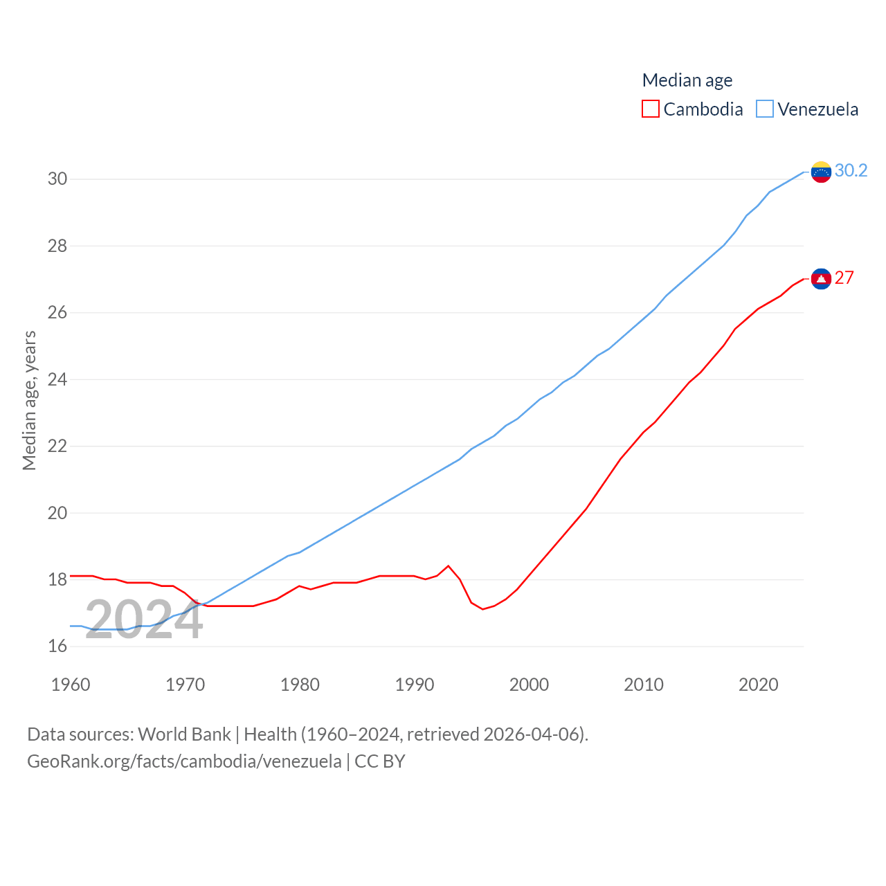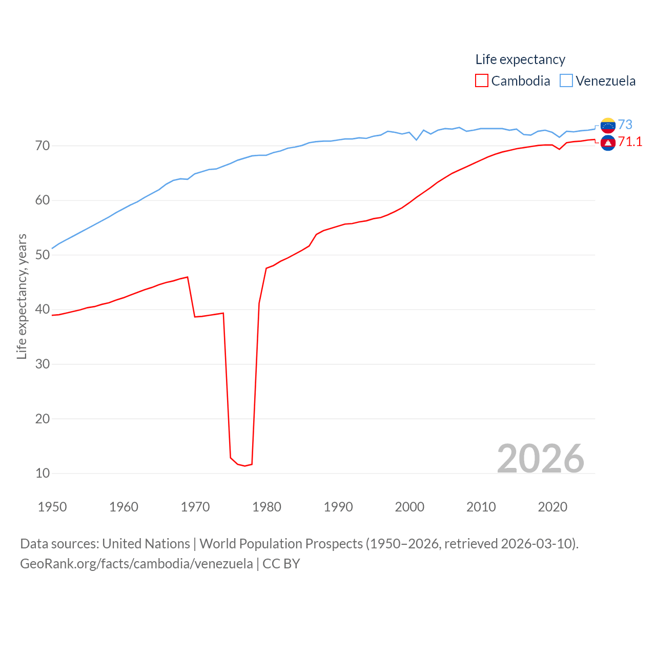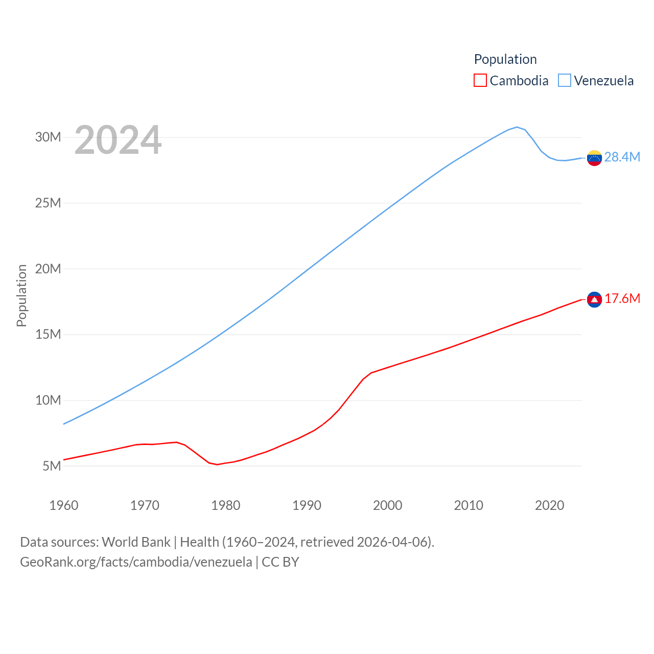 Cambodia has a population of 17.6M (ranked 73/197), compared with 28.4M in Venezuela (ranked 53/197). Cambodia's land area is 68,155 sq mi versus 340,561 sq mi for Venezuela (ranked 88th vs. 32nd).