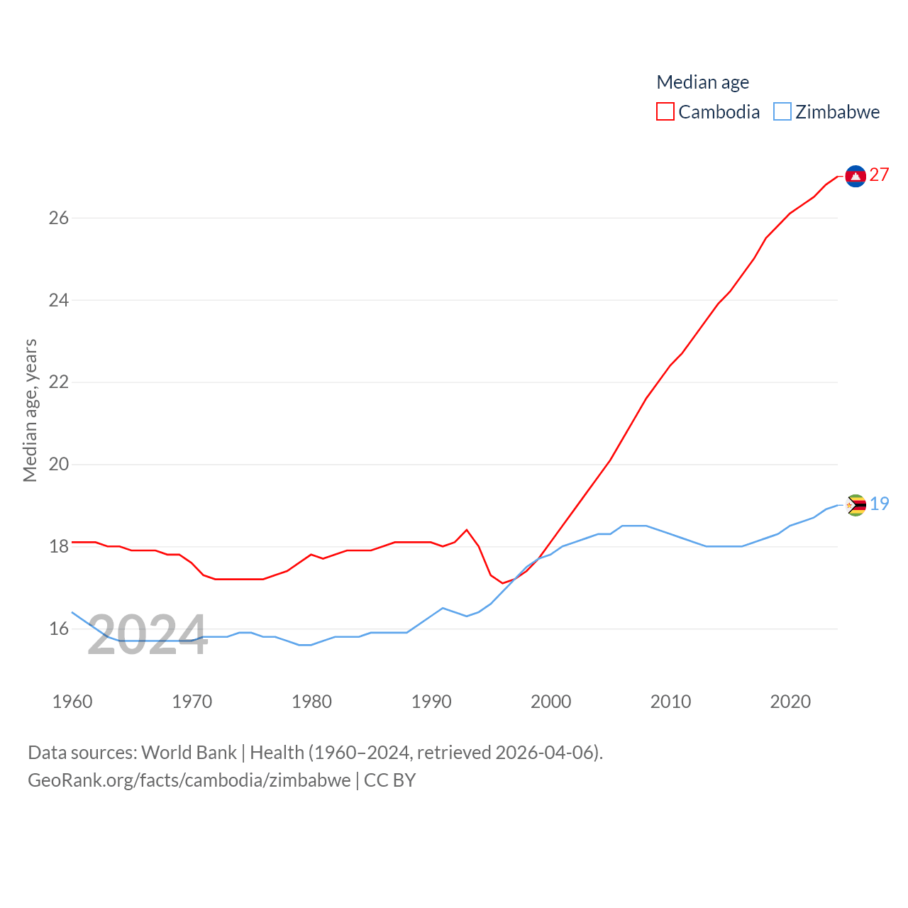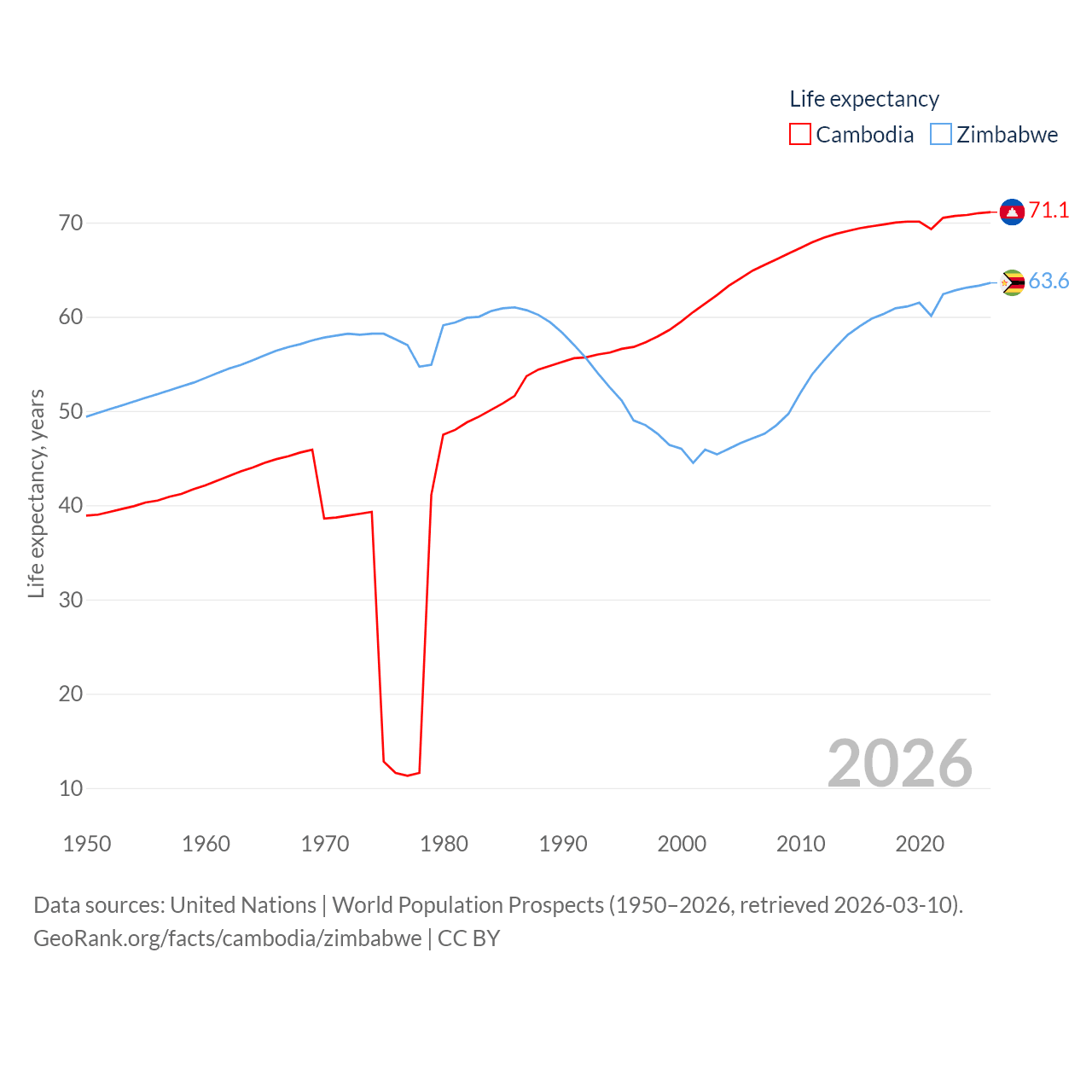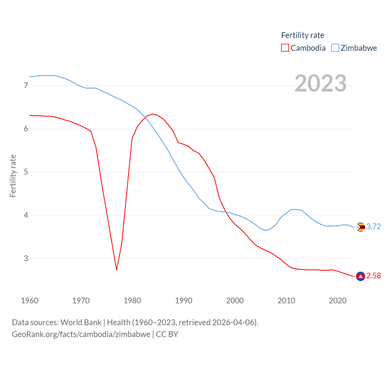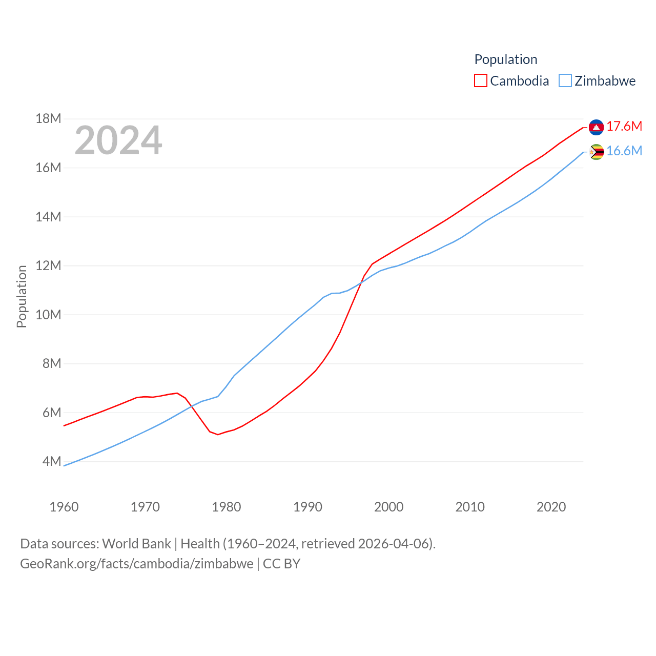 Cambodia has a population of 17.6M (ranked 73/197), compared with 16.6M in Zimbabwe (ranked 74/197). Cambodia's land area is 68,155 sq mi versus 149,364 sq mi for Zimbabwe (ranked 88th vs. 60th).