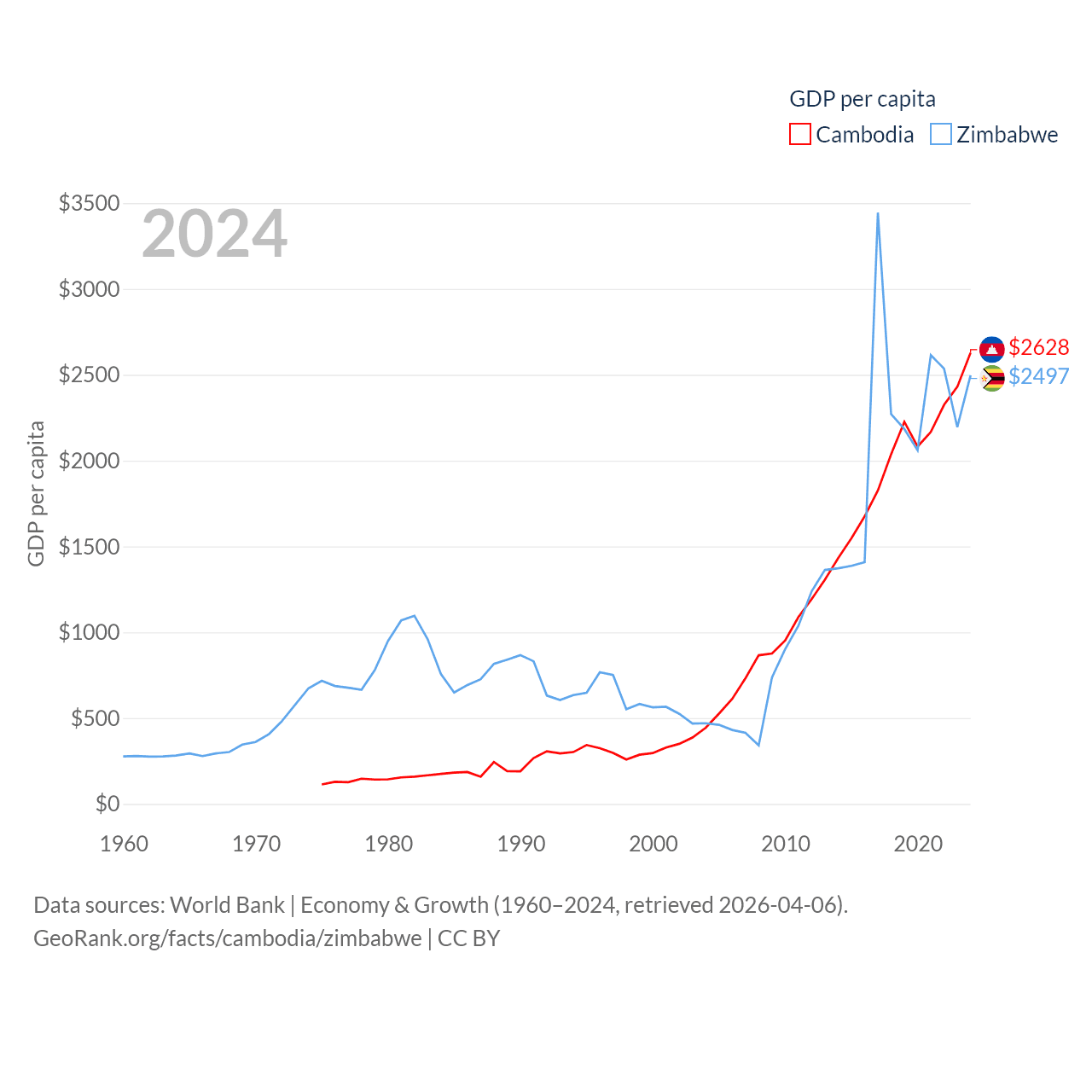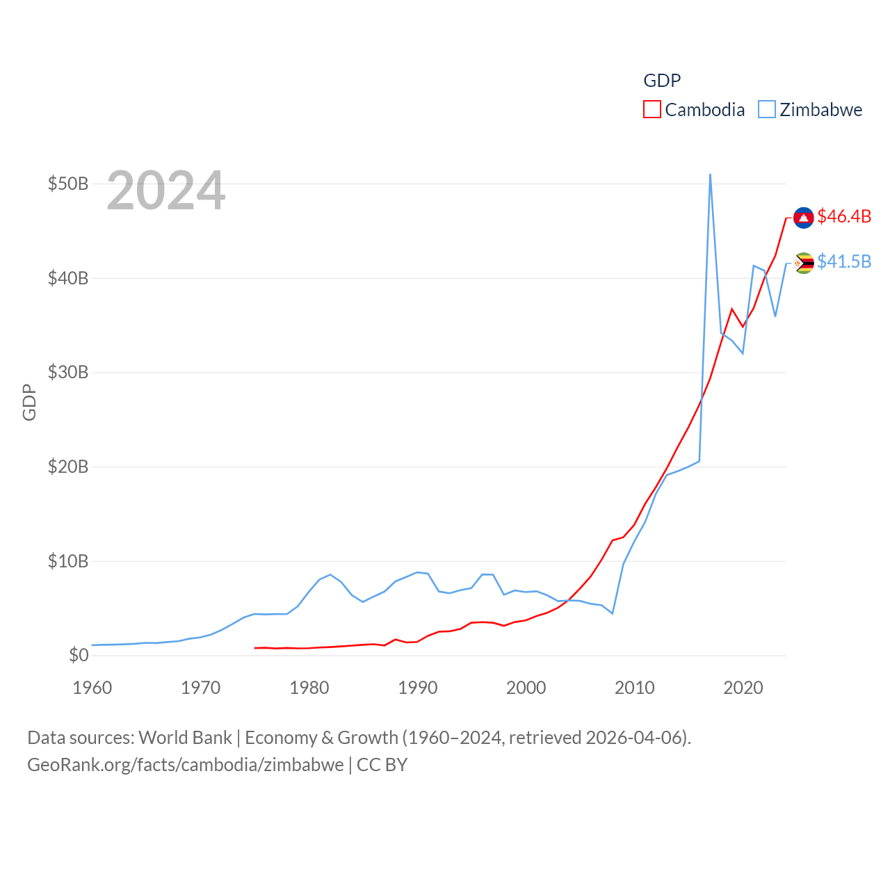 By GDP, Cambodia ranks 97/197 ($46.4B) and Zimbabwe ranks 102/197 ($41.5B). By GDP per capita, Cambodia ranks 145/197 ($2,628), while Zimbabwe ranks 148/197 ($2,497).