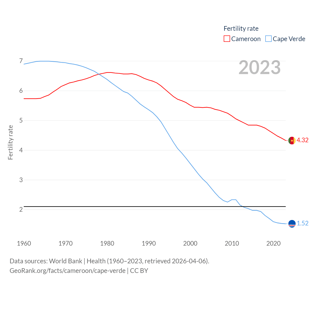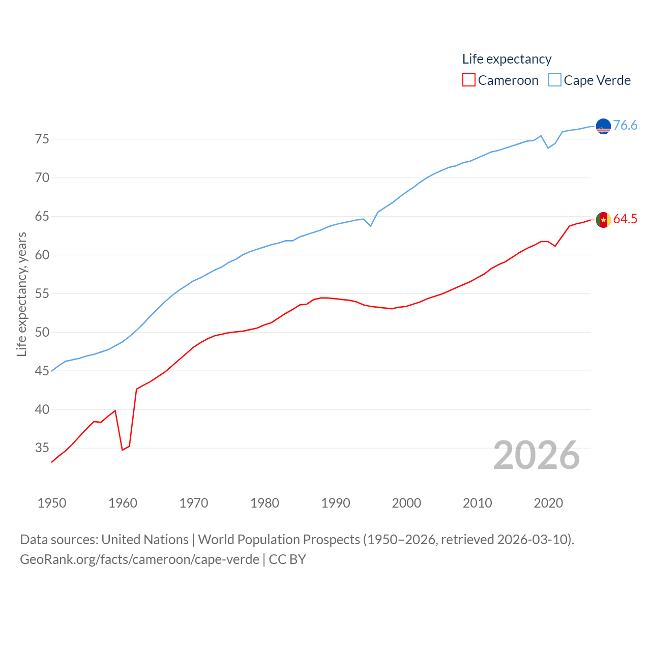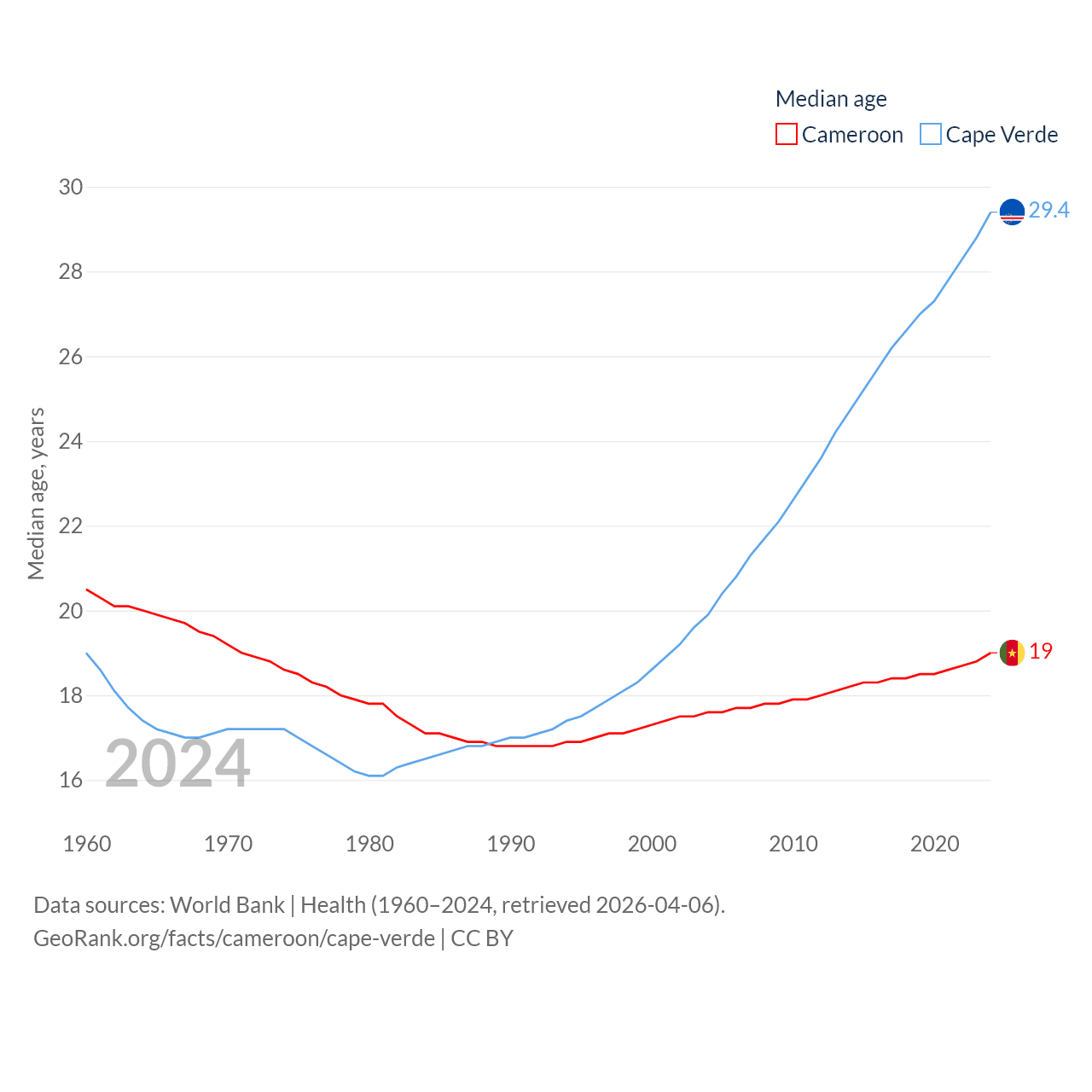 Cameroon has a population of 29.1M (ranked 52/197), compared with 525K in Cape Verde (ranked 169/197). Cameroon's land area is 182,514 sq mi versus 1,556 sq mi for Cape Verde (ranked 52nd vs. 167th).