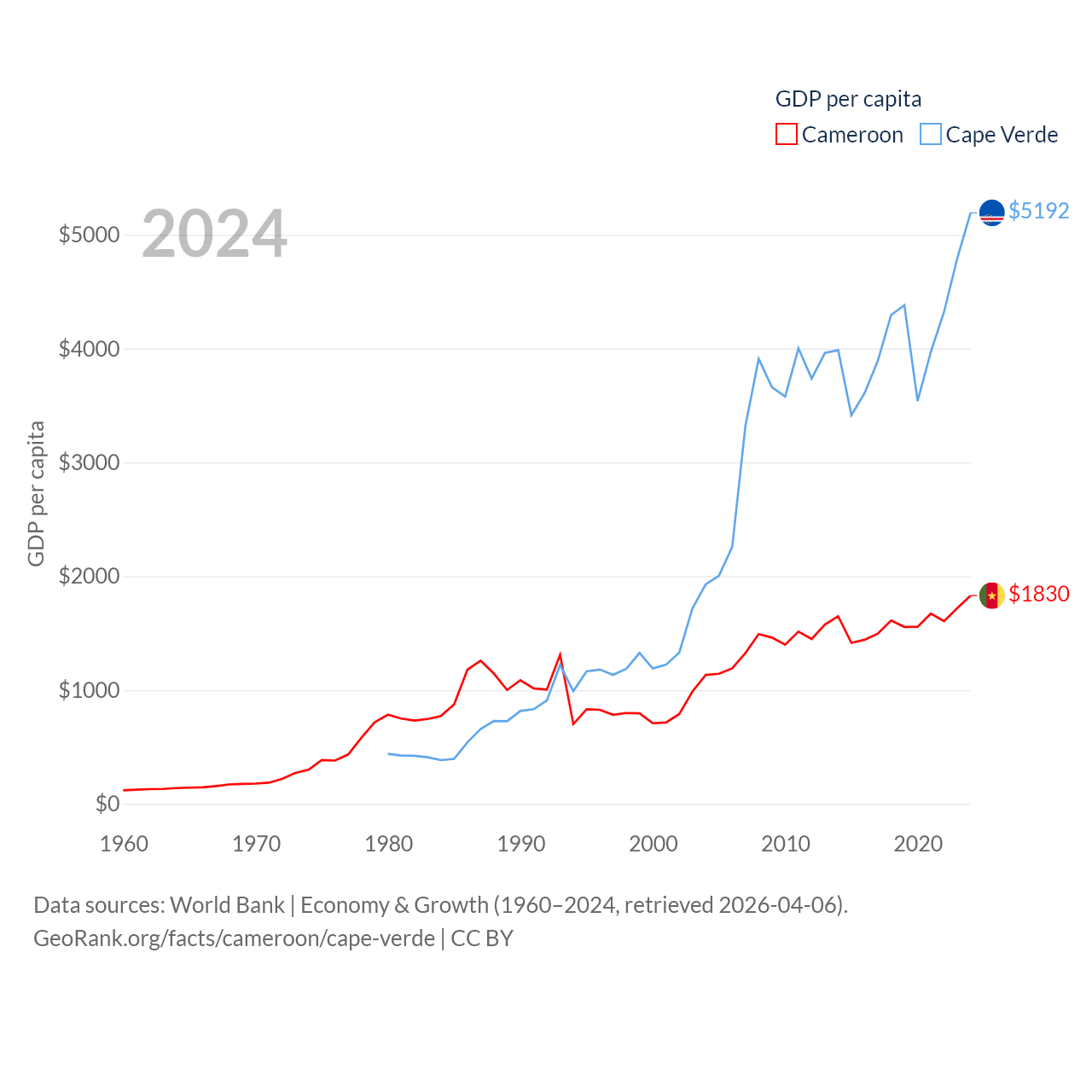 By GDP, Cameroon ranks 91/197 ($53.3B) and Cape Verde ranks 172/197 ($2.73B). By GDP per capita, Cameroon ranks 158/197 ($1,830), while Cape Verde ranks 118/197 ($5,192).