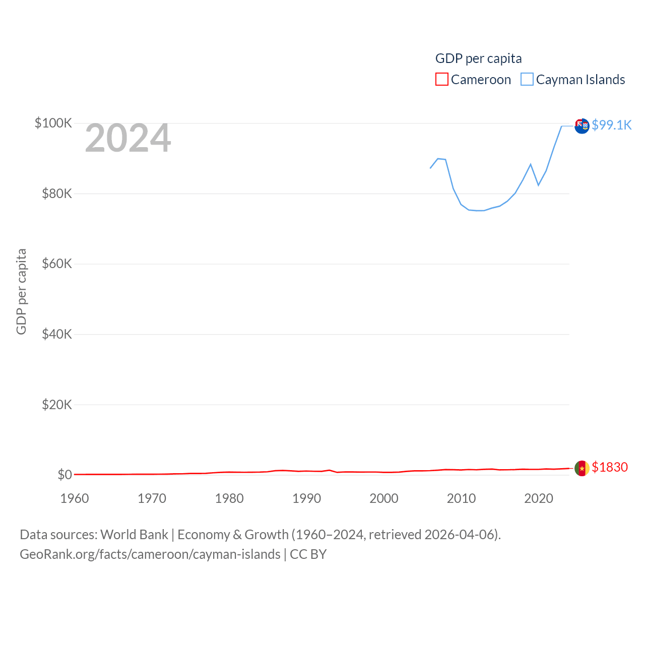 By GDP, Cameroon ranks 91/197 ($53.3B) and The Cayman Islands ranks 158/197 ($7.24B). By GDP per capita, Cameroon ranks 158/197 ($1,830), while The Cayman Islands ranks 6/197 ($99,144).