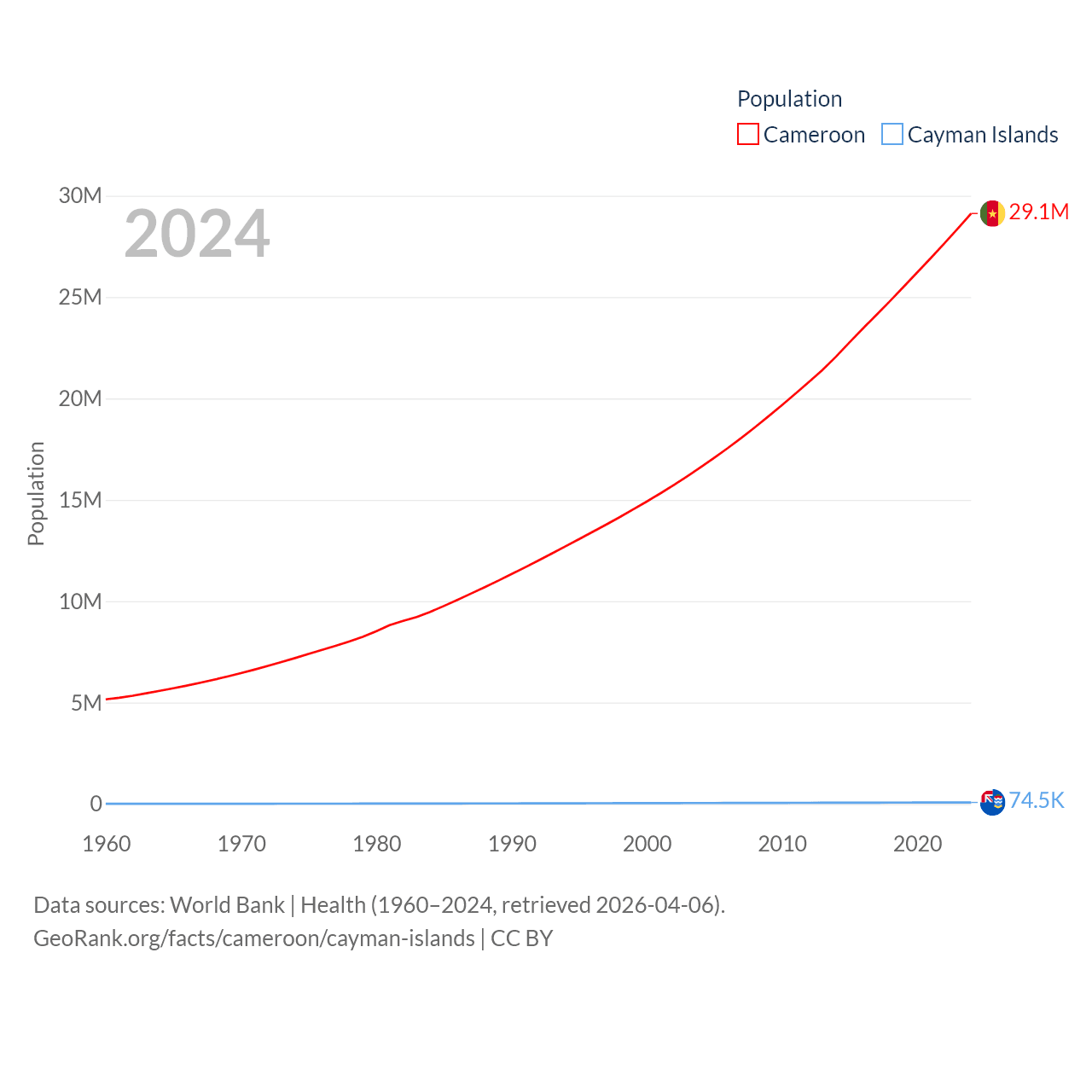 Cameroon has a population of 29.1M (ranked 52/197), compared with 74.5K in The Cayman Islands (ranked 187/197). Cameroon's land area is 182,514 sq mi versus 92.7 sq mi for The Cayman Islands (ranked 52nd vs. 190th).