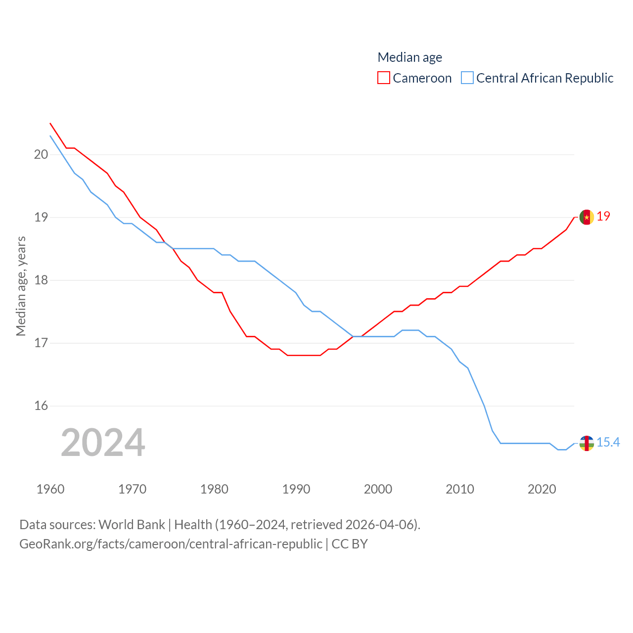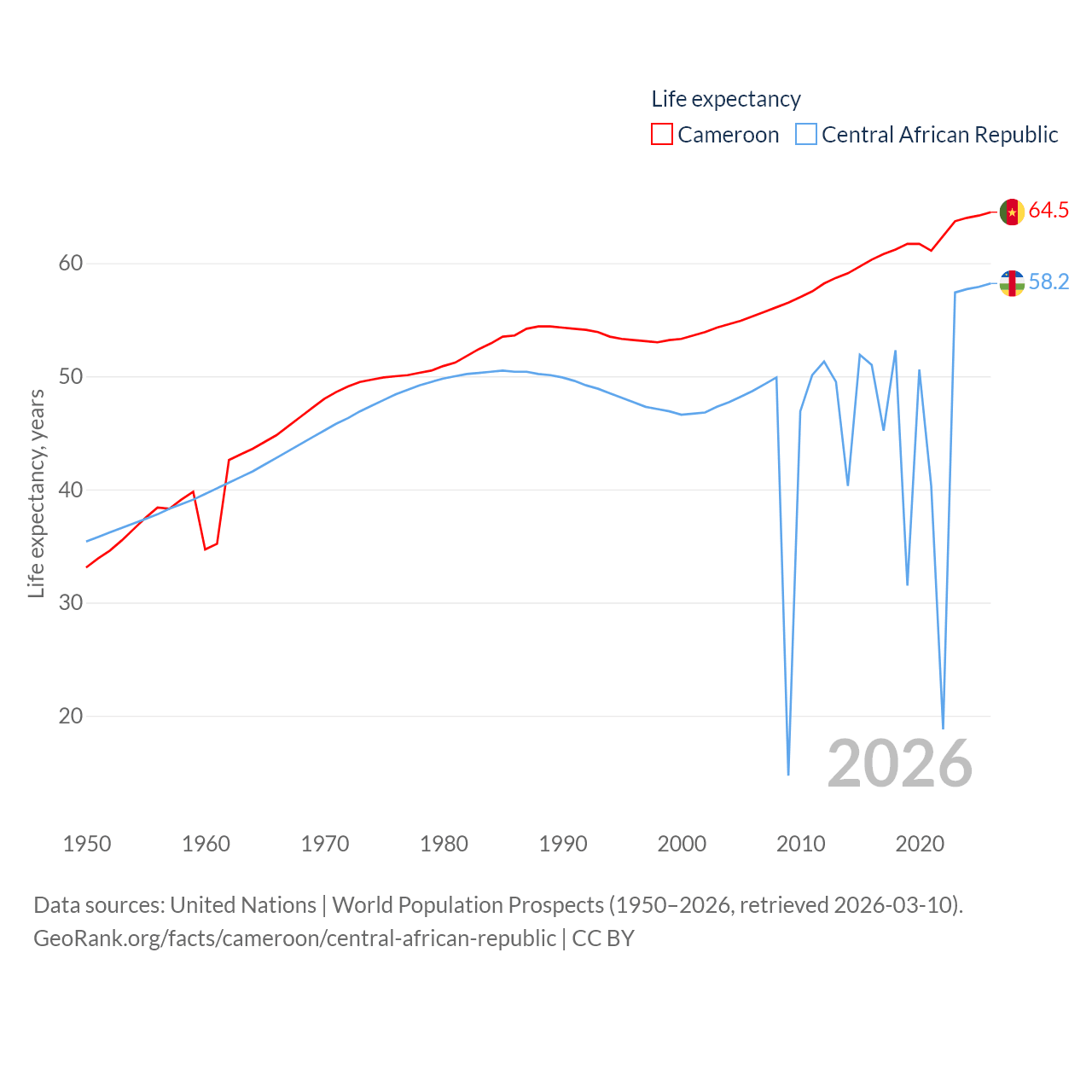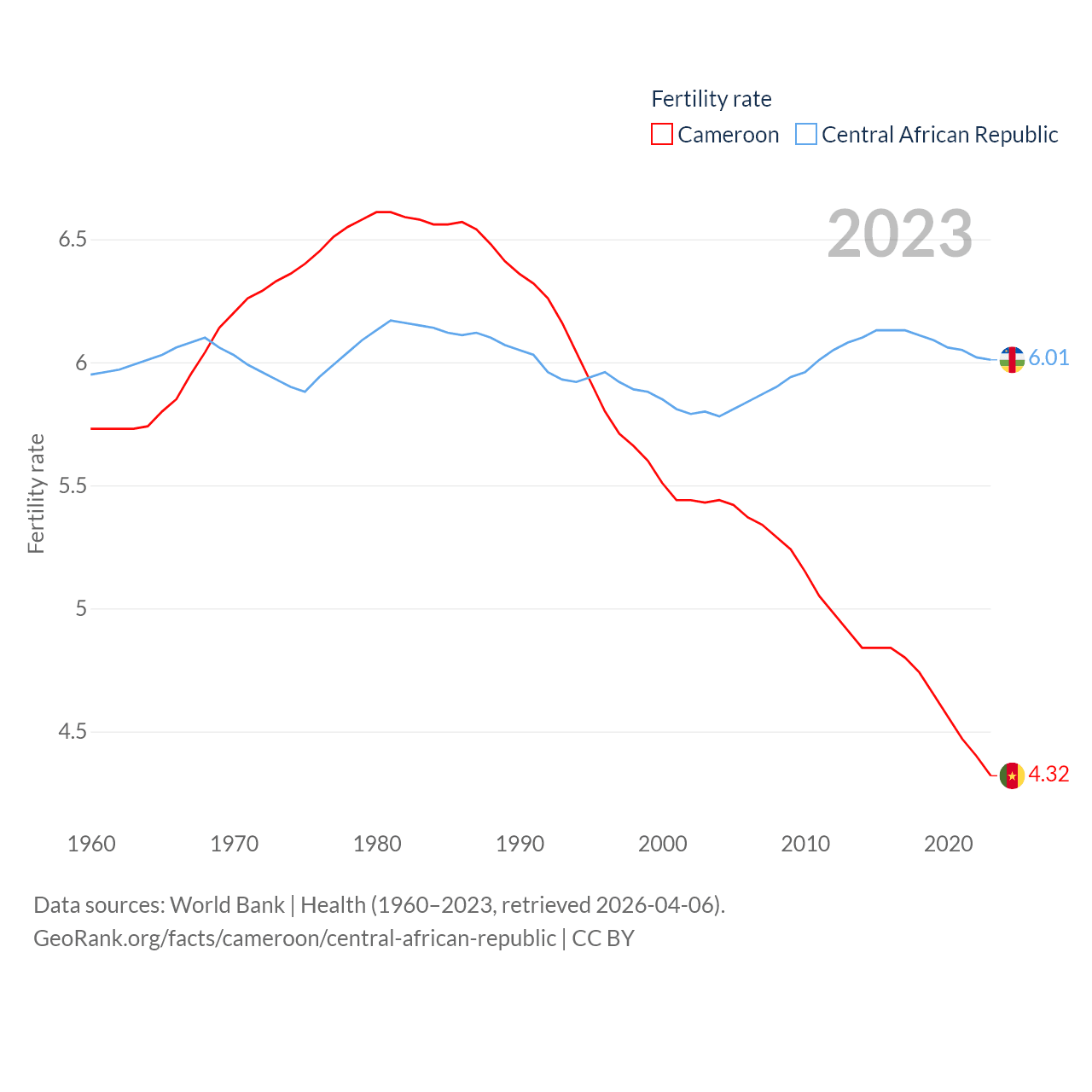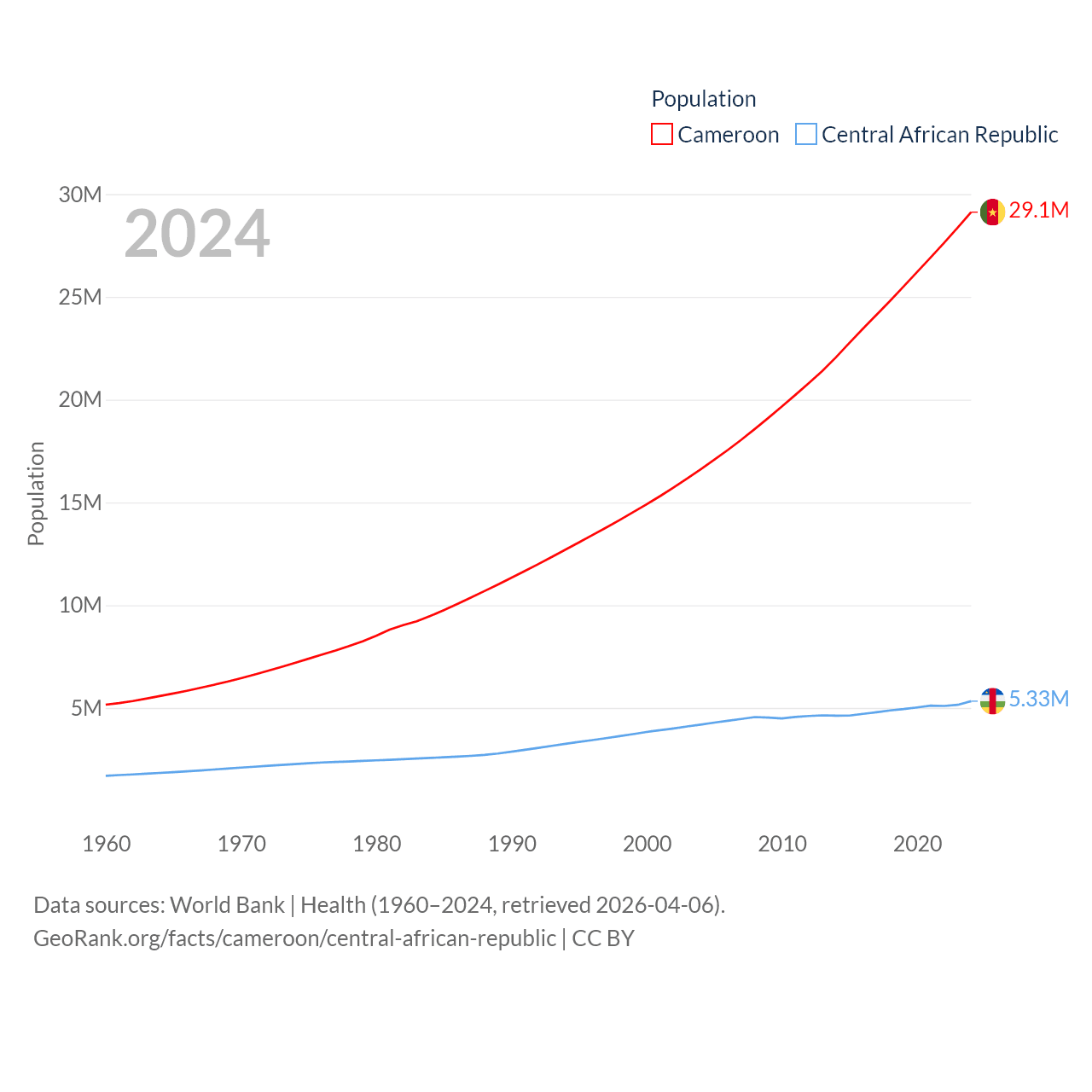 Cameroon has a population of 29.1M (ranked 52/197), compared with 5.33M in The Central African Republic (ranked 121/197). Cameroon's land area is 182,514 sq mi versus 240,534 sq mi for The Central African Republic (ranked 52nd vs. 43rd).