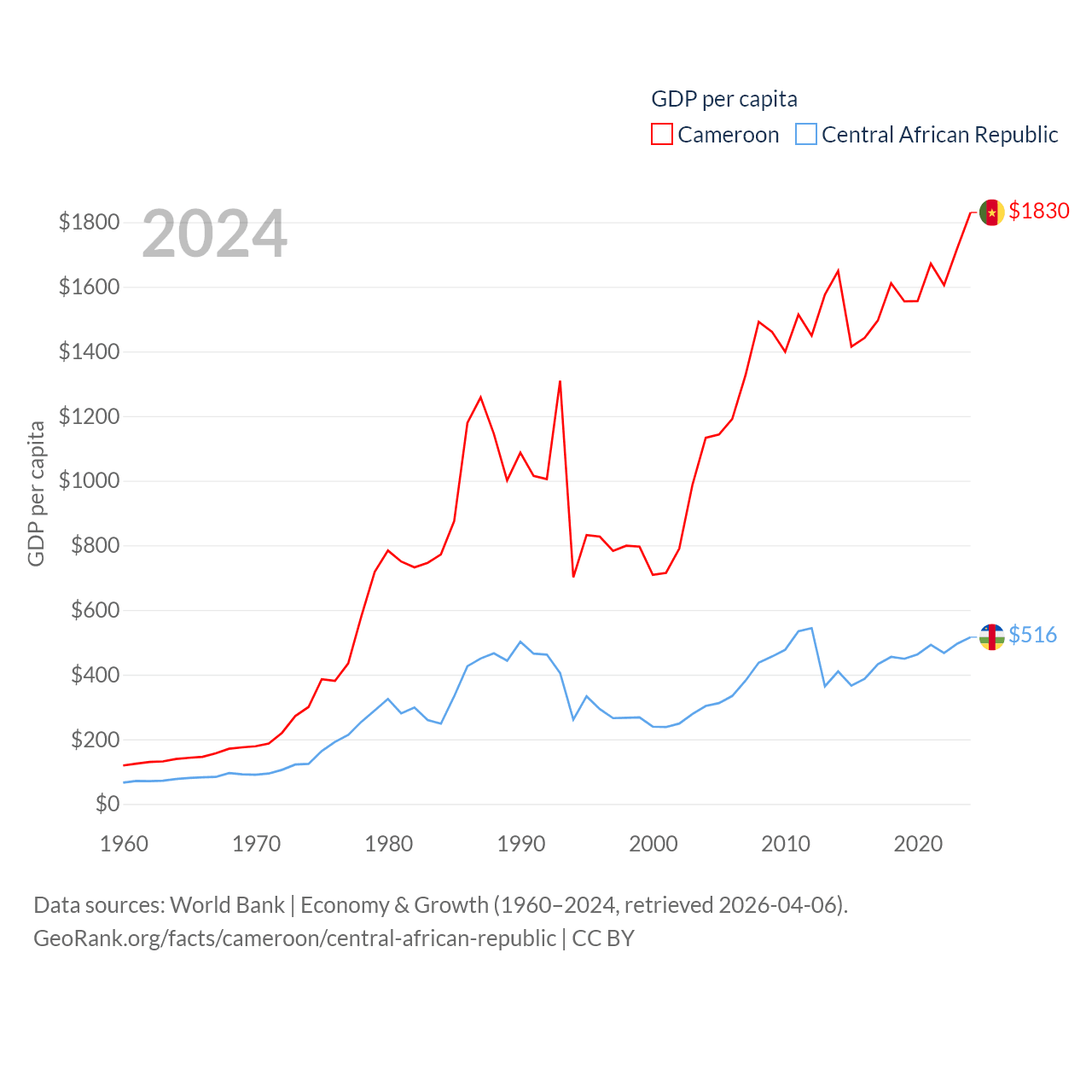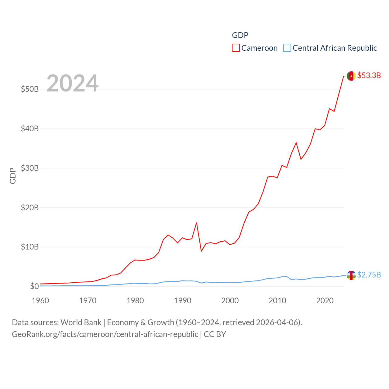 By GDP, Cameroon ranks 91/197 ($53.3B) and The Central African Republic ranks 171/197 ($2.75B). By GDP per capita, Cameroon ranks 158/197 ($1,830), while The Central African Republic ranks 195/197 ($516).