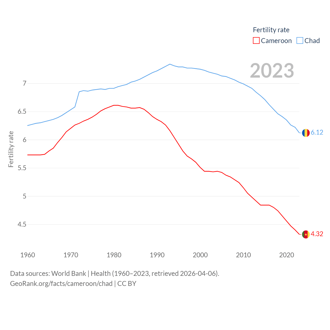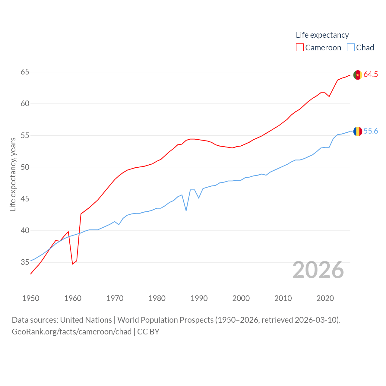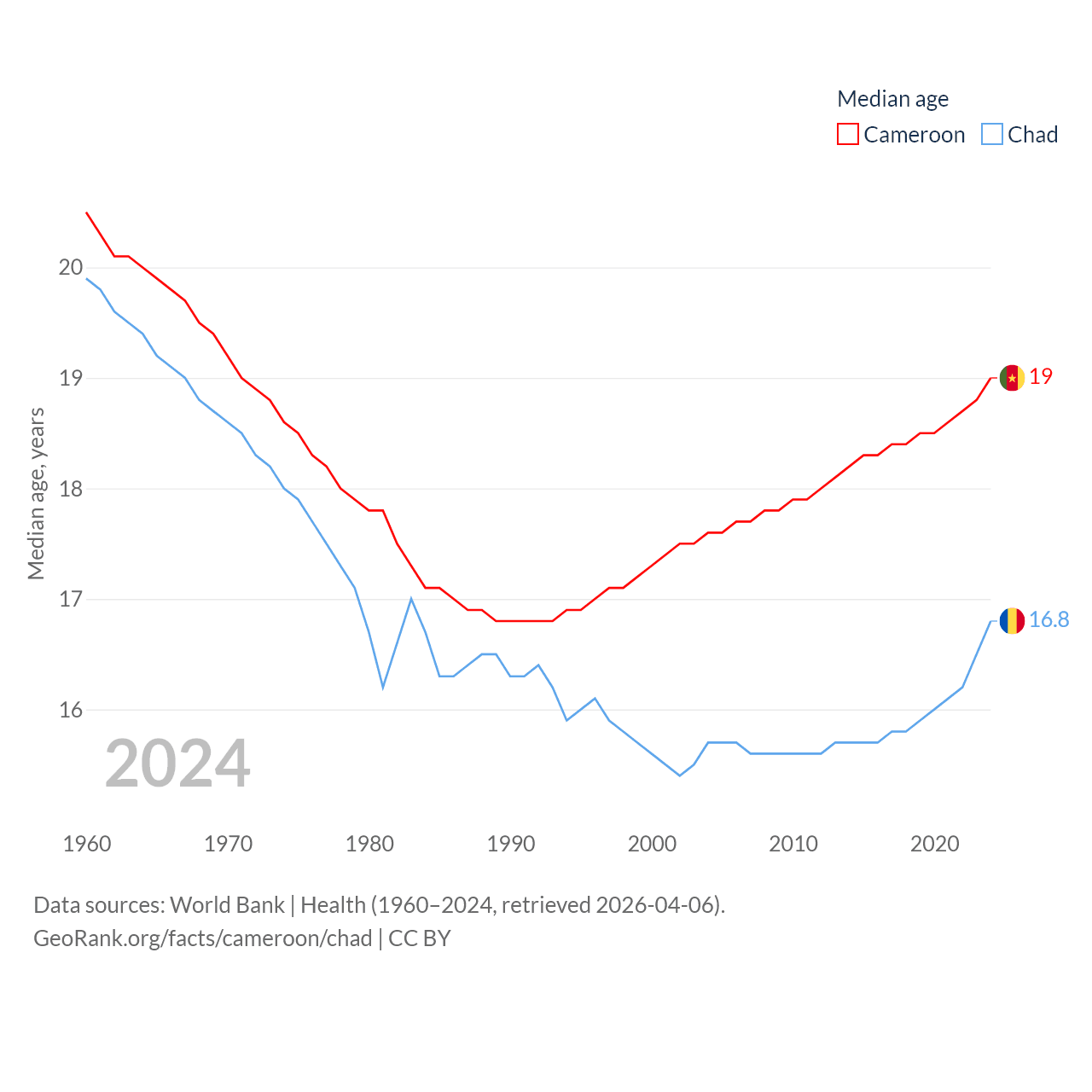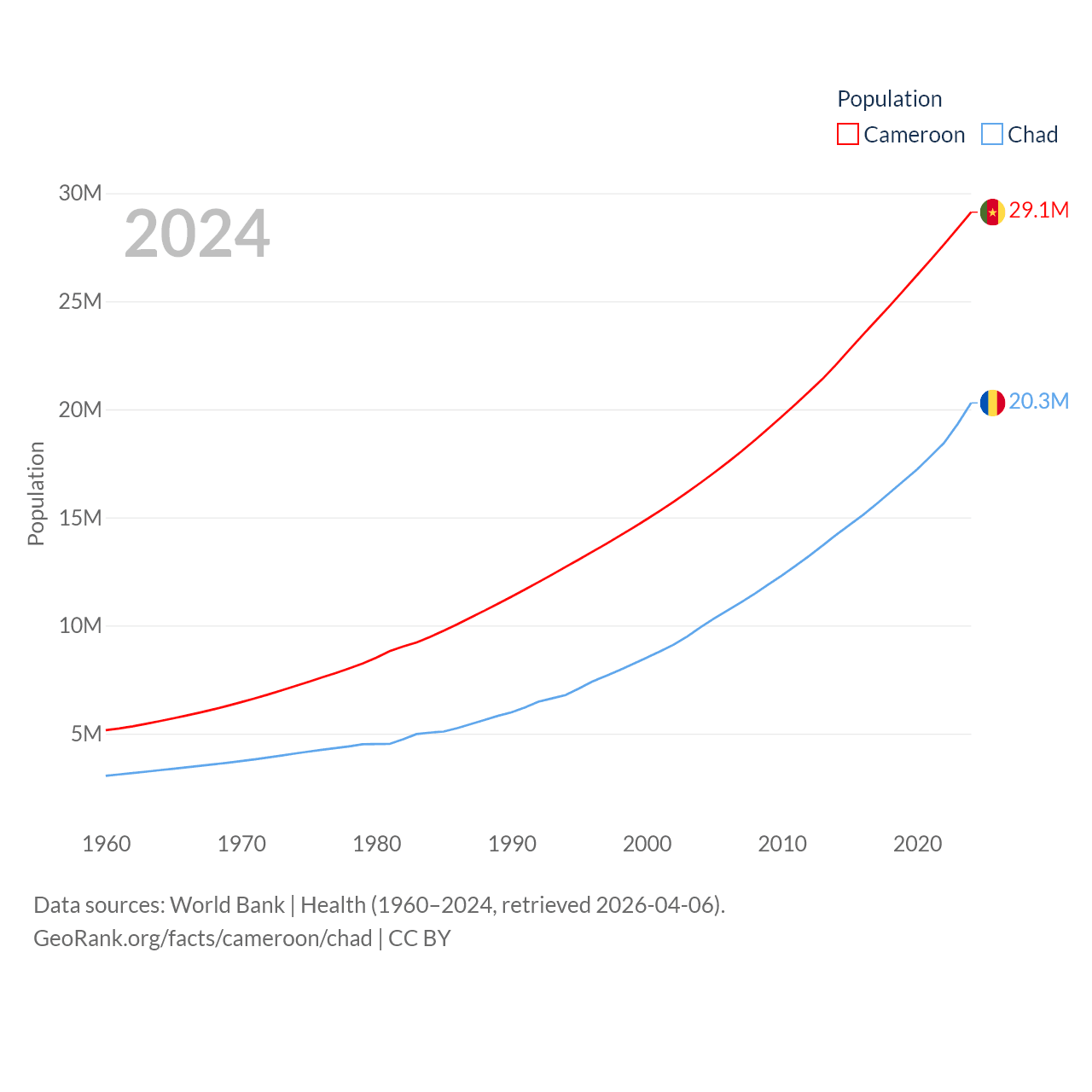 Cameroon has a population of 29.1M (ranked 52/197), compared with 20.3M in Chad (ranked 65/197). Cameroon's land area is 182,514 sq mi versus 486,180 sq mi for Chad (ranked 52nd vs. 21st).