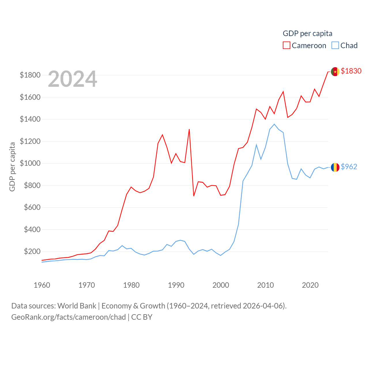 By GDP, Cameroon ranks 91/197 ($53.3B) and Chad ranks 132/197 ($19.5B). By GDP per capita, Cameroon ranks 158/197 ($1,830), while Chad ranks 182/197 ($962).