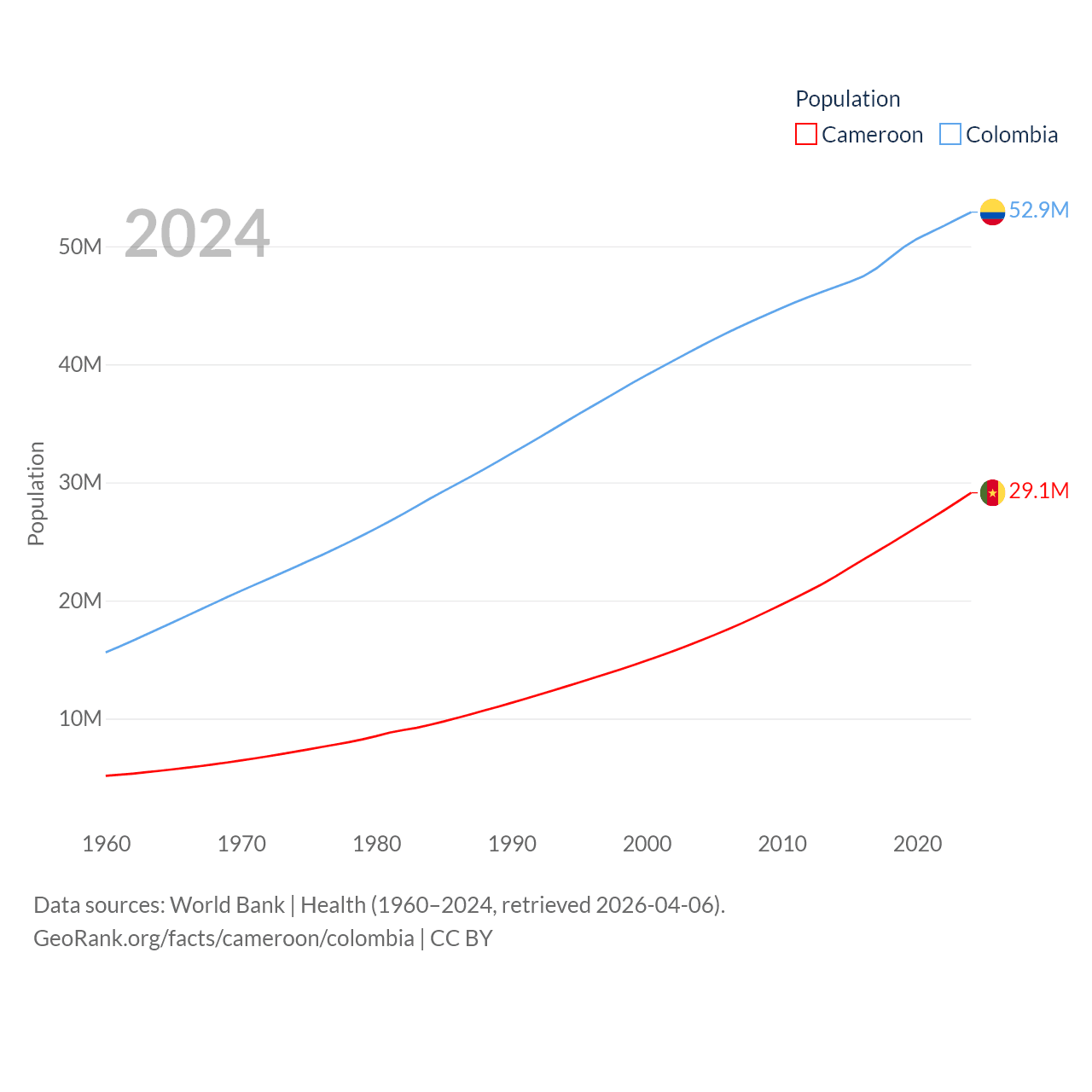 Cameroon has a population of 29.1M (ranked 52/197), compared with 52.9M in Colombia (ranked 28/197). Cameroon's land area is 182,514 sq mi versus 428,380 sq mi for Colombia (ranked 52nd vs. 26th).