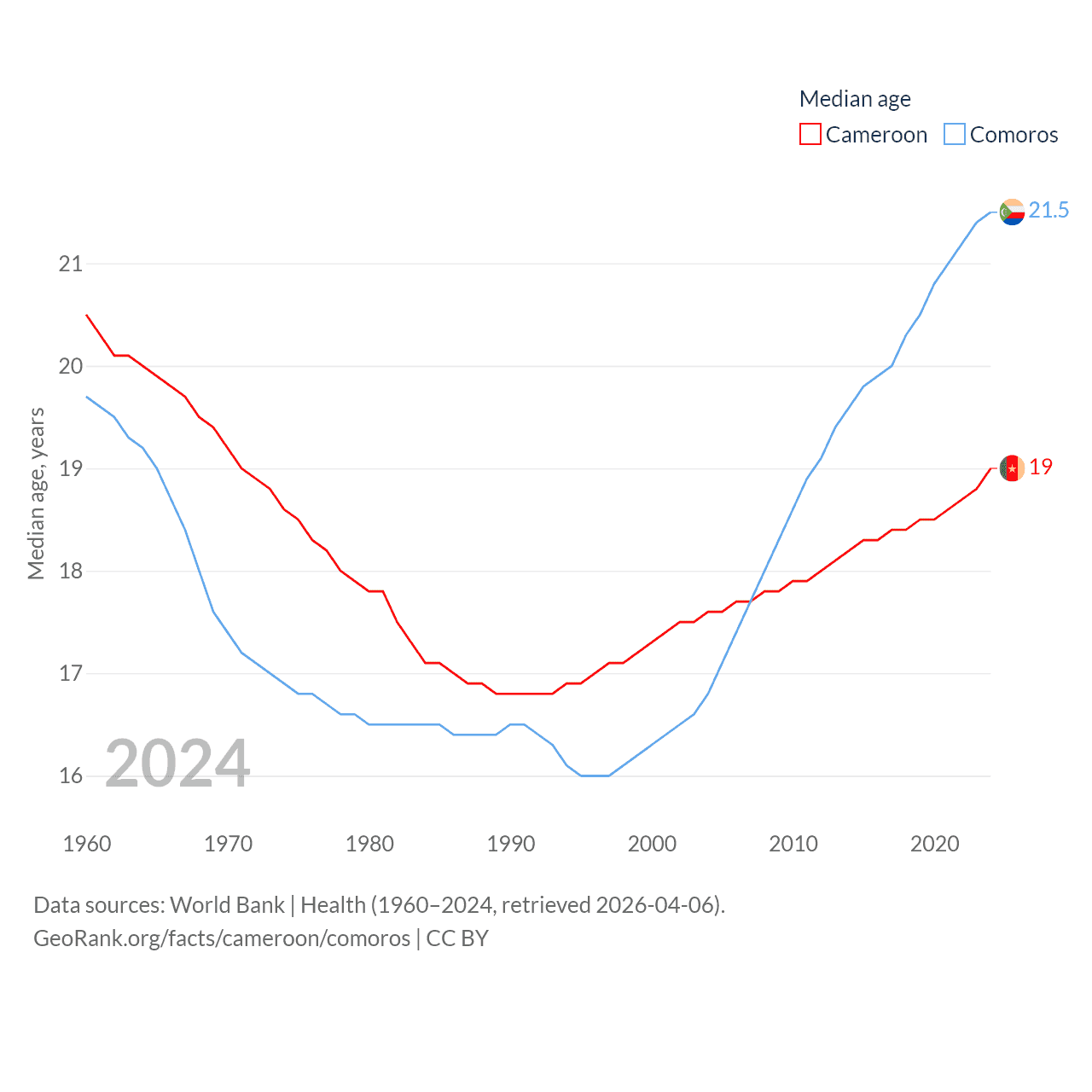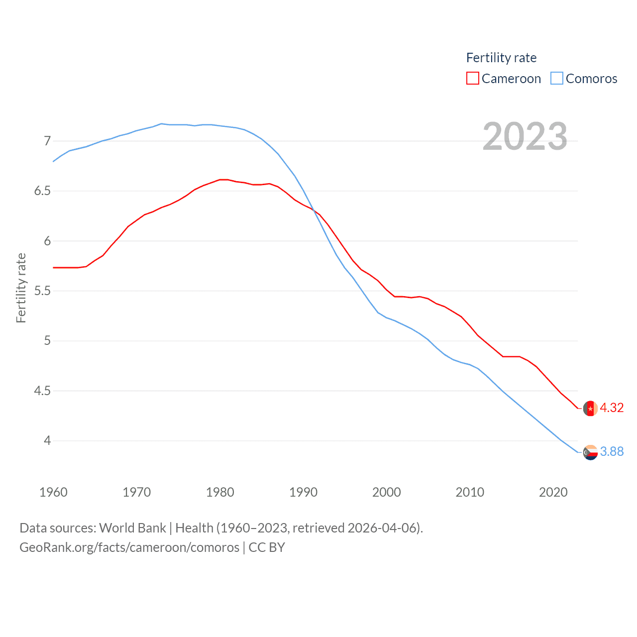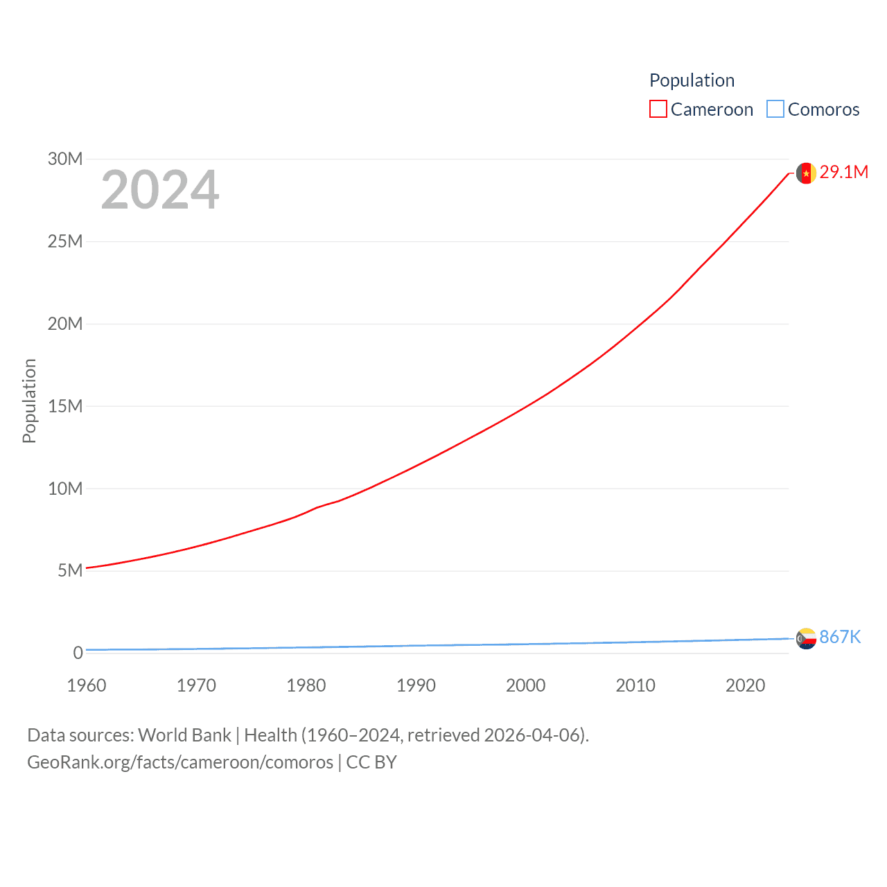 Cameroon has a population of 29.1M (ranked 52/197), compared with 867K in Comoros (ranked 160/197). Cameroon's land area is 182,514 sq mi versus 719 sq mi for Comoros (ranked 52nd vs. 171st).