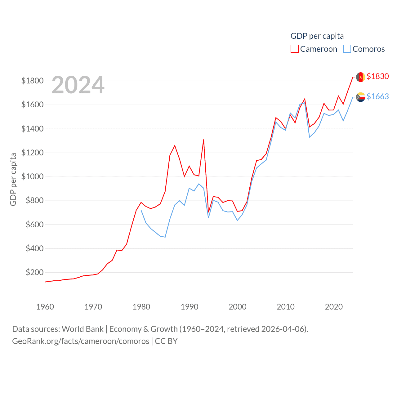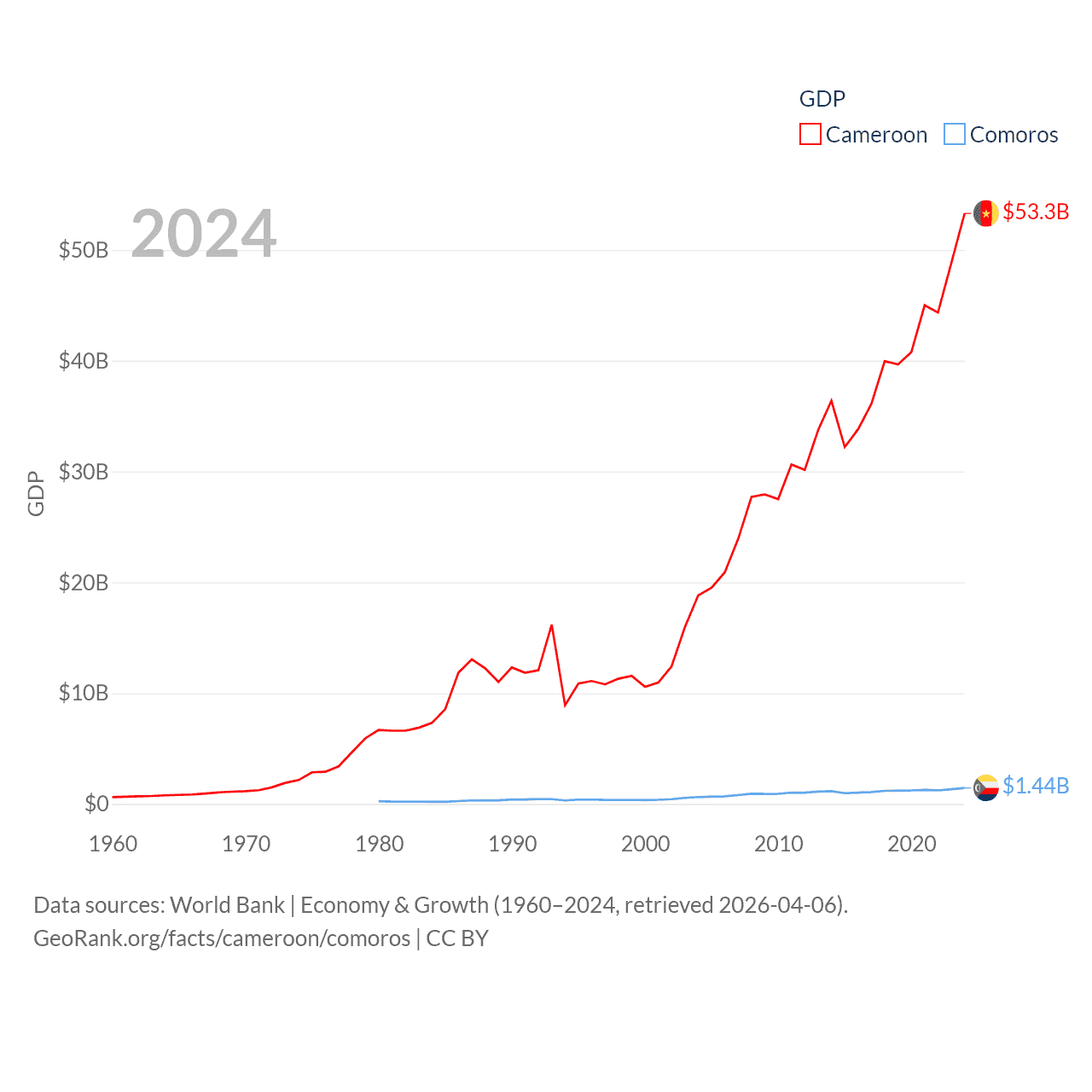 By GDP, Cameroon ranks 91/197 ($53.3B) and Comoros ranks 183/197 ($1.44B). By GDP per capita, Cameroon ranks 158/197 ($1,830), while Comoros ranks 161/197 ($1,663).