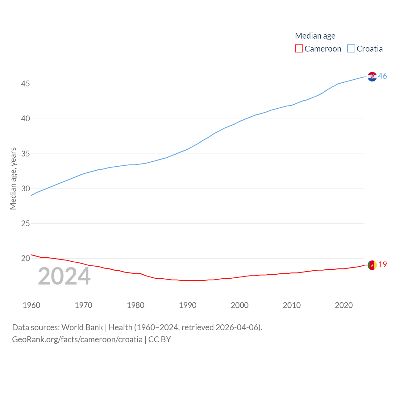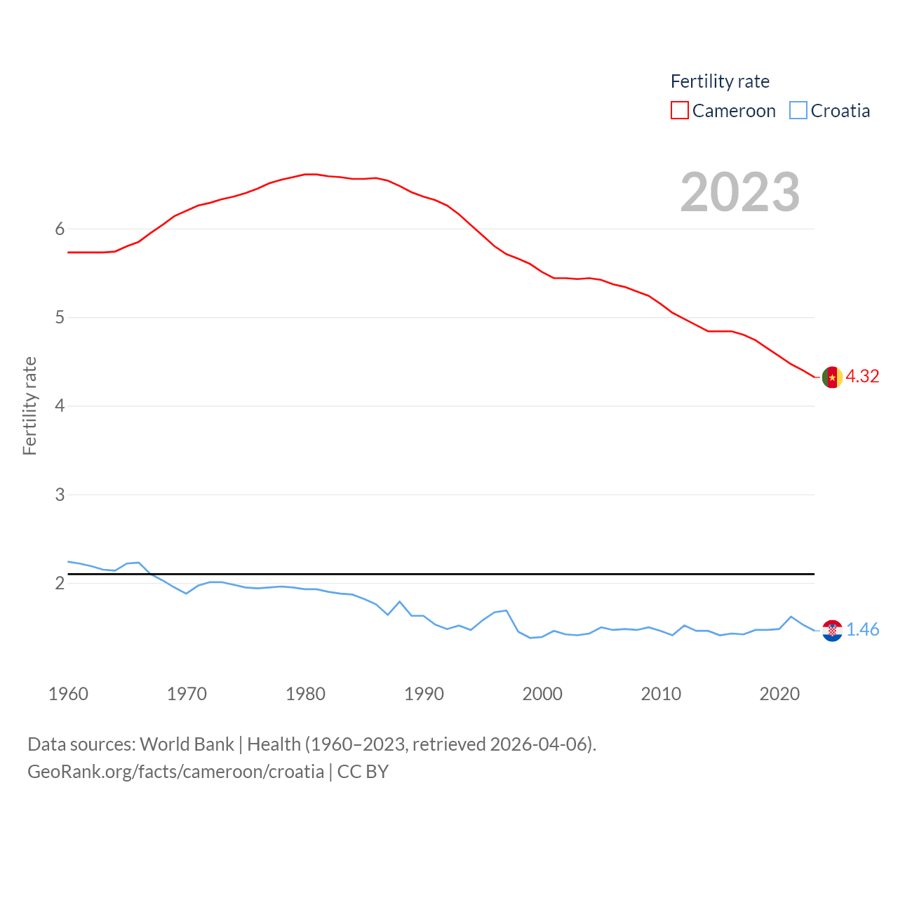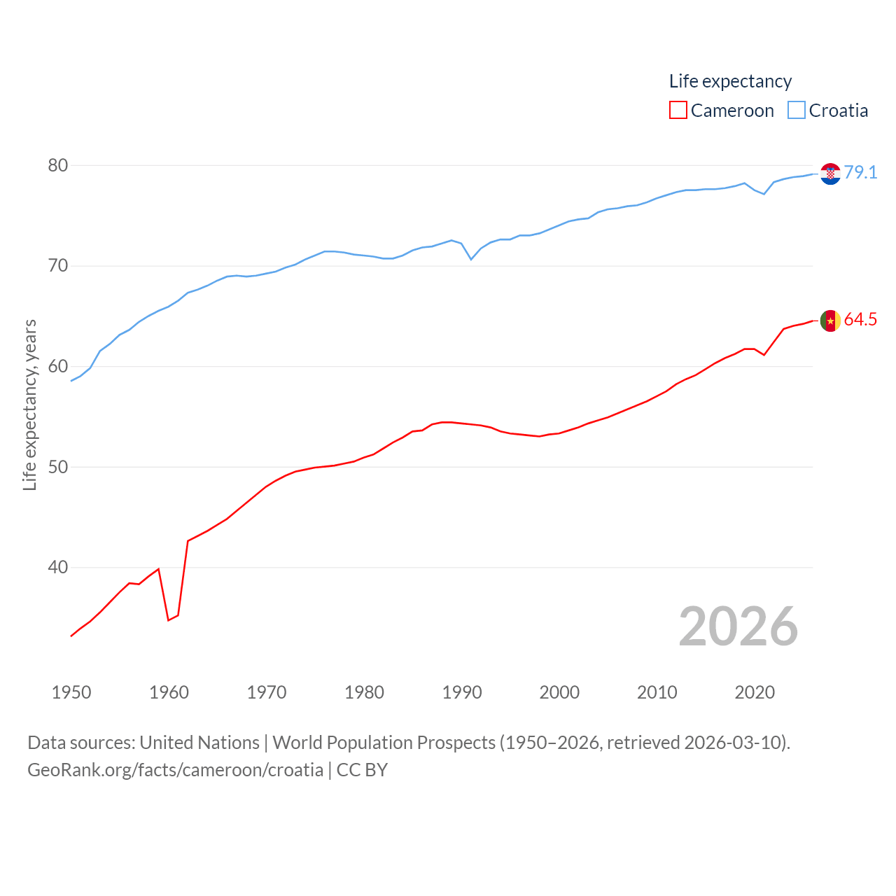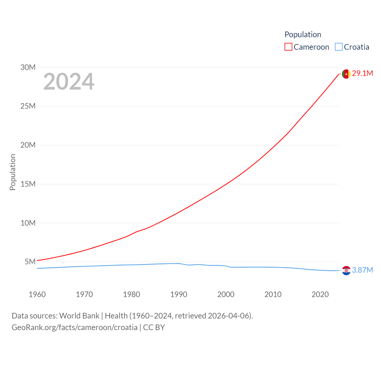 Cameroon has a population of 29.1M (ranked 52/197), compared with 3.87M in Croatia (ranked 129/197). Cameroon's land area is 182,514 sq mi versus 21,606 sq mi for Croatia (ranked 52nd vs. 123rd).