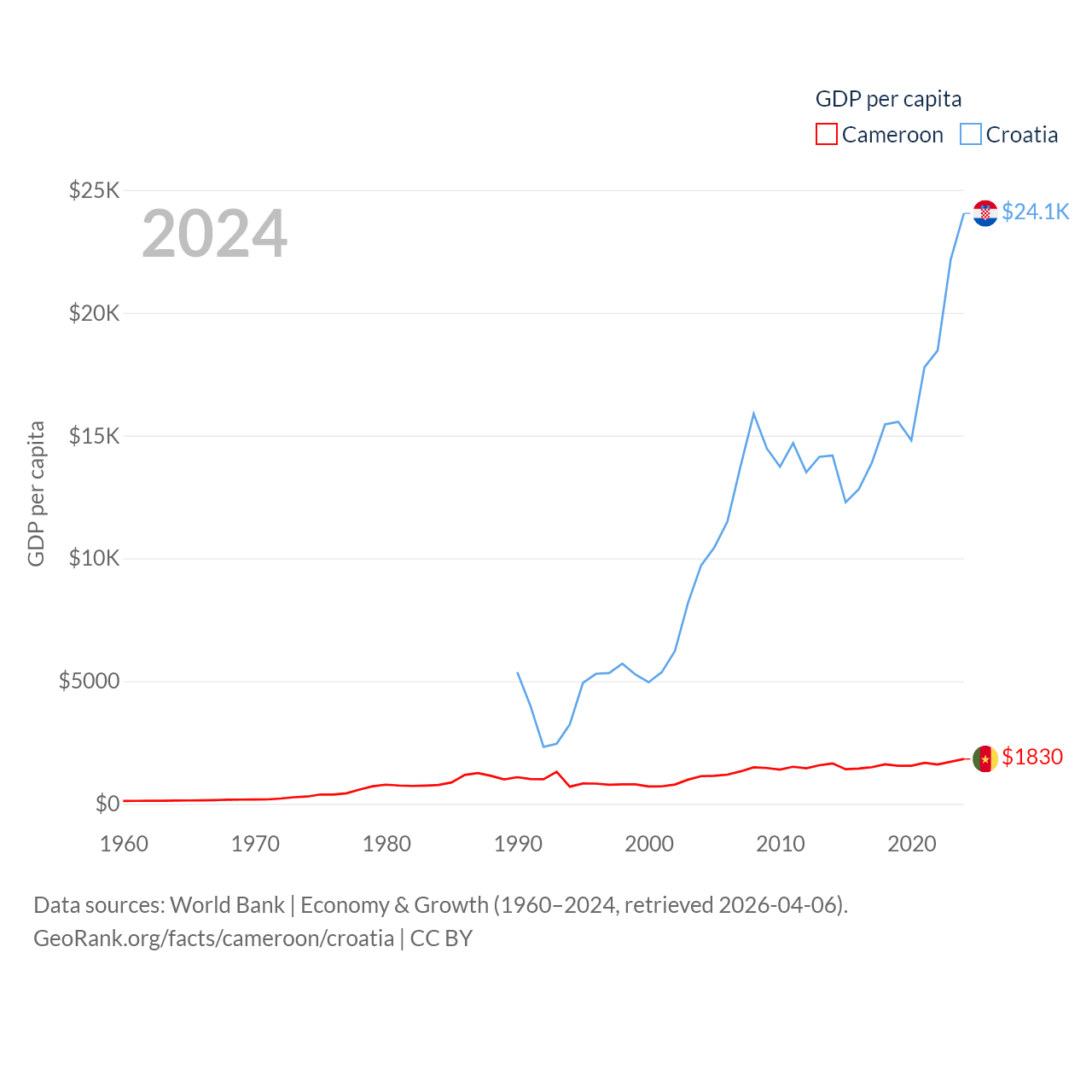 By GDP, Cameroon ranks 91/197 ($53.3B) and Croatia ranks 75/197 ($93B). By GDP per capita, Cameroon ranks 158/197 ($1,830), while Croatia ranks 50/197 ($24,050).