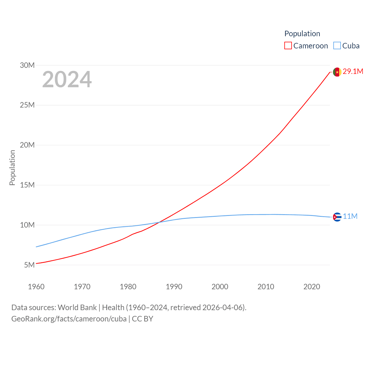 Cameroon has a population of 29.1M (ranked 52/197), compared with 11M in Cuba (ranked 87/197). Cameroon's land area is 182,514 sq mi versus 40,077 sq mi for Cuba (ranked 52nd vs. 103rd).