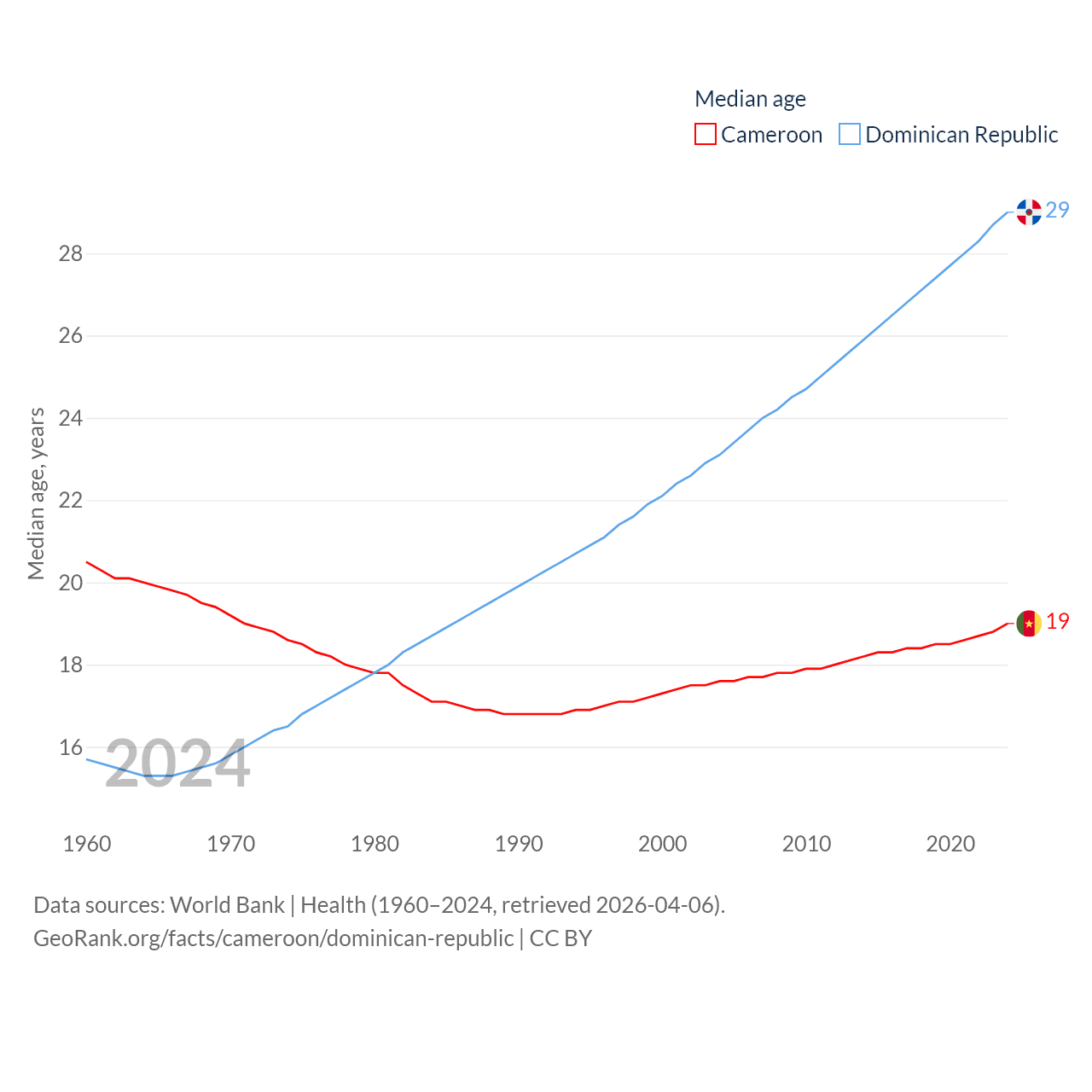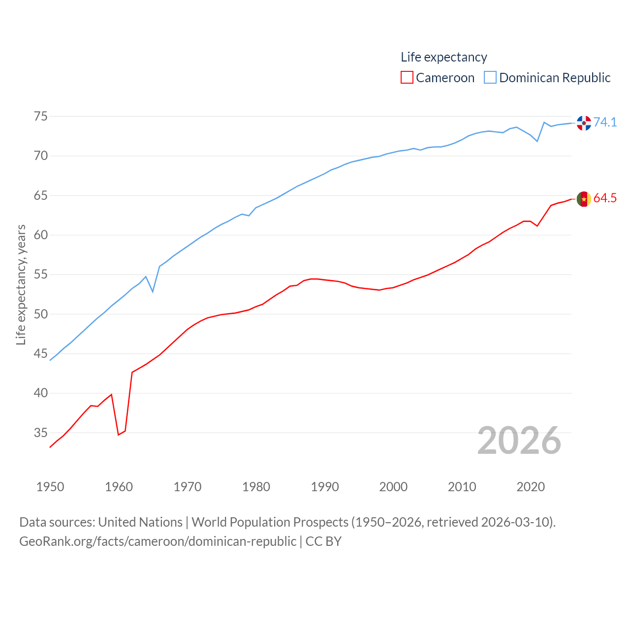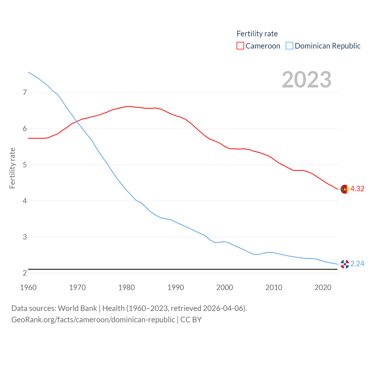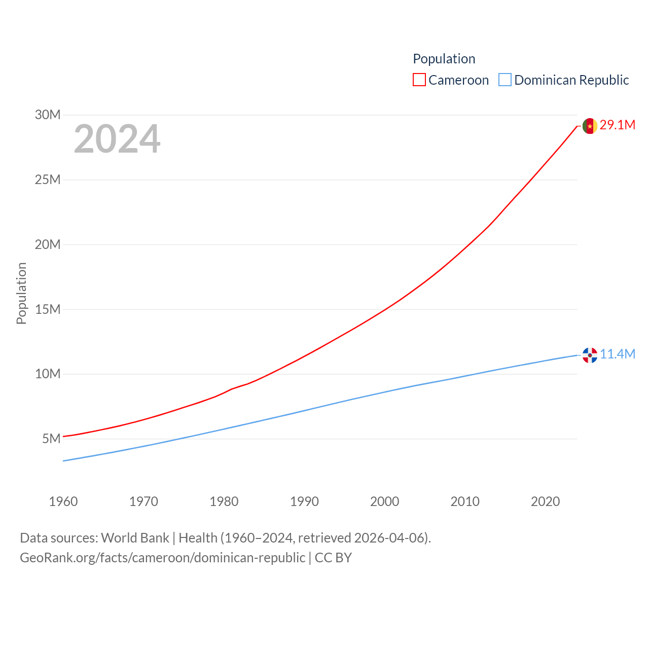 Cameroon has a population of 29.1M (ranked 52/197), compared with 11.4M in The Dominican Republic (ranked 85/197). Cameroon's land area is 182,514 sq mi versus 18,609 sq mi for The Dominican Republic (ranked 52nd vs. 127th).